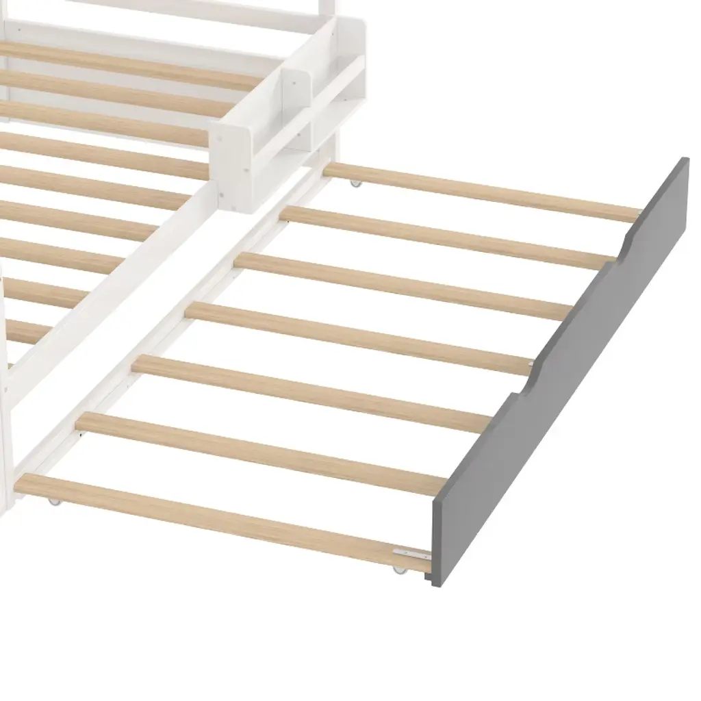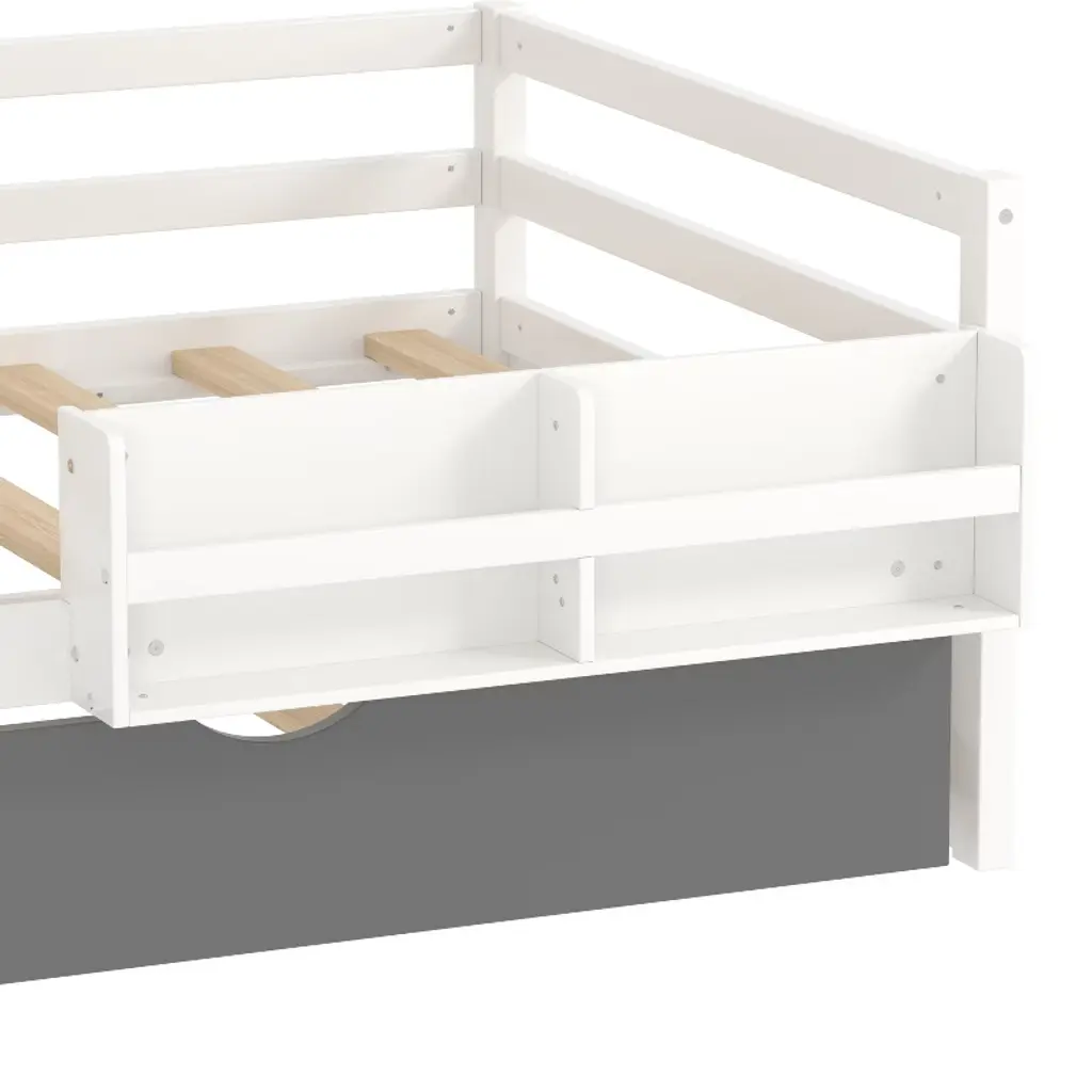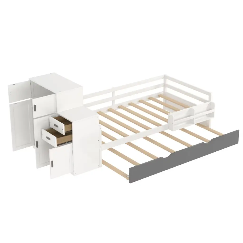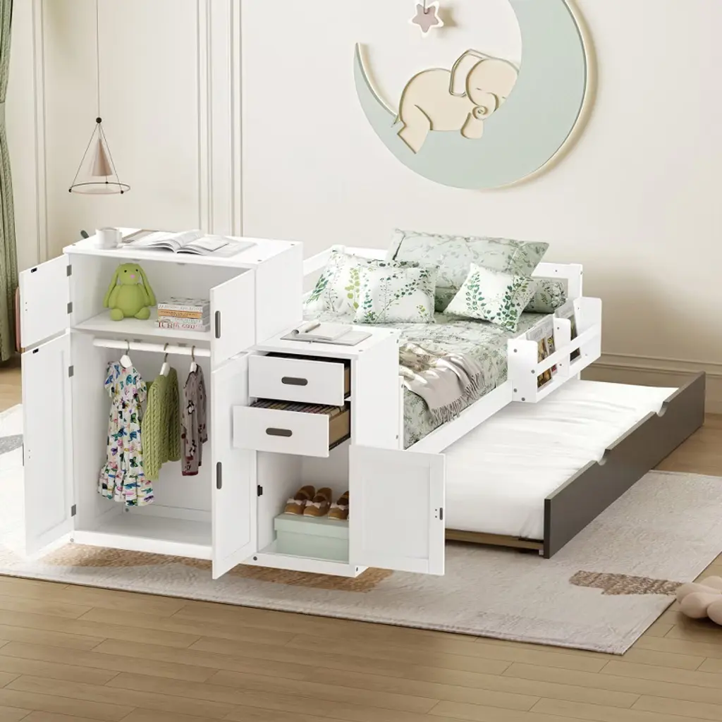 Ktmbdw Twin Size Bed With Trundle, Wood Daybed With Storage Drawers And Wardrobe, Twin Trundle Bed For Kids, No Box Spring Needed, White & Gray