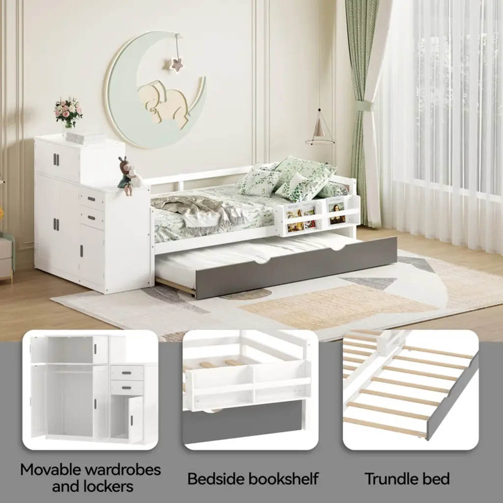 This versatile twin-size wood platform bed is designed for functionality and style. The built-in bookshelf offers convenient storage for books, while the movable wardrobe provides flexible storage space for clothing or accessories.Perfect for maximizing space, the bed includes a pull-out trundle, ideal for accommodating overnight guests or creating a cozy sleeping solution for siblings. Its multifunctional design makes it an excellent choice for kids, teens, or compact living spaces, combining practicality with timeless charm.