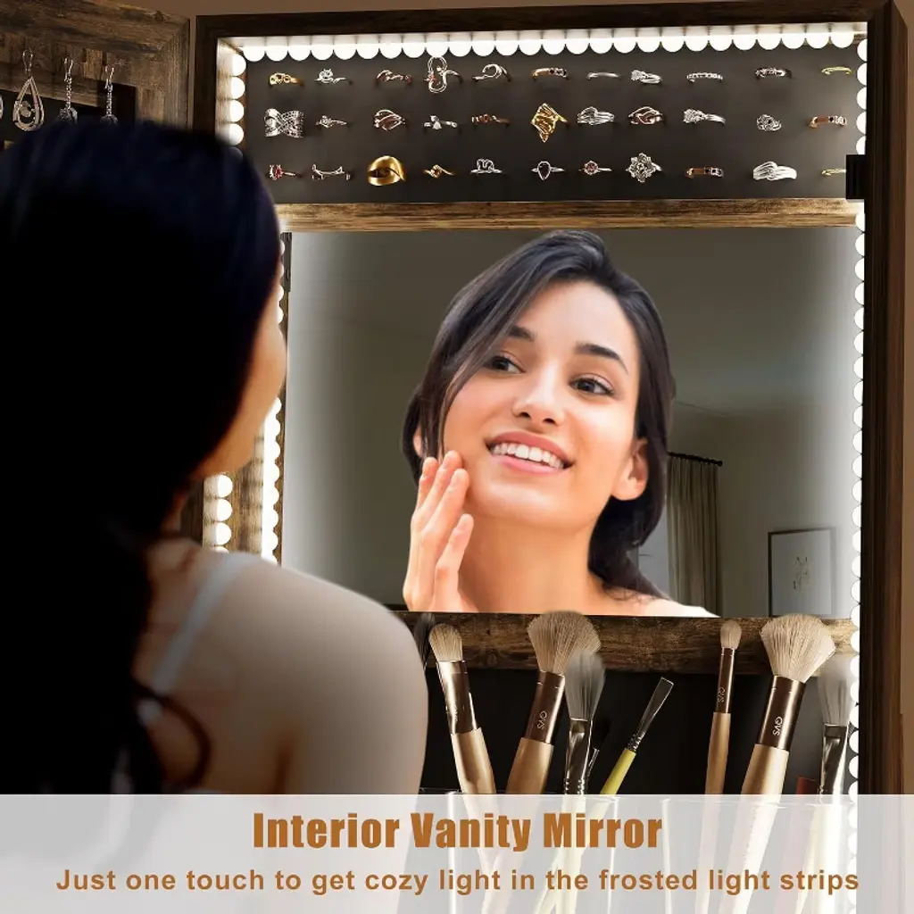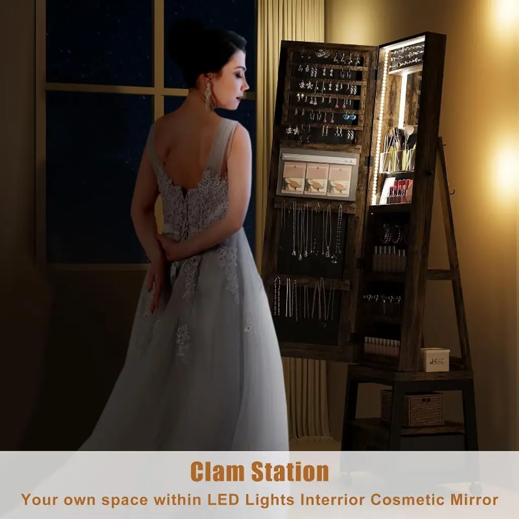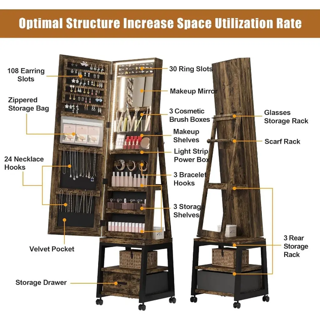 This jewelry armoire offers abundant storage space with earring slots, ring holders, necklace hooks, 4 makeup holders and 3 bracelet hooks to keep all your accessories organized and within reach, ensuring a neat and clutter-free space. Equipped with a 360° swivel base to access items from any angle, the full body mirror lets you check your overall outfit and swivel wheels make it easy to move around the room. Built-in locks keep valuables safe and especially protected from children, velvet lining protects jewelry from scratches, and bottom shelves and drawers provide quick access to everyday essentials. Combining a jewelry armoire, full-length mirror, built-in makeup mirror, and storage shelves, this 4-in-1 cabinet's compact design efficiently meets all storage and styling needs, making it a stylish and versatile piece of furniture. Pre-assembled with clear instructions for easy and stress-free installation, the cabinet is constructed with high-quality MDF material to ensure long-lasting durability while keeping your accessories neat and beautiful. Whether it's the functional design or the aesthetic presentation, this jewelry cabinet offers you both efficiency and flexibility, making it ideal for everyday life.