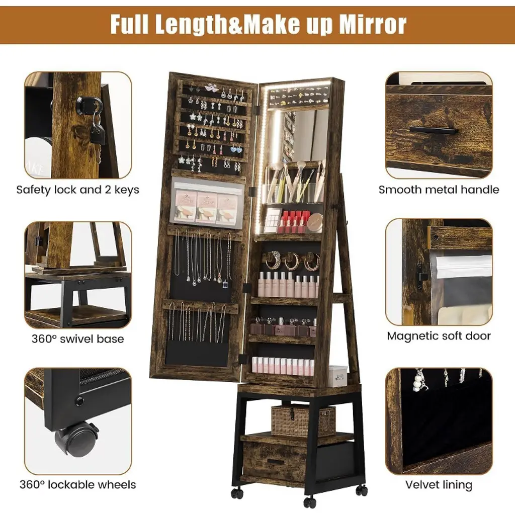 Led Mirror Jewelry Armoire, 360° Swivel, Vertical Jewelry Organizer With Lockable Lockers, Drawers, Mobility Wheels, Foldable Makeup Shelf, Brown