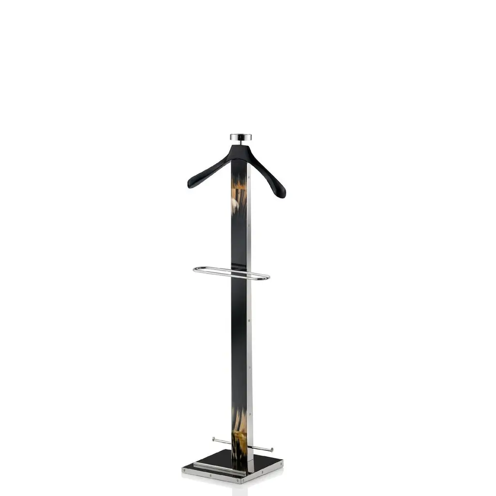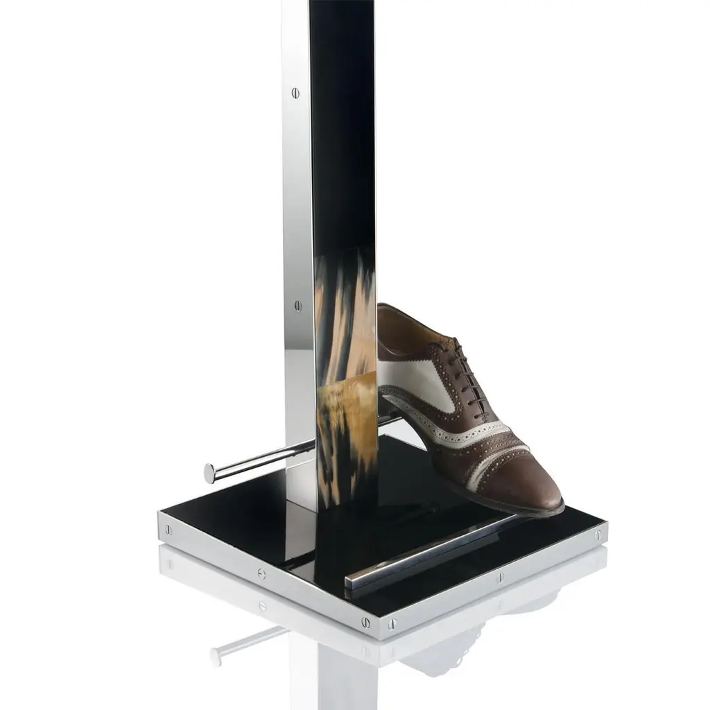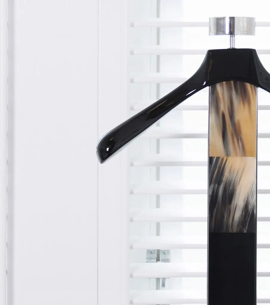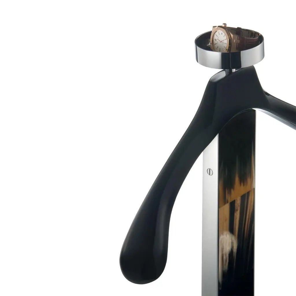 Levanzo Wardrobe Valet by ArcahornDimensions: D 30 x W 46 x H 142 cmMaterials: Horn, leather, stainless steel, wood.Wardrobe valet. Structure in wood with lacquered black gloss finish and dark horn inlays. Stainless steel edging with exposed screws. Stainless steel shoe rack and trouser bar. Catch-all tray in stainless steel lined with black saffiano leather.Colors and shades of horn processed by Arcahorn are unique due to the natural origin of raw material.For this reason, horn tones that can be seen in pictures are indicative and can not be reproduced in finished products.In 1958 Mario Guerra, a young artisan fascinated by natural materials and intricate craftsmanship, decided to set up a workshop in Recanati, a small italian town rich in culture and ancient traditions. Thus was born A.R.C.A. Artigiana Recanatese Corno e Affini, a company specialized in the processing of Zebu horn which is molded into unique pieces.The first creations included an extensive selection of cutlery, tableware, jewelry and personal care accessories. With just the hands and the help of fire and a few tools, horn is shaped into timeless objects and reveals its veins that are always different by nature. Horn shades are combined with other precious materials selected with obsessive care in order to obtain exclusive pieces that make our daily gestures unique.Over time, the founder conveyed his passion and know-how to his sons, Giorgio and Silvia. In the early 2000s, the company started collaborating with designers and embraced a new path, focused on the production of complementary furniture.In 2013, the company registered the trademark Arcahorn and mainly focused on the manufacturing of high-end furniture, while still remaining faithful to traditional craftsmanship. Each piece stands out for its impeccable quality and meticulous attention to detail and it’s conceived to enter the most elegant private residences, yachts, hotels and boutiques, also with bespoke solutions.OUR ETHICSOur vocation for craftsmanship is combined with the respect for the environment. We adopt low impact solutions and concentrate our production at local level. Horns we source come exclusively from free-range Zebus that are bred in compliance with the ethological habits of the animals. The species we select (Horn Bos Taurus) are not protected by the Washington convention and do not require CITES certificate. Horn acquires a new value through meticulous processes that are aimed at enhancing the organic characteristics of raw materials.