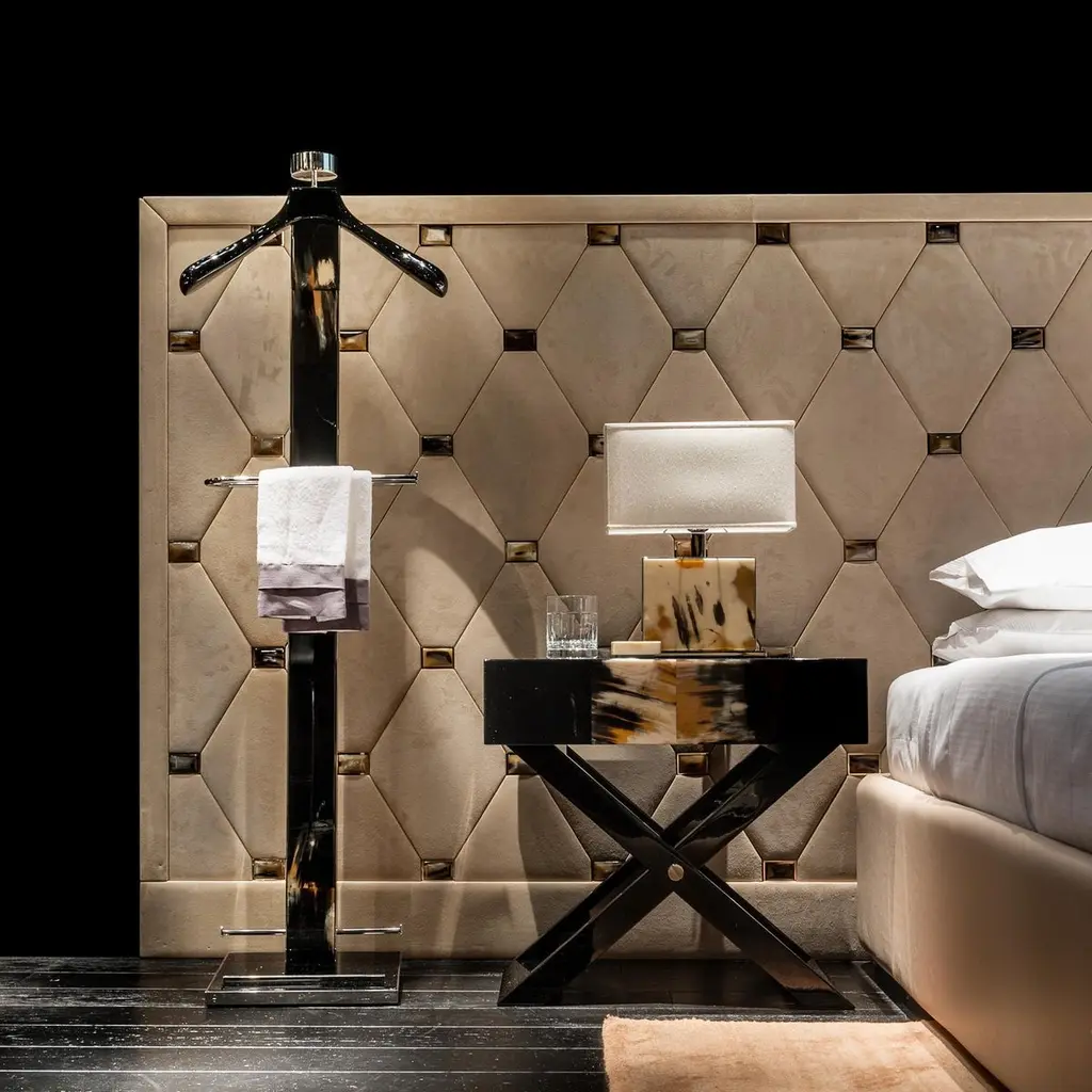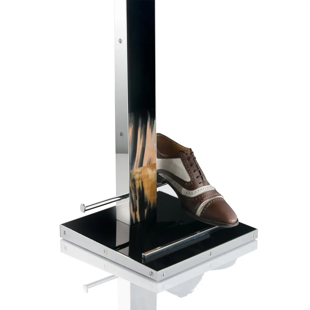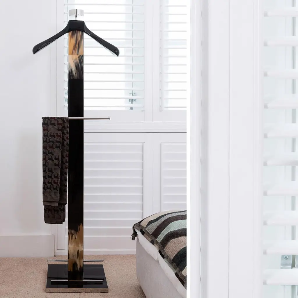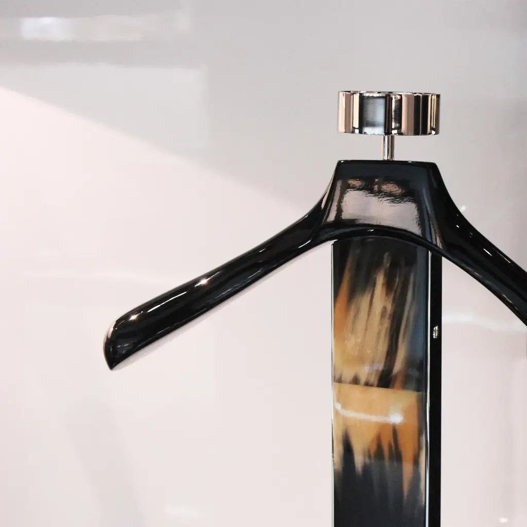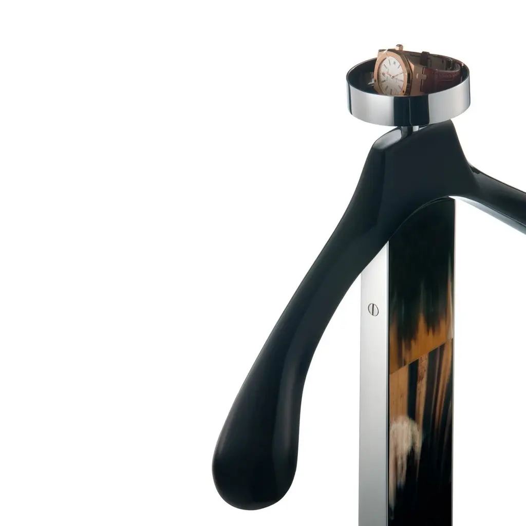 Boasting unparalleled details in Corno Italiano inlayed in a durable black lacquered wooden structure, the Levanzo wardrobe valet is an iconic object to compliment the finest home or office decor. A screw-accented edging in stainless steel gives a modern touch to the design. The anatomical shape of the shoulder rack will hang your suit in pristine condition. Accessorized with stainless steel shoe rack, trouser bar and a catch-all tray lined with black saffiano leather, this valet stand ensures extra storage space for his and her garments. Note: Colors and shades of Corno Italiano processed by our Company are unique and due to the natural origin of raw material. For this reason Corno Italiano tones that can be seen in pictures are indicative and can not be reproduced in finished products.