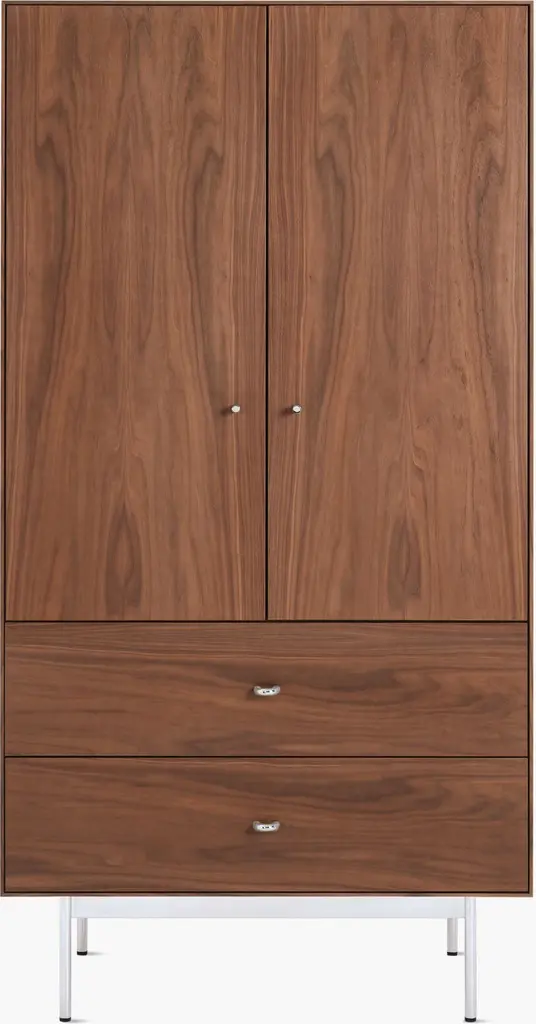 With just a hint of a visible cabinet surrounding the doors and drawers, the Loop Armoire (2020) defies logic, especially when you interact with it and discover its sturdy construction. The frame is slim, but not quite as slim as it appears from the front, where it's been “stepped back," or tapered, to create the appearance of thinness without sacrificing durability. Loop is the work of Rotterdam-based designer and Earnest Studio founder Rachel Griffin, who credits the consistent proportions of the doors and drawers with giving this collection a pleasing visual cadence. Simple loop drawer pulls and crisp mitered edges complete the neatly finished look. Made in Estonia.