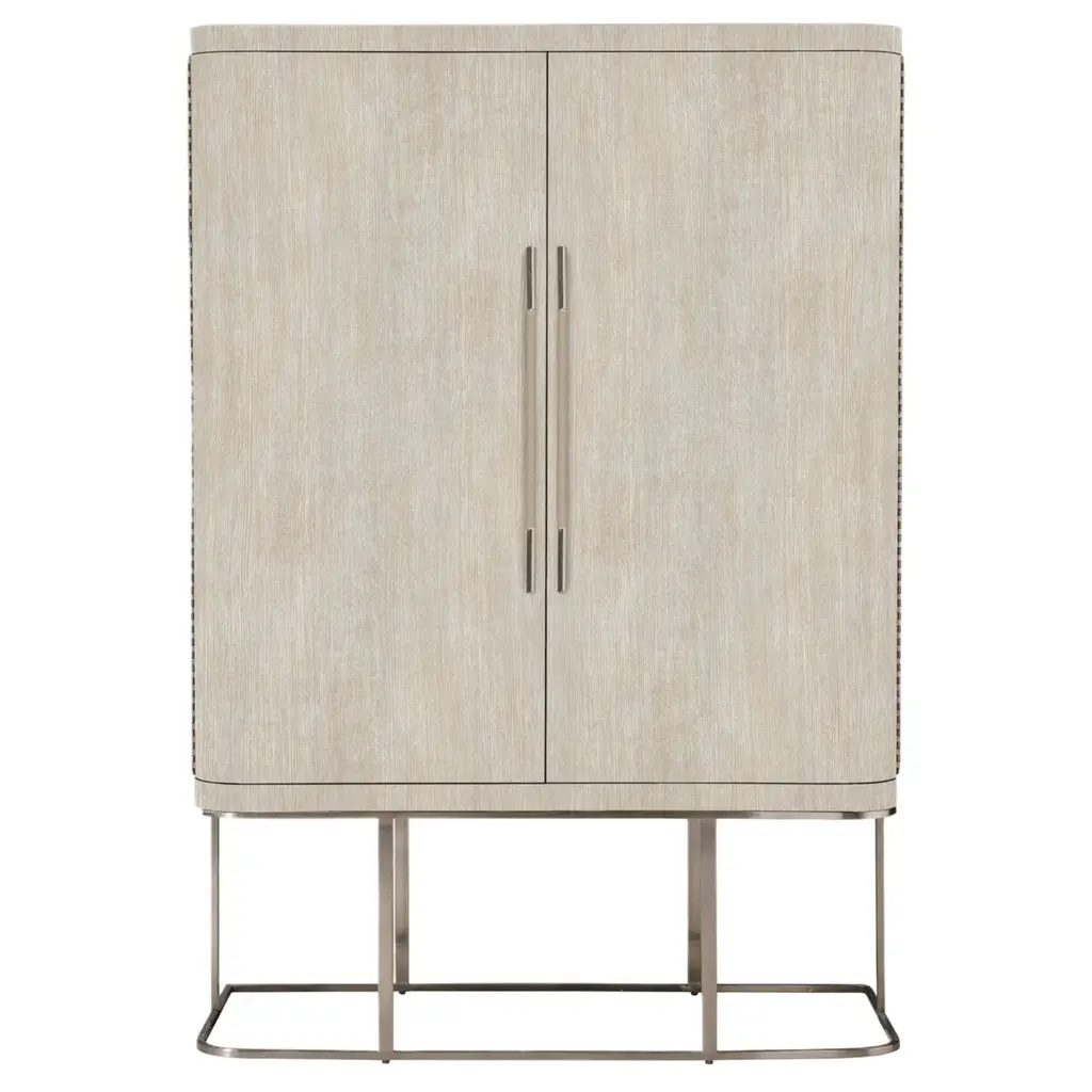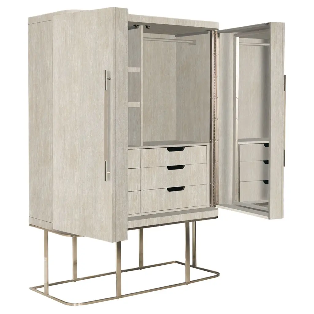 Architectural and timeless with a luxe mixture of materials, the Modern Mood Wardrobe is a statement piece. The shaped metal base gives the cabinet a floating appearance. Crafted with Oak Veneers, the wardrobe has two large wood doors with piano hinges and mirror glass on the back of the right-side door. Behind the right-side doors are two adjustable shelves. Features include six self-closing drawers, a removable clothing rod, and jewelry storage behind the left-side doors that includes 26 hooks, three felt-lined trays, and one removable drop-in jewelry tray with four padded rows for rings.