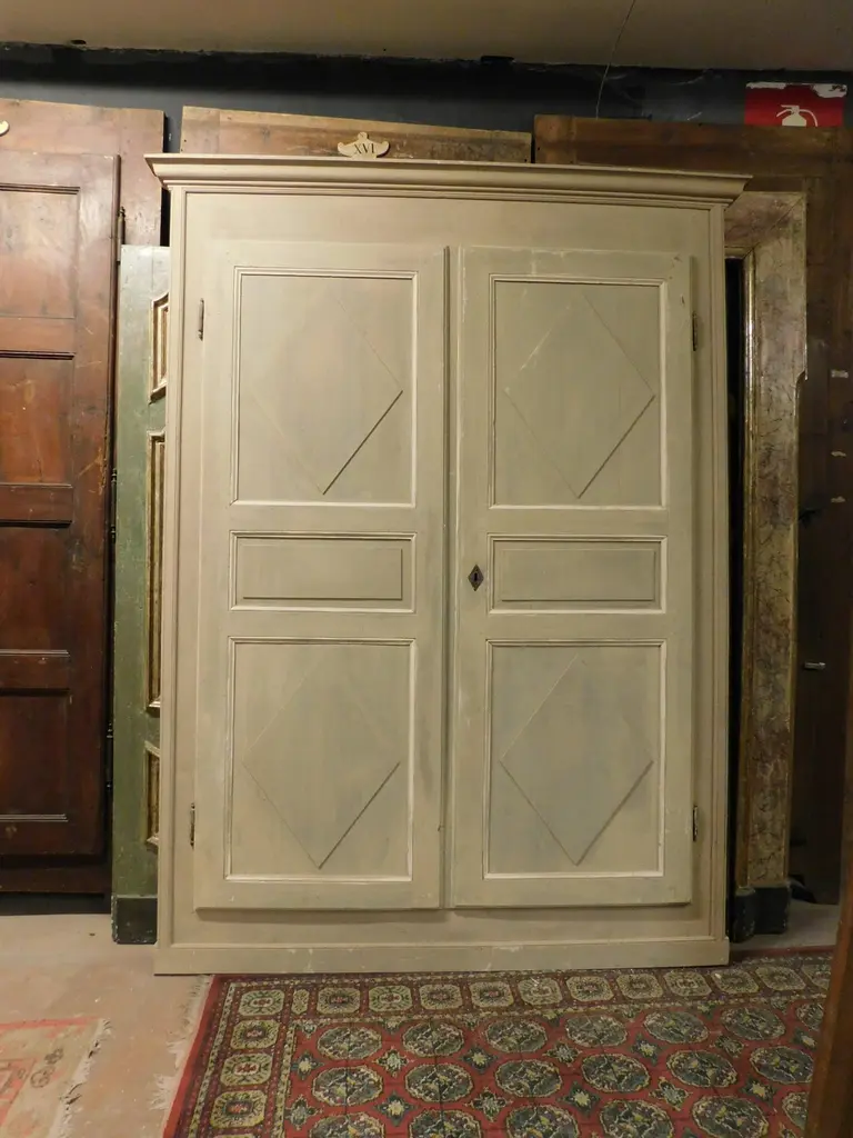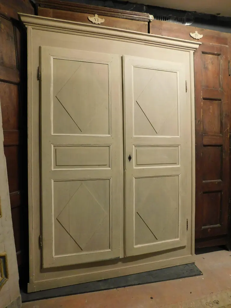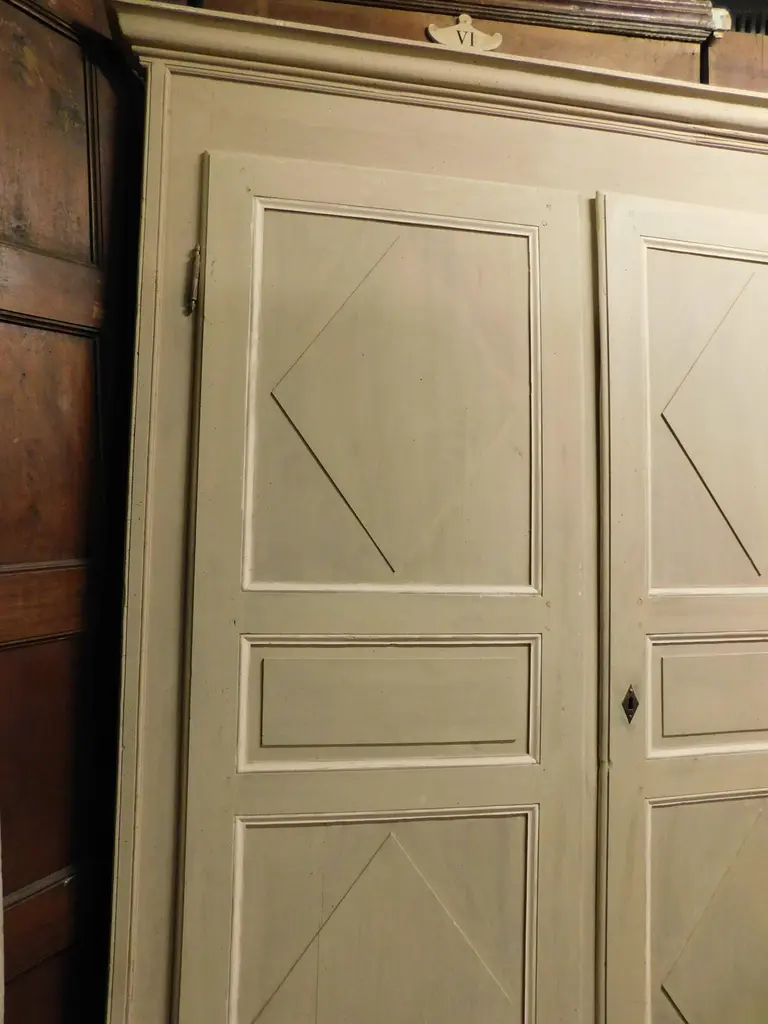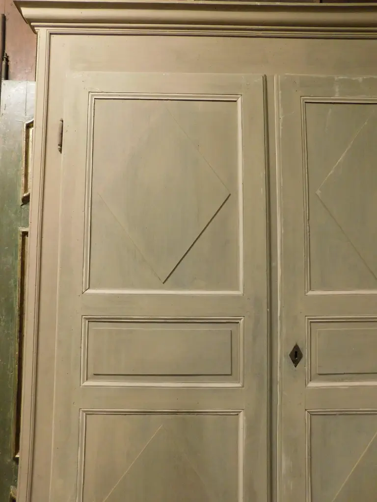 n.2 built-in wardrobes, pair of placards lacquered with a powder green background, equal to each other and carved with diamonds in the panels, built as a facade for wardrobes in Italy in the 19th century, ideal for closing niches, making wardrobes or as fake decorative doors/panels. maximum size cm w 160 (w hat cm 175) x H 230, internal opening dimensions cm w 140 x H 187