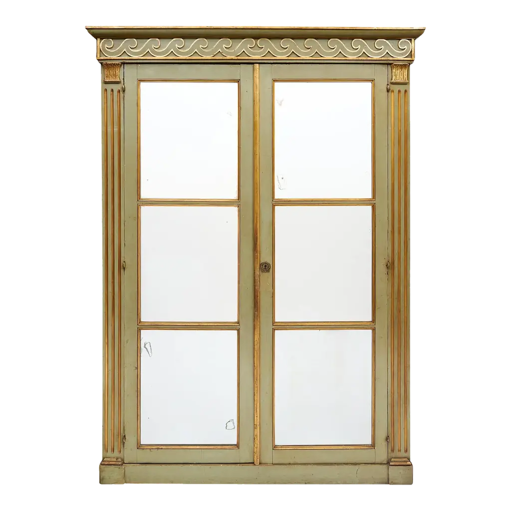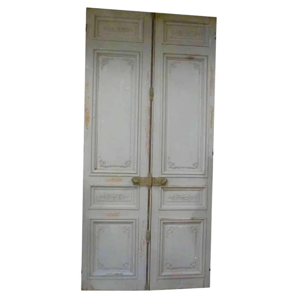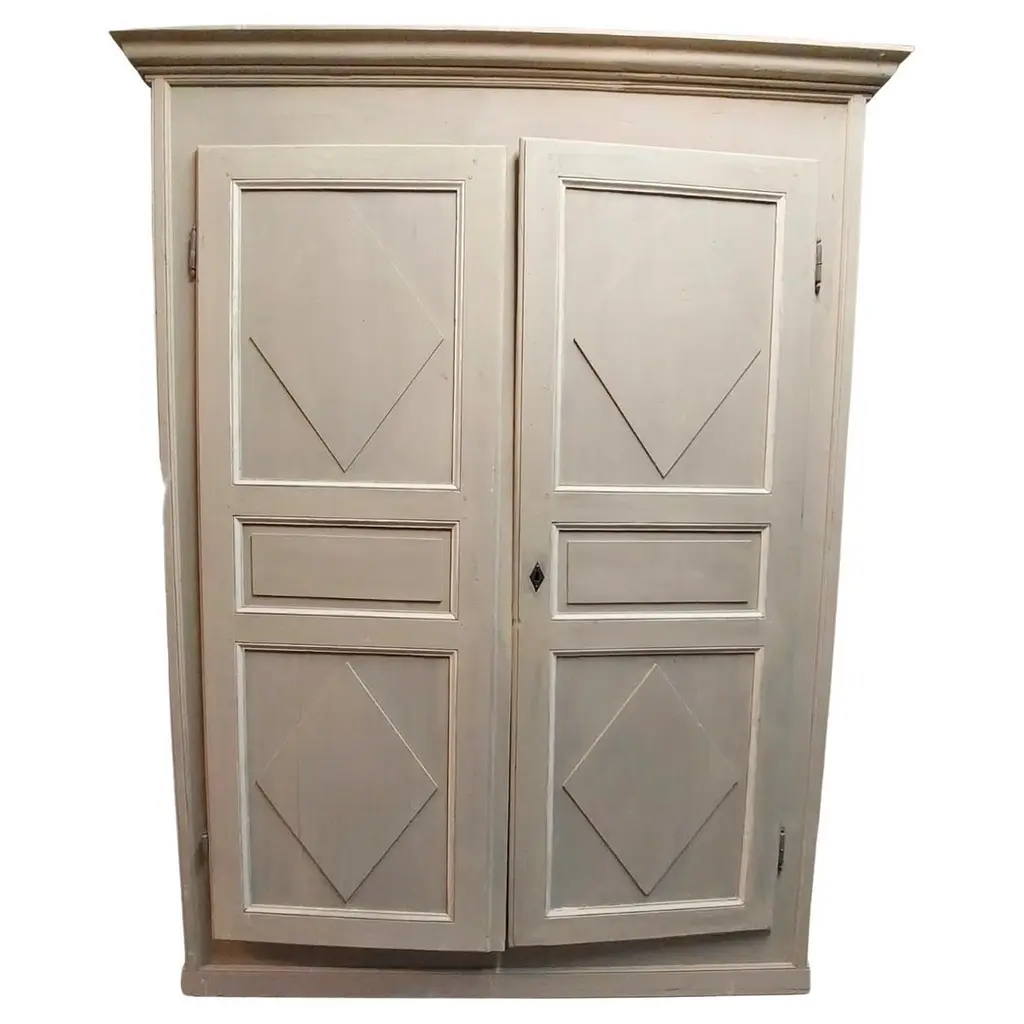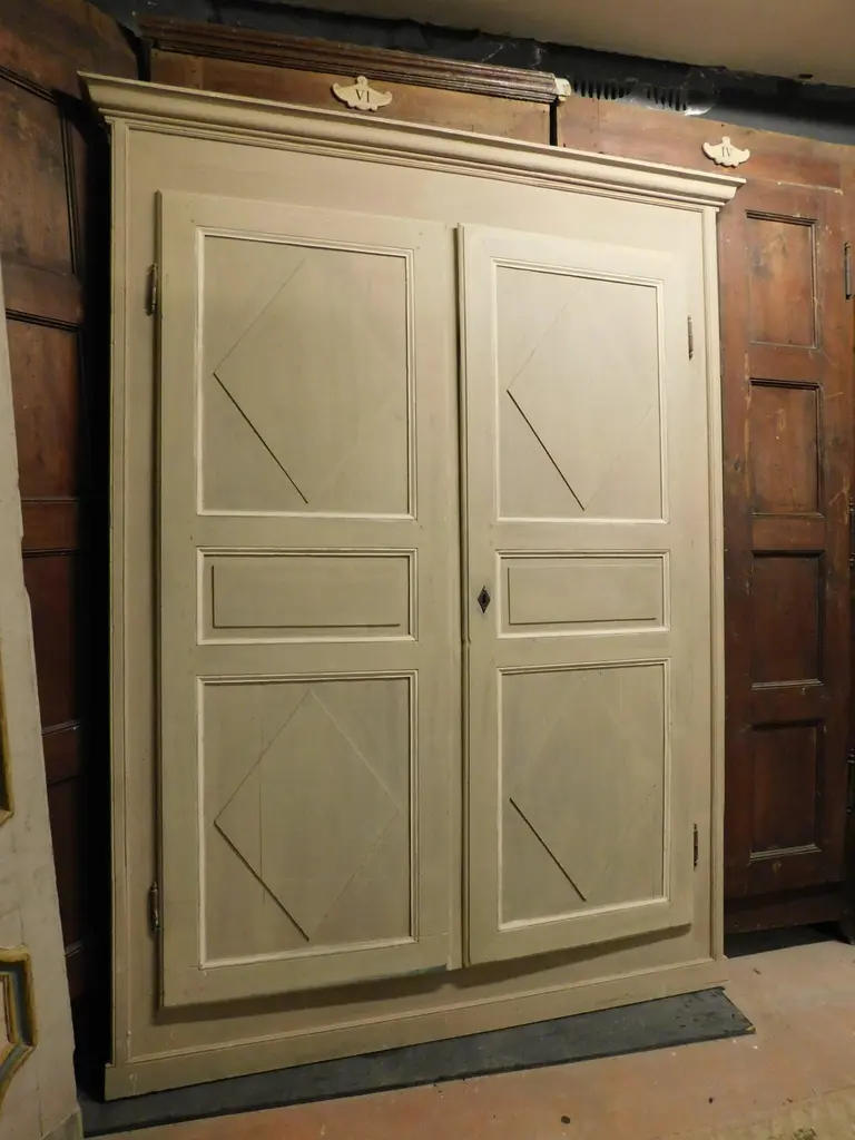n.2 built-in wardrobes, pair of placards lacquered with a powder green background, equal to each other and carved with diamonds in the panels, built as a facade for wardrobes in Italy in the 19th century, ideal for closing niches, making wardrobes or as fake decorative doors/panels. maximum size cm w 160 (w hat cm 175) x H 230, internal opening dimensions cm w 140 x H 187