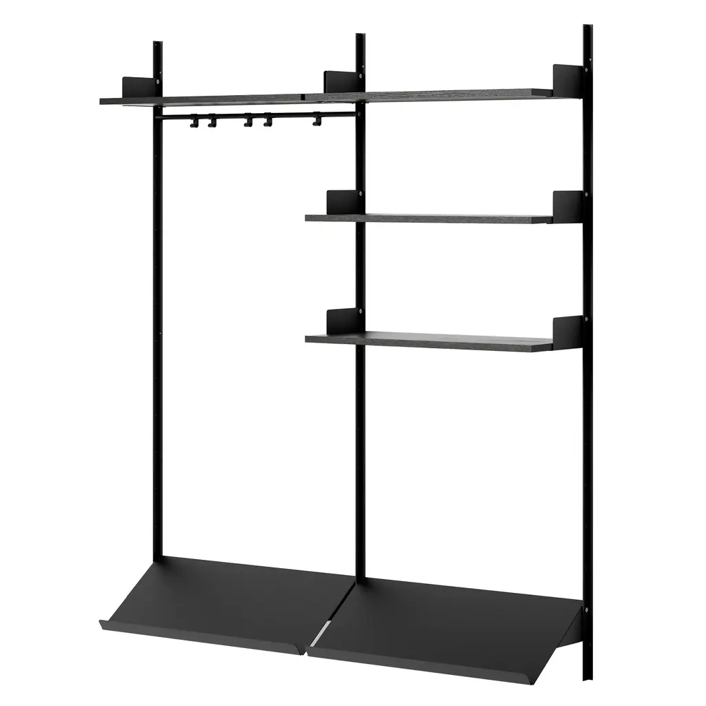 For the entry, dressing area or bedroom, Wardrobe Shelf brings a refined appearance to an otherwise practical furnishing with a combined upper shelf and hanger unit and a choice of shoe shelves below in a single or double width configuration. New Works’ signature wall series by designer Knut Bendik Humlevik features trim steel mounting bars and clean-lined shelves in a lacquered white finish or woodgrain veneer, neatly assembled with flat knurled screws in stainless steel.