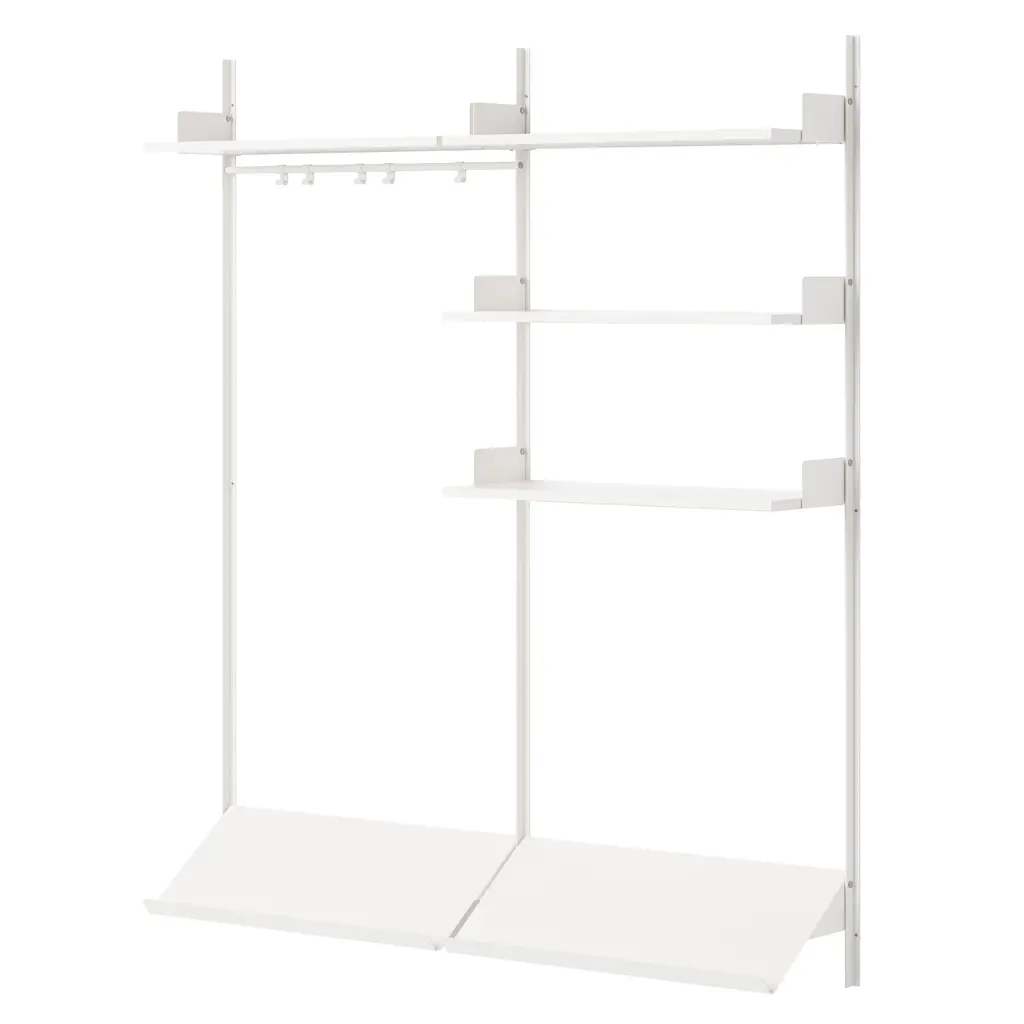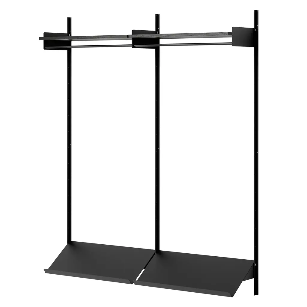 For the entry, dressing area or bedroom, Wardrobe Shelf brings a refined appearance to an otherwise practical furnishing with a combined upper shelf and hanger unit and a choice of shoe shelves below in a single or double width configuration. New Works’ signature wall series by designer Knut Bendik Humlevik features trim steel mounting bars and clean-lined shelves in a lacquered white finish or woodgrain veneer, neatly assembled with flat knurled screws in stainless steel.