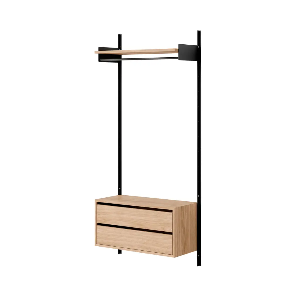 The New Works Wardrobe Shelf Cabinet with Drawers is designed for seamless integration with existing shelving systems or as a standalone unit. Featuring minimalist handles, the cabinet is available in finishes such as black, white, oak, black-stained ash, and walnut. With both doors and drawers, it provides a refined look while efficiently hiding away essentials, making it a versatile piece for any interior.