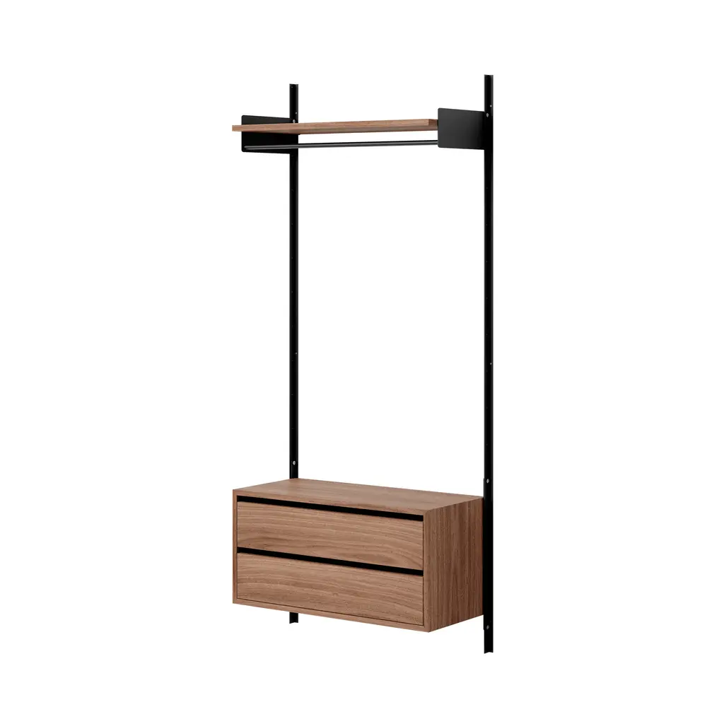 The New Works Wardrobe Shelf Cabinet with Drawers is designed for seamless integration with existing shelving systems or as a standalone unit. Featuring minimalist handles, the cabinet is available in finishes such as black, white, oak, black-stained ash, and walnut. With both doors and drawers, it provides a refined look while efficiently hiding away essentials, making it a versatile piece for any interior.