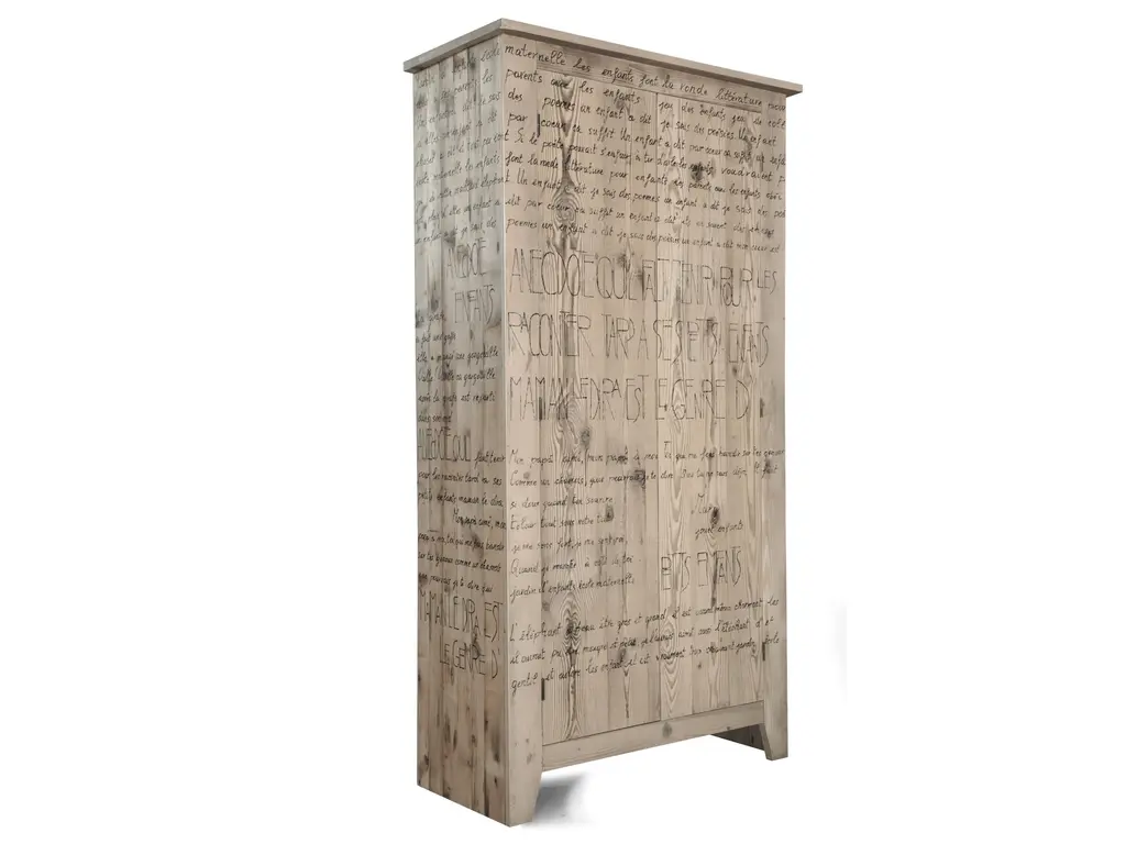 This NinnaNanna wardrobe is made of antique fir and features hinged doors revealing internal shelves. It is decorated on the outside with a French 'ninnananna' (Ital. 'lullaby').