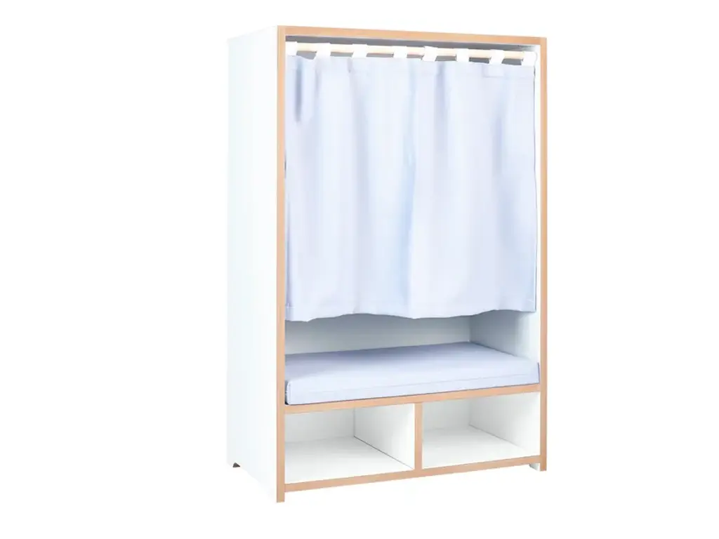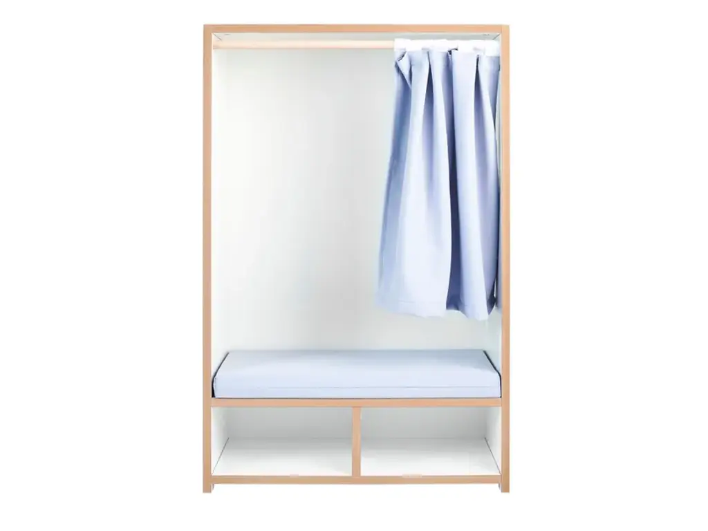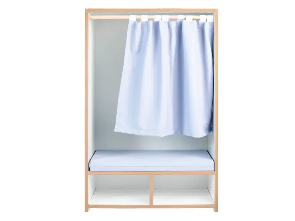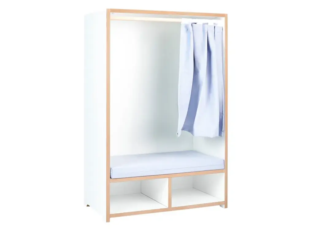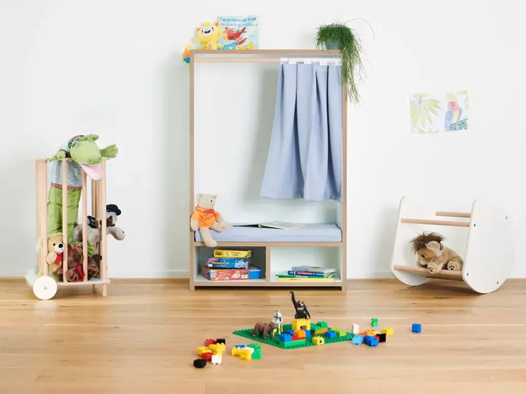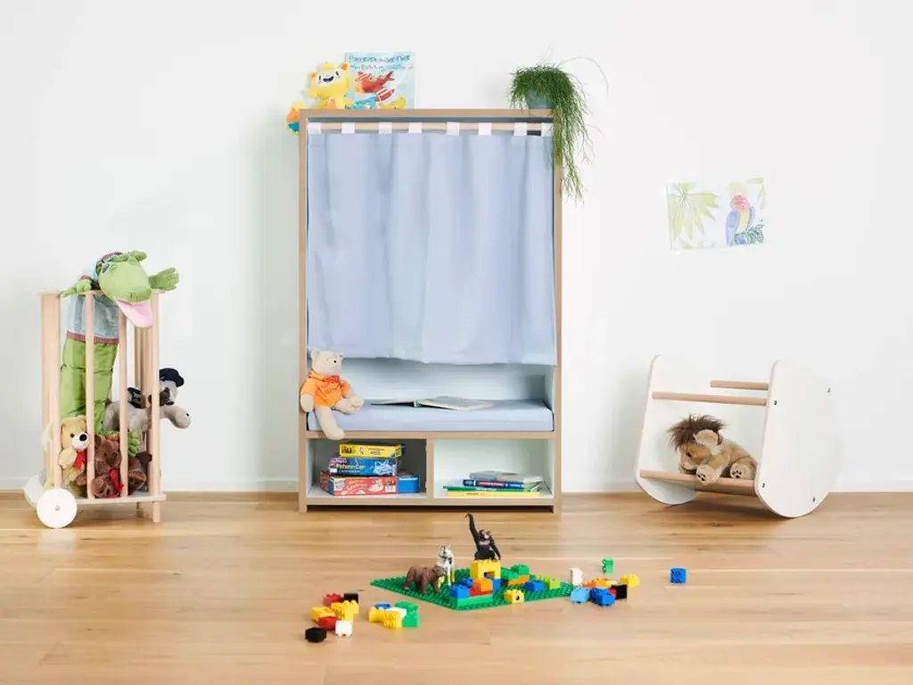 The Tojo-nische is a retreat for kids - whether for reading, sitting, resting or sulking. It sits comfortably on the included cushion. The side walls invite to lean and under the bench are two compartments for books, games or other utensils. In case the kids want to have their rest, the curtain can be drawn. Load capacity up to 50kg.