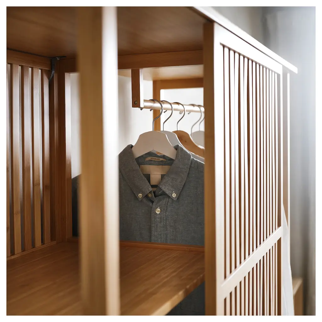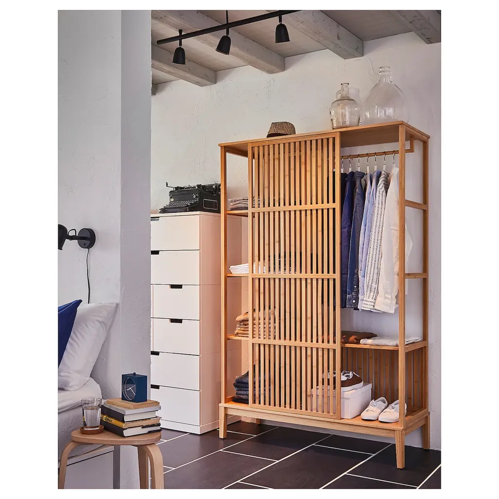 NORDKISA Open wardrobe with sliding door - bamboo 47 1/4x73 1/4 ". You can create a room divider by attaching one of the shorter sides of the wardrobe to the wall. This wardrobe is open yet it creates privacy thanks to a fixed wall on one side and a sliding door on the other.