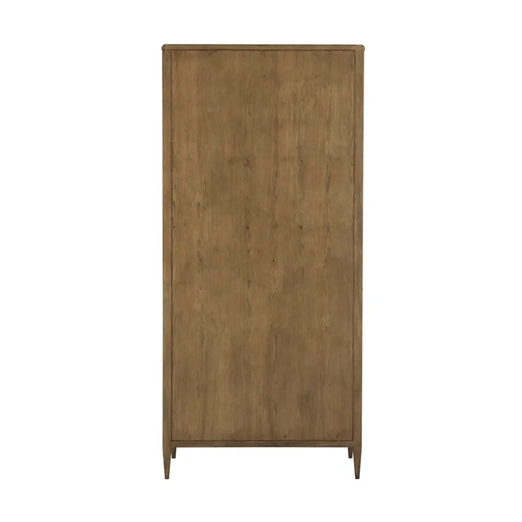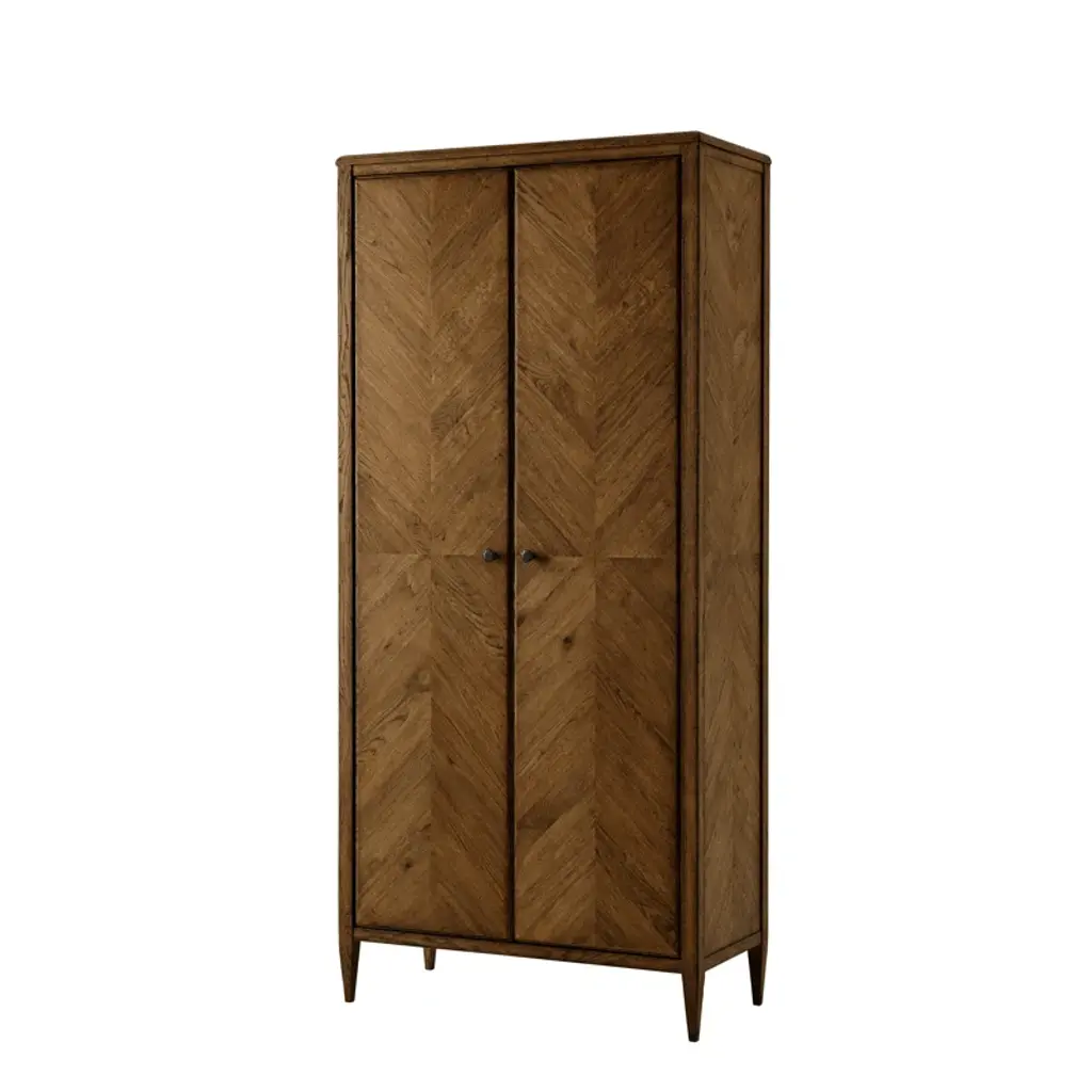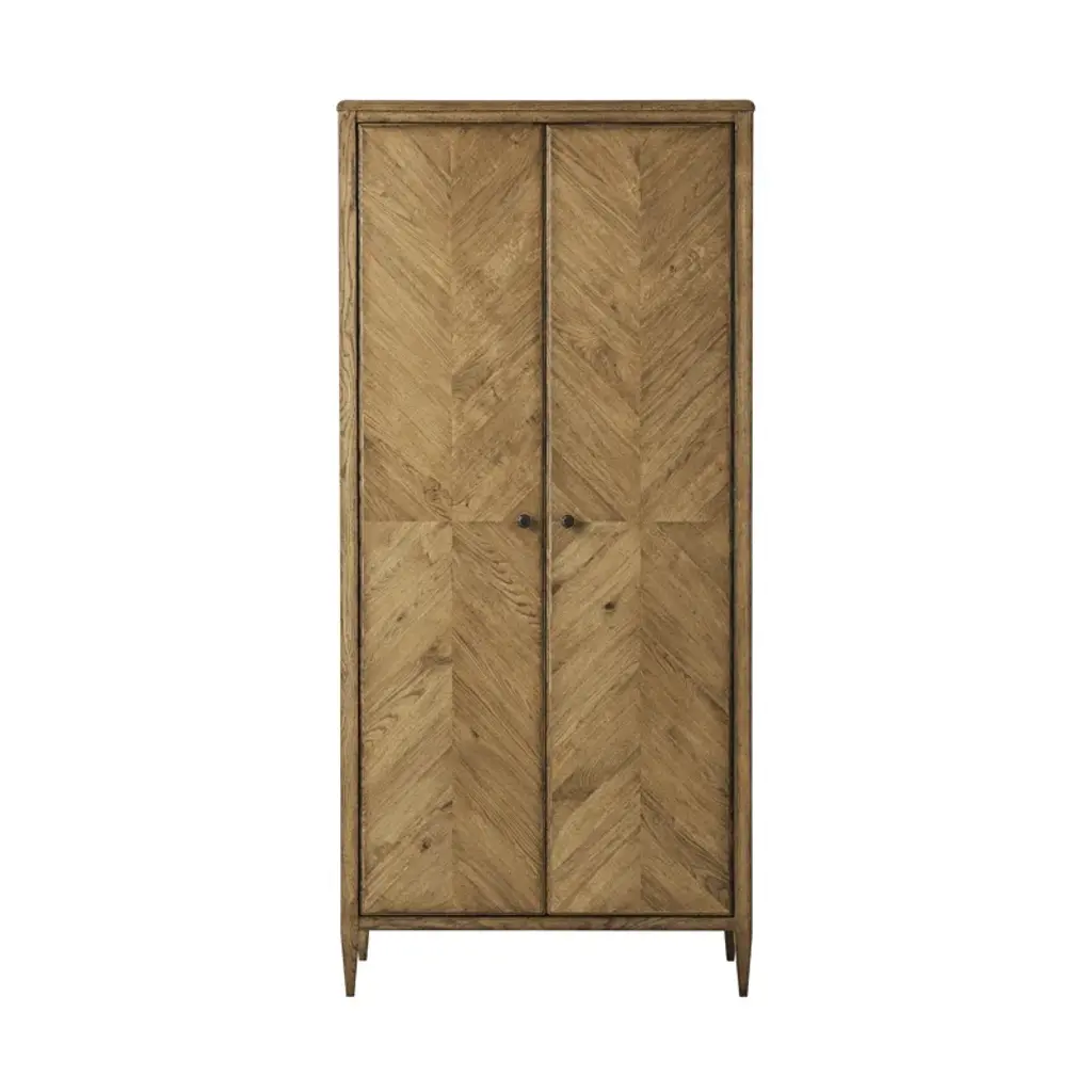 Double oak mirrored herringbone parquetry doors, this wardrobe is built with attention and care. Adorned with our elegant Verde bronze knobs and resting upon a tapered leg for added support.