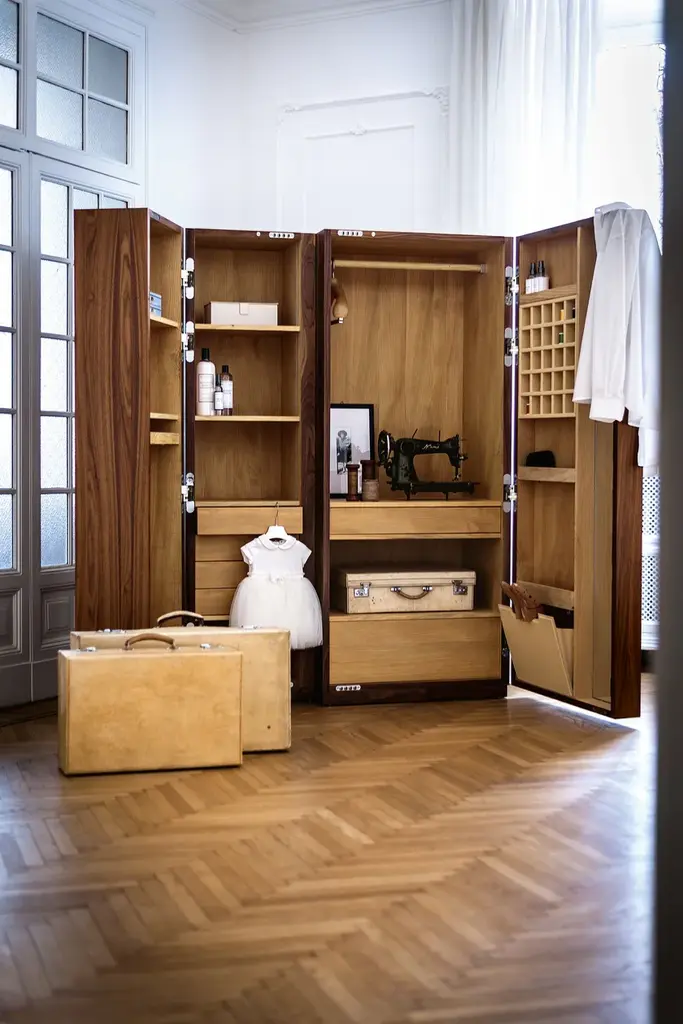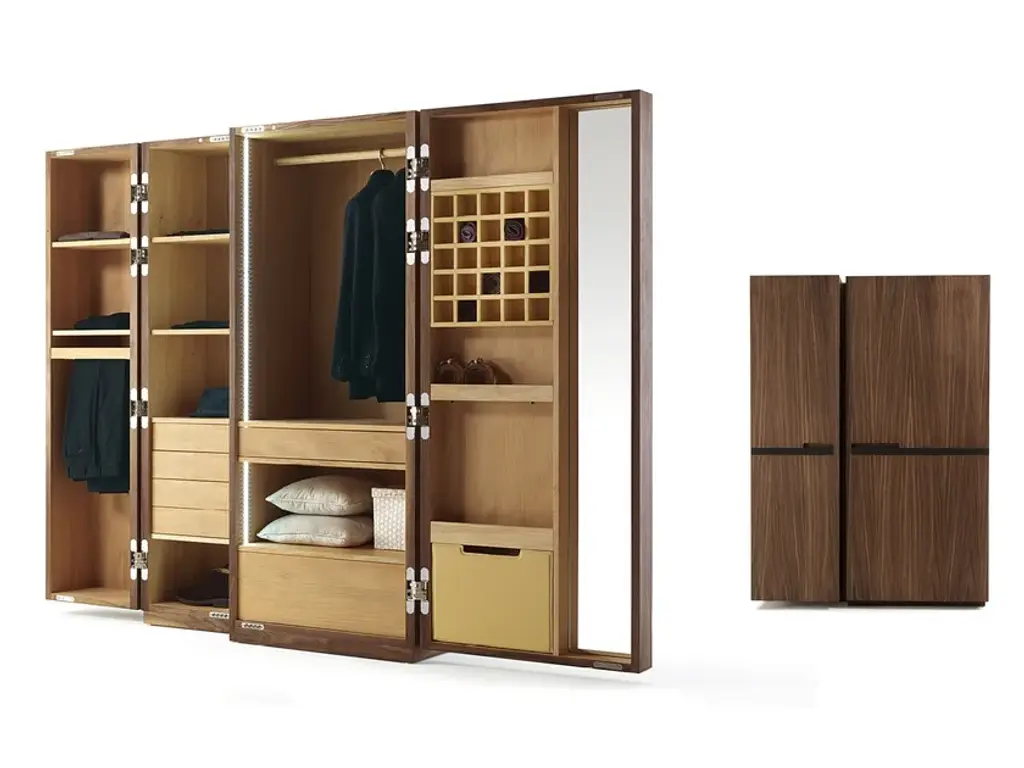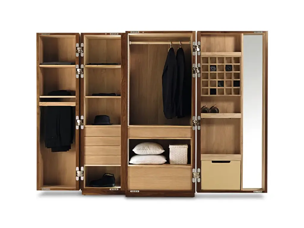 NUIT is a wardrobe in blockboard and solid wood, with asymmetrical doors with completely smooth fronts and metal handle. Modern reinterpretation of the traditional chest-container, it offers a practical organization of the various elements. Perfect with internal fitting in scented cedar, a natural anti-moth agent. LED lighting included.AVAILABLE FINISHES:A1: walnut without knots, walnut with knotsA2: oak without knots, oak with knots, cherryA4: oak without knots pigmented: milk white, total blackoak with knots pigmented: milk white, total blackN.B.: pigmented surfaces only outside, inside cedarA7: cedarB2: lacquered iron: irondust, RAL (selected colours only)B3: matt brushed lacquered iron: antique bronze, steel, titanium
