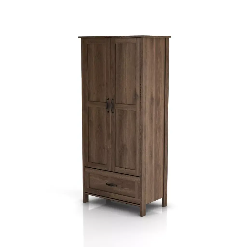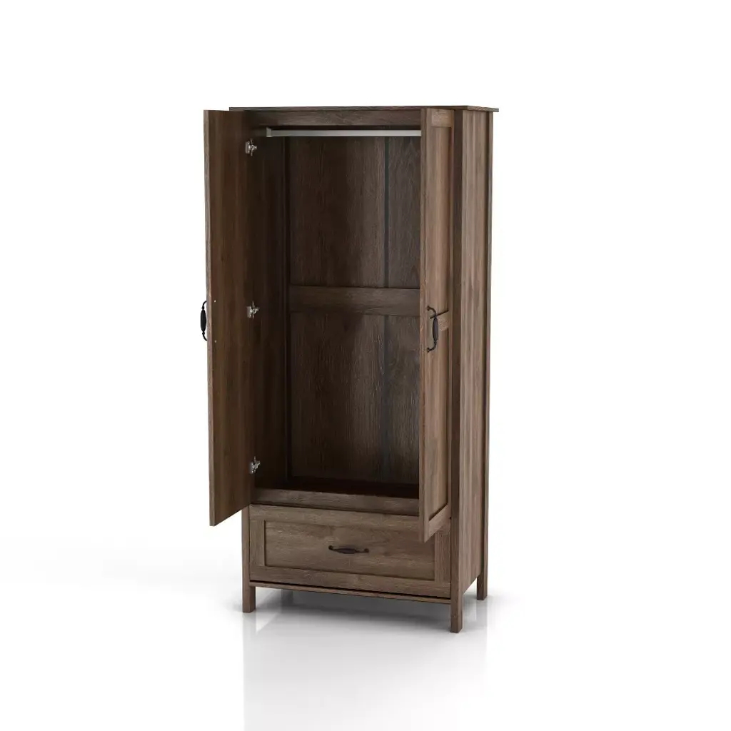 This distressed walnut wardrobe is a great addition for any room that requires more storage spaces whether it's in the entryway, the bedroom or even the family room. Its framed doors, streamlined drawer and elegant black finish metal handles will give you a transitional style that fits to any decor. It features - storage spaces separated by 2-doors. On the top side there is a metal rod for hanging longer item of clothing.Overall height: 70.86 inchesOverall width: 33.07 inchesOverall depth: 19.54 inchesTop surface width: 33.07 inchesTop surface depth: 19.54 inchesFloor to top: 70.86 inchesDrawer height: 10.94 inchesDrawer interior dimension: 7.12 inches H x 27.83 inches W x 15.15 inches DDoor height: 54.13 inchesShelf height: 51.45 inchesShelf width: 29.52 inchesShelf depth: 17.24 inchesLeg height: 4.01 inchesClearance from top to rod hang: 1.49 inchesClearance between legs (front to back): 13.38 inchesDrawer outside depth: 16.45 inchesDrawer outside height: 10.94 inches