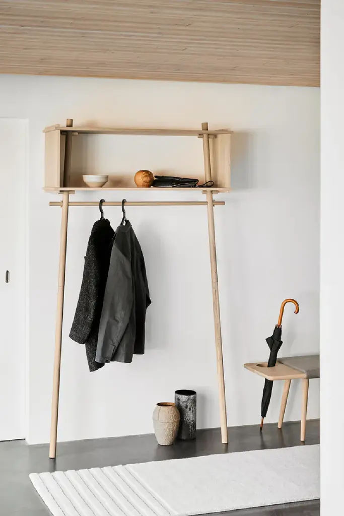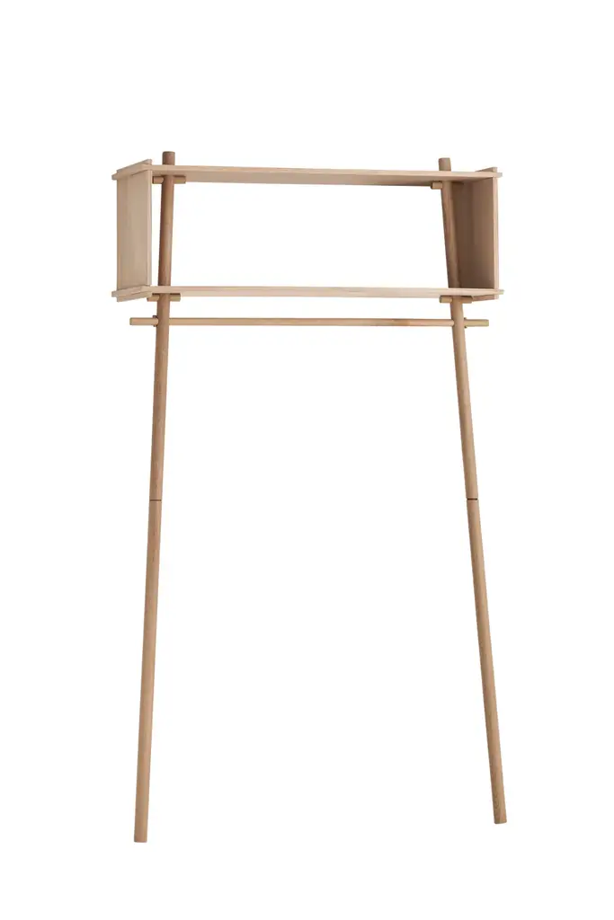 Töjbox is a simplistic and functional wardrobe made of oak. The design is ideal for the entrance, bedroom or walk-in closet. Use the clothes rack to hang your shirts and jackets and store your every day belongings or favorite decorations in the box, while the angled legs leave space on the floor for shoes and bags.
