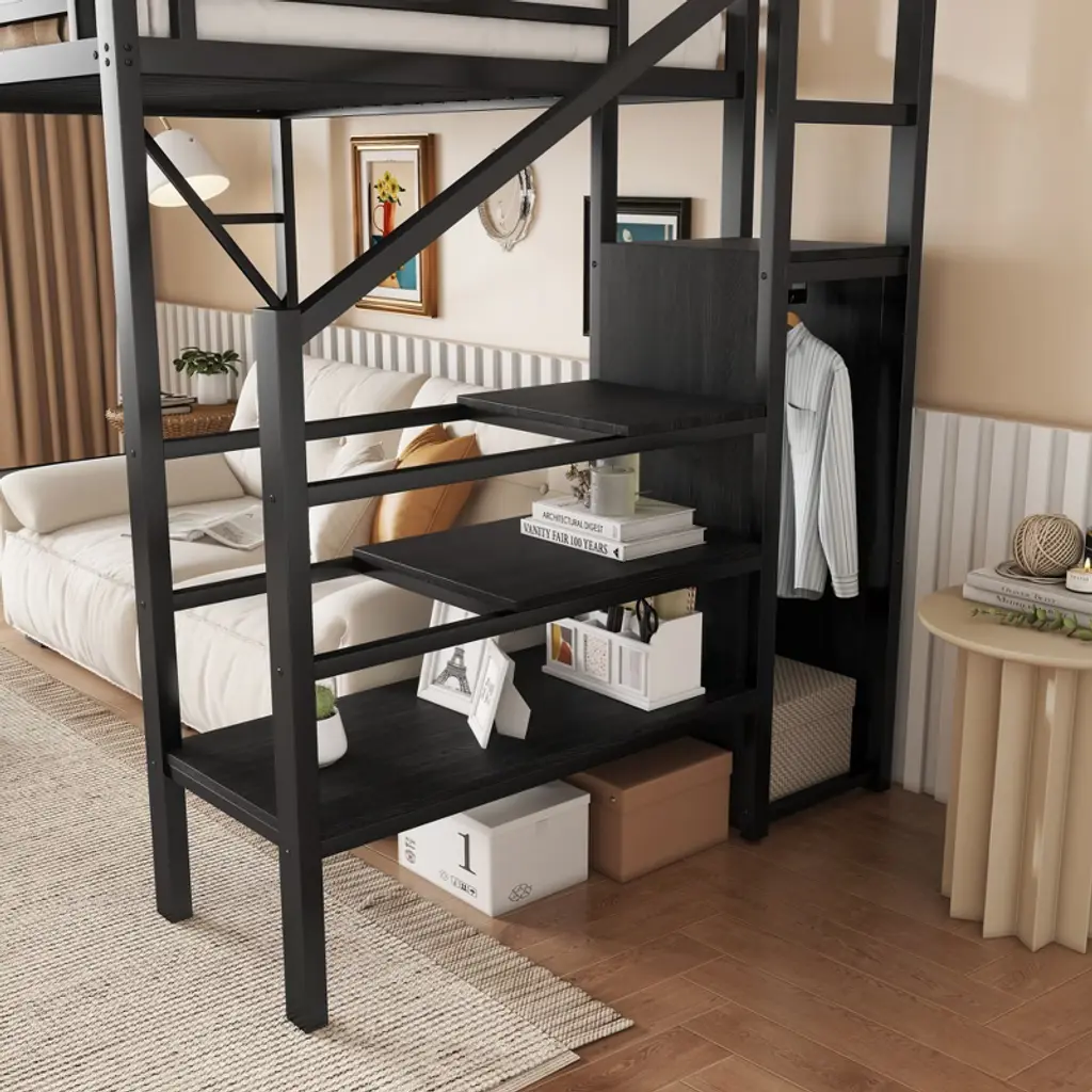 Okak 94in Twin Size Loft Bed With Wardrobe, Twin Bed With Storage Shelves And Basket, Bed Frames For Bedroom, Dormitory, Black