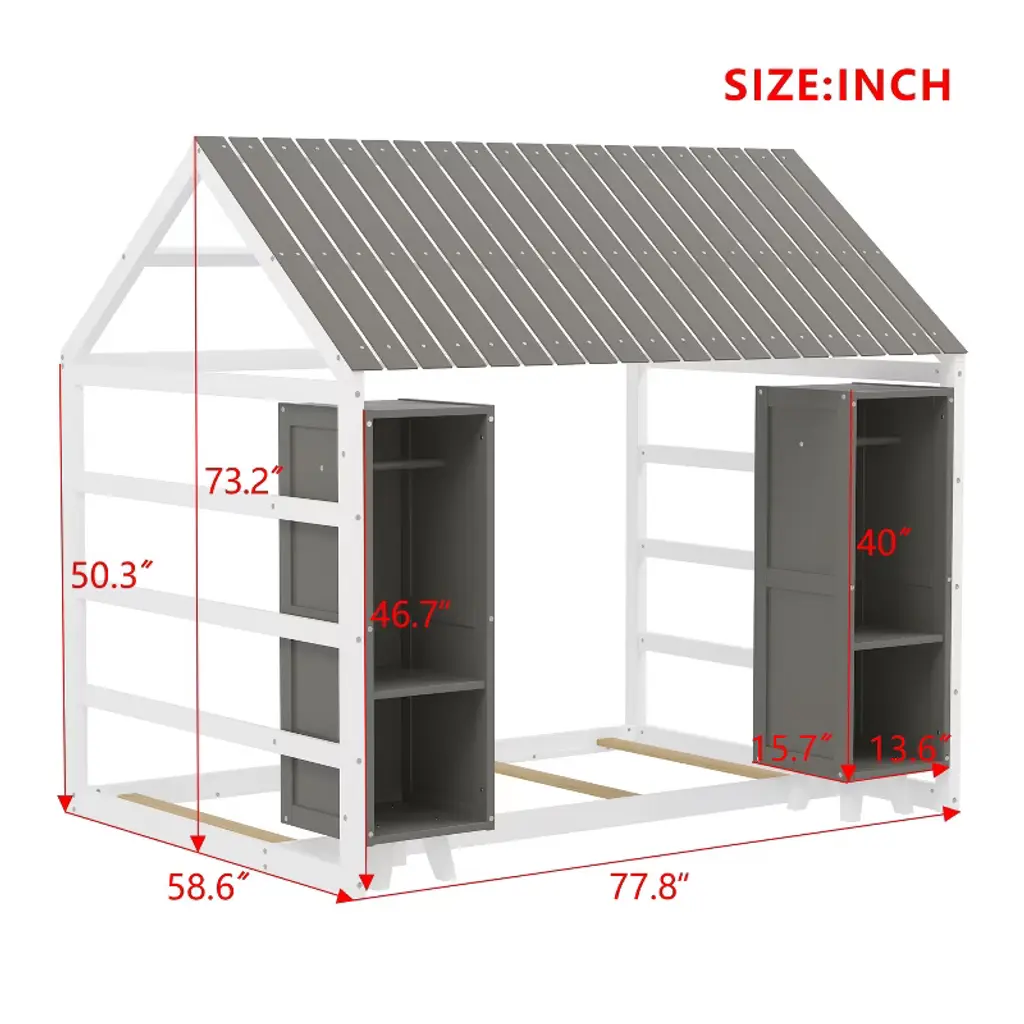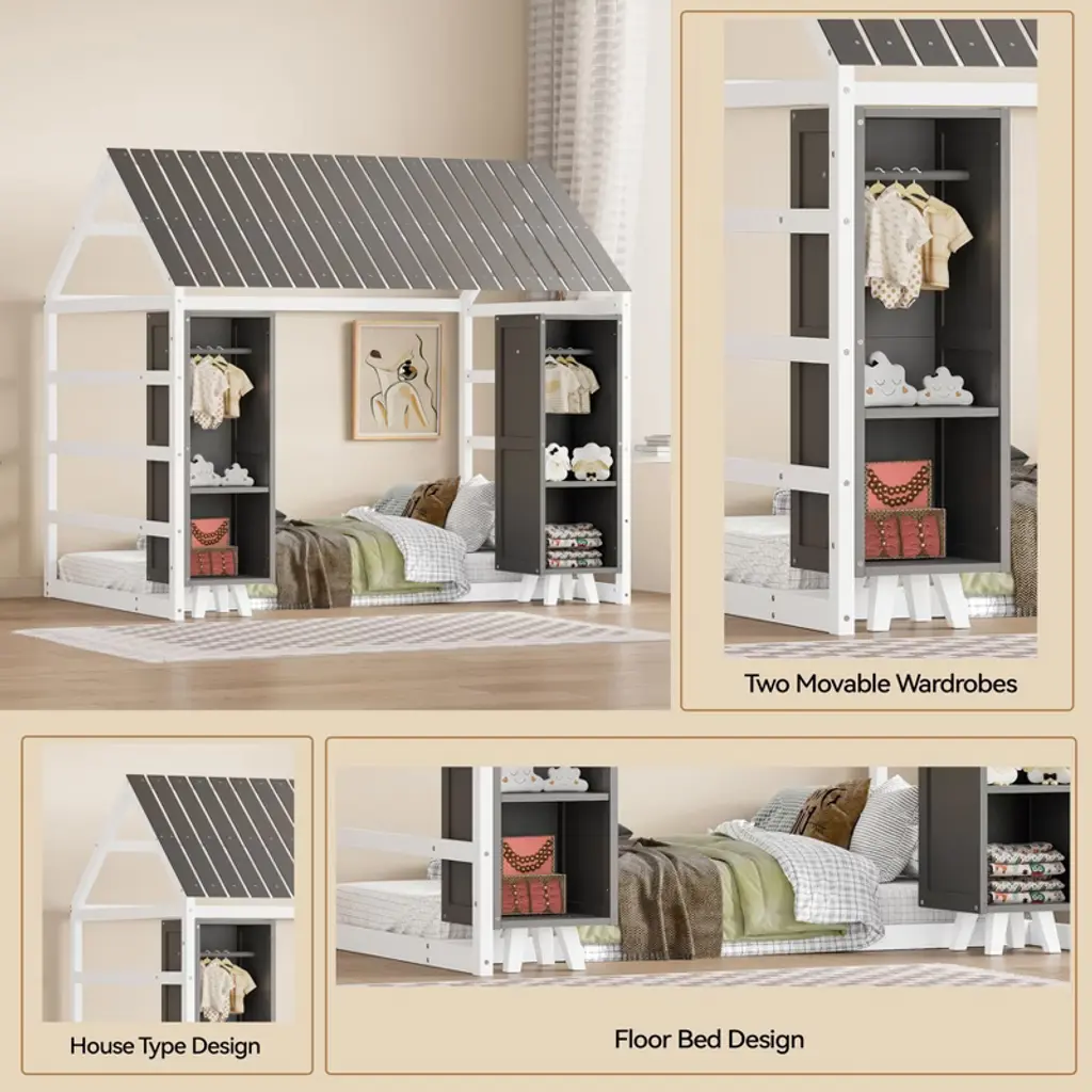 Okak Twin Size Floor Bed For Playhouse,house-shaped Kids Bed With Safety Rails & Roof, 2 Movable Wardrobes, Gray
