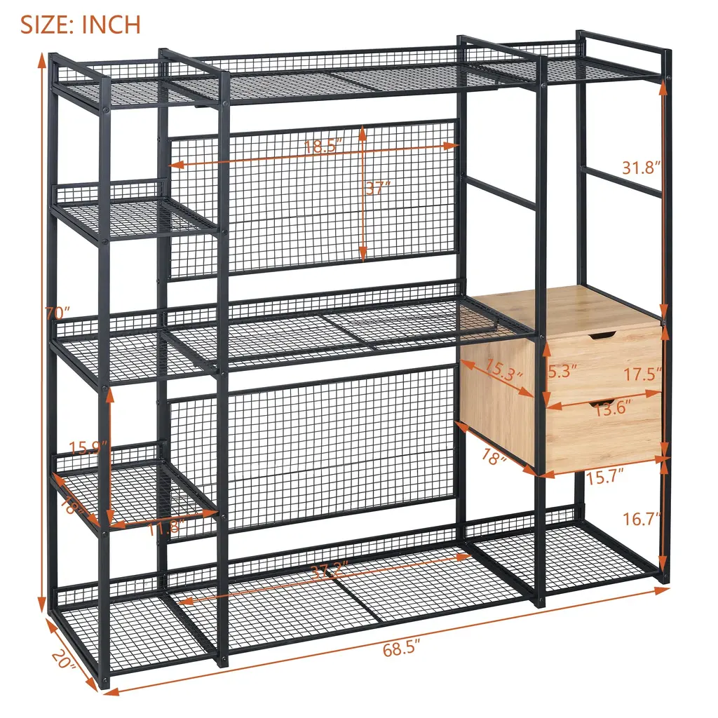 [Modern Clean design] Eliminating excess mess gives you more physical and mental space to dream up a room that's uniquely your own.This wardrobe features a clean, strong silhouette that can anchor a room with ease. White/Black will match most modern room decor themes according to most interior designers. [Maximized space] The wardrobe maximize your closet space with this open-style clothing rack. The hanging rails and metal shelves provide ample room for clothes and accessories. [Secure Storage] Equipped with two drawers, the wardrobe helps to store books, decorations, or to place some important things. [A Beautiful Piece for Bedroom]Crafted of metal in a clean painted finish, this wardrobe strikes a clean-lined silhouette that blends well with the surroundings. Our designs promote both comfort and elegance. [Dimensions] Overall Product Dimension: 68.5"L x 20"W x 70"H. Some assembly is required, although we have provided clear instructions and tools.
