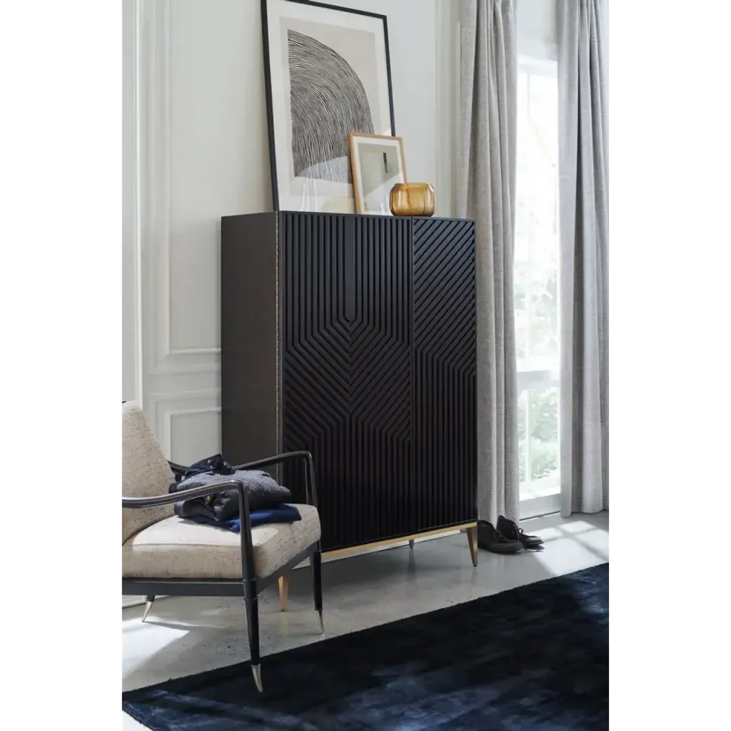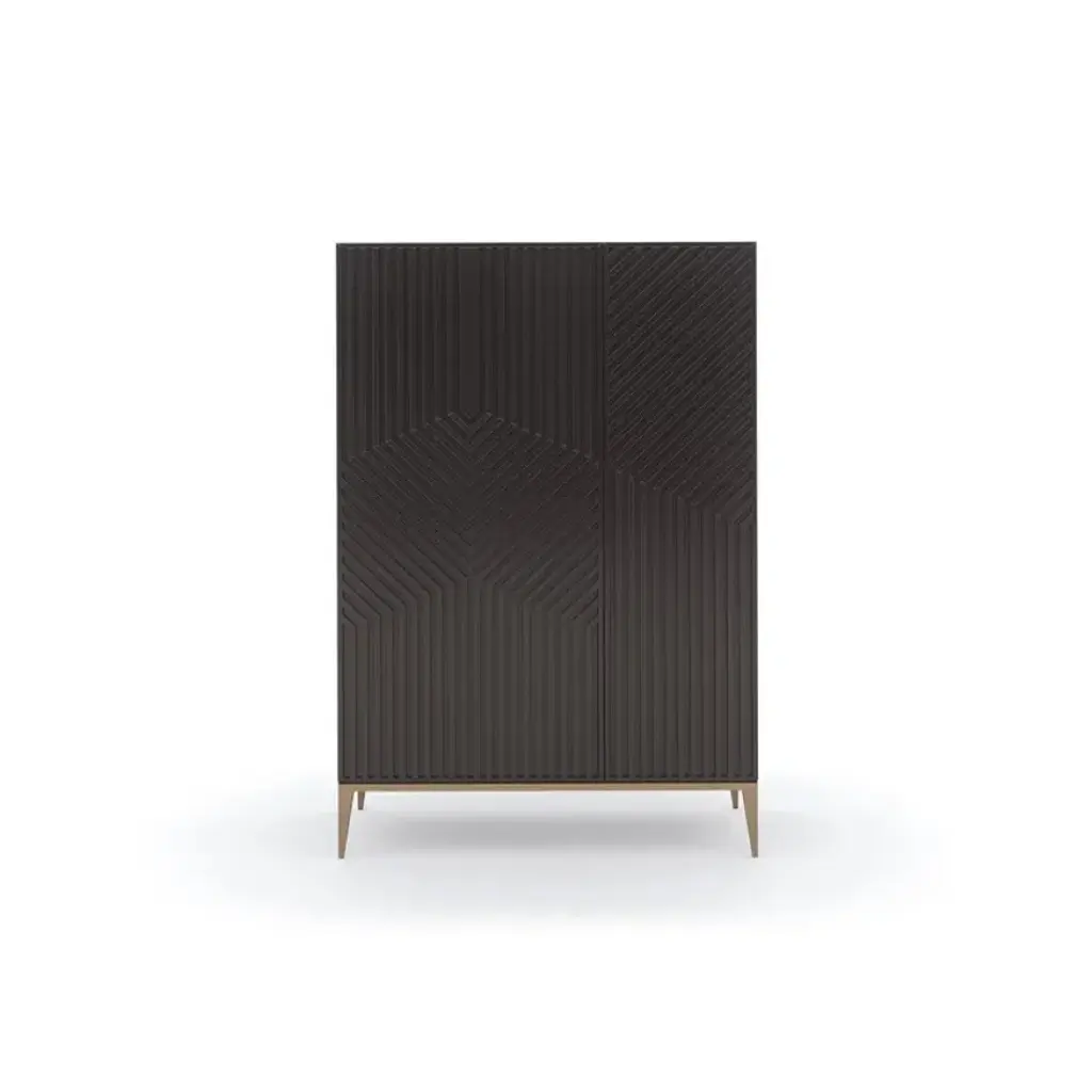 Drawing the eye with its distinctive design, this tall chest introduces a bold, modern graphic to any interior. Thin wood strips applied to the door panels create texture and a linear labyrinth for added dimension. Generous storage on the left offers five drawers with side guides and open storage on top, complemented by three adjustable shelves on the right and a full-length mirror on the back of the door for dressing. Tapered legs in Champagne Gold lend a brilliant accent and warm metallic.