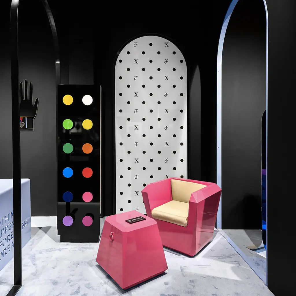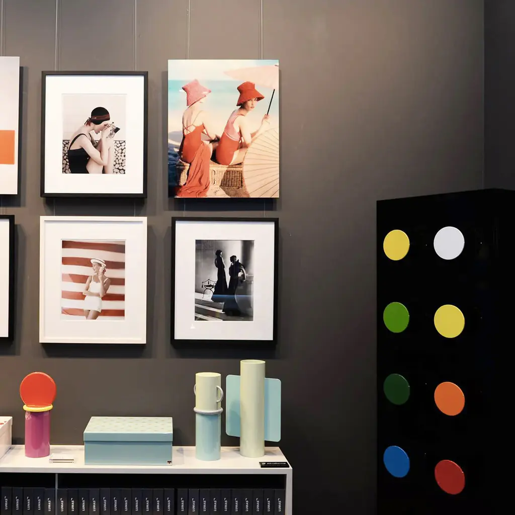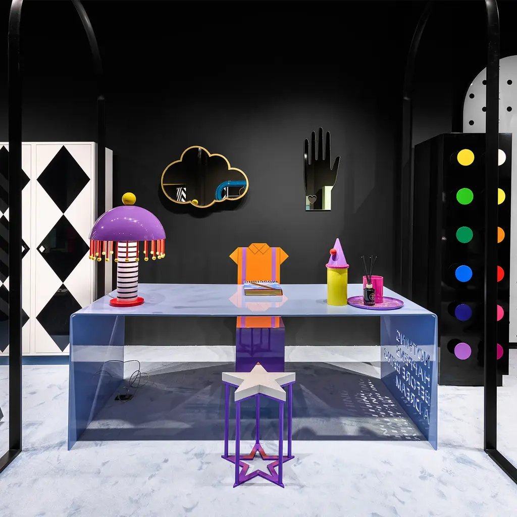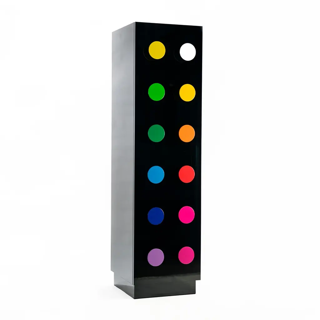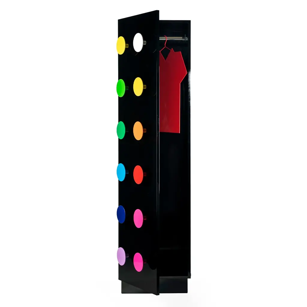 A tribute to Pablo Picasso and his watercolors, this colorful wardrobe was designed by Elena Cutolo for the collection "A Moveable Feast, Paris in the Twenties". Crafted entirely of aluminum, the tall, rectangular frame has a dramatic black finish that highlights the 12 colorful disks, arranged on two vertical lines, that grace the front panel. Raised on a plinth, this wardrobe combines function, innovation, and style into a perfect contrast of colors.