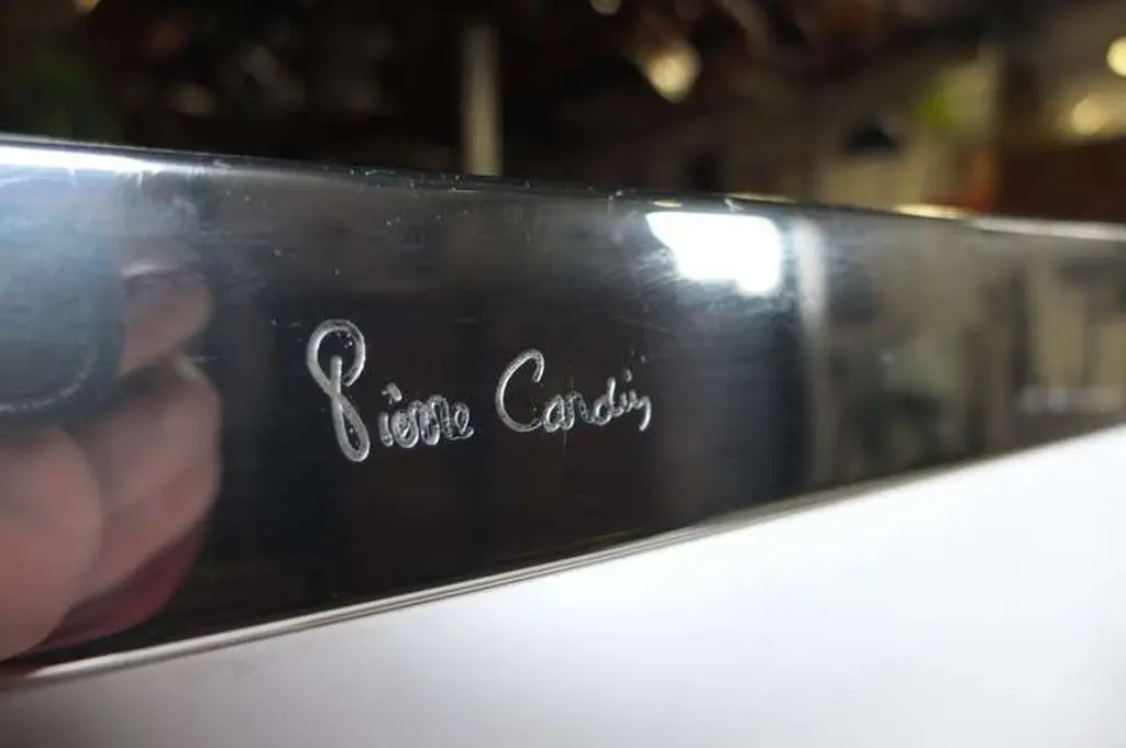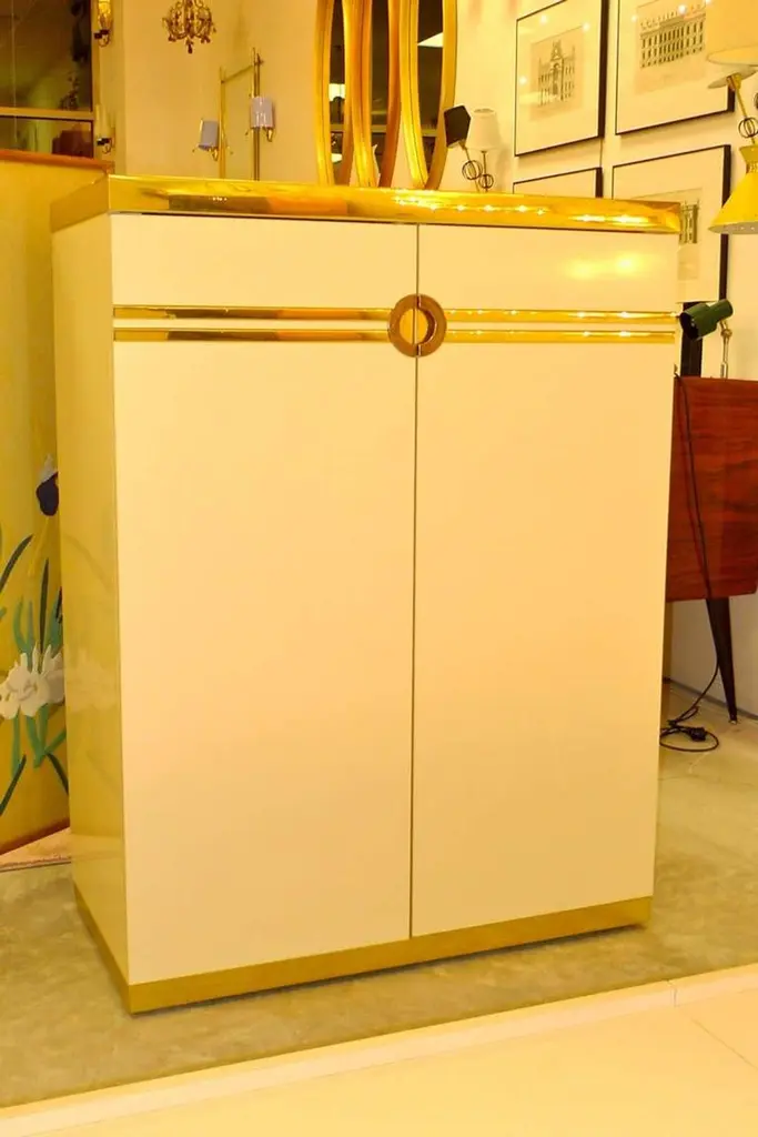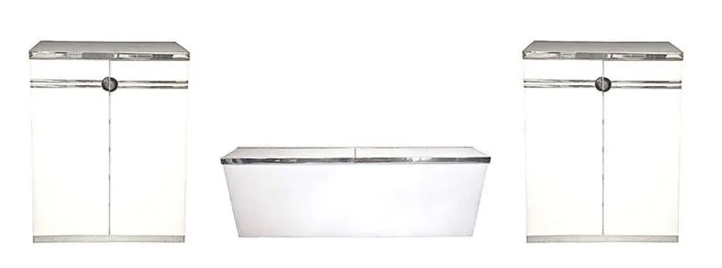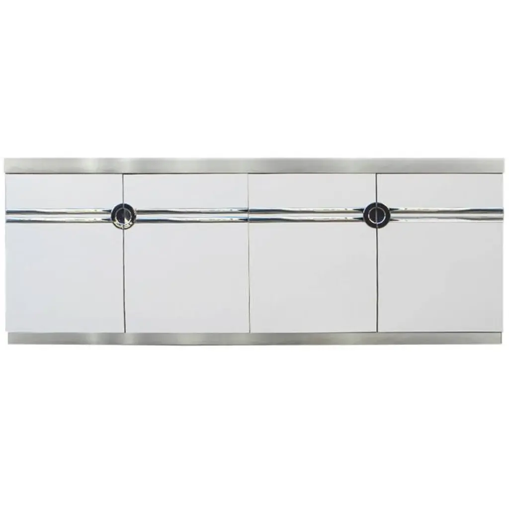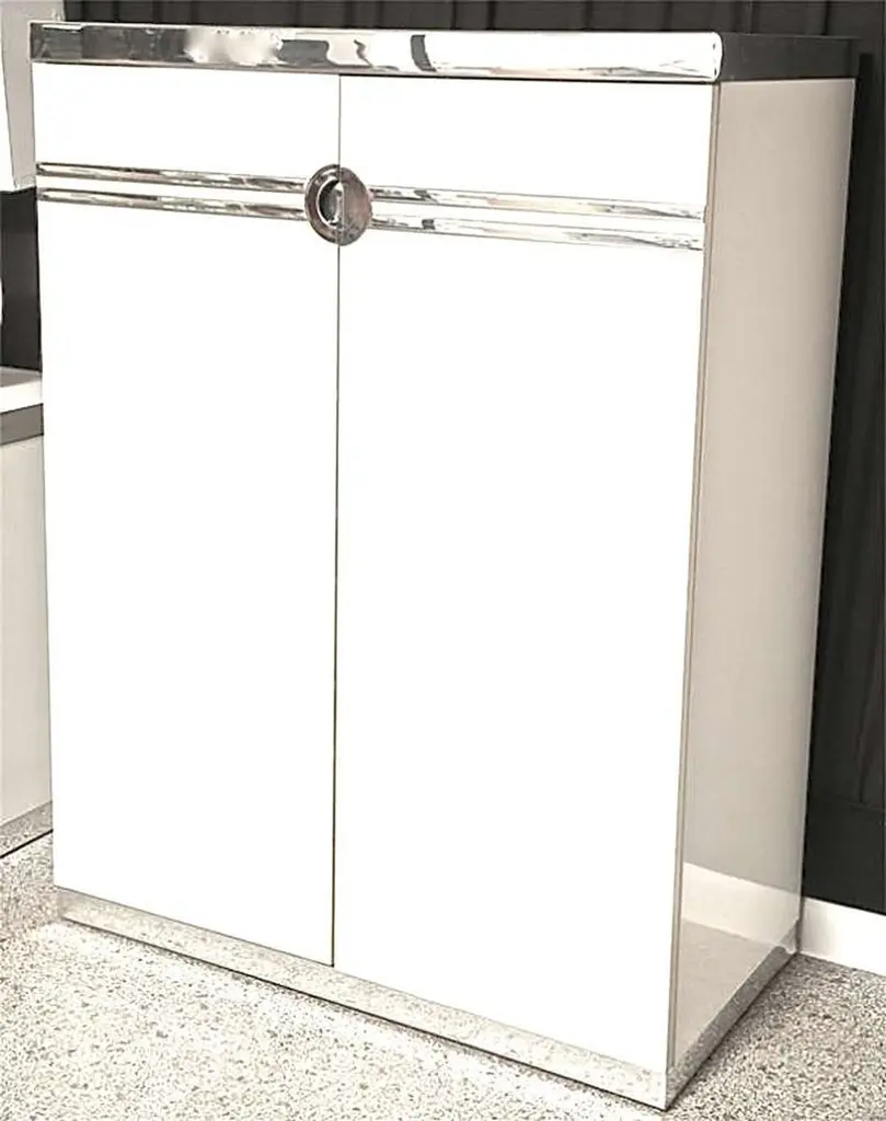 We have a pair of Pierre Cardin tall wardrobe dresser cabinets with double doors which open to reveal 6 pull-out drawers. Produced by Dilingham. White laminate with aluminum banding polished to a chrome-like mirror finish. Impressed signature of the designer, Pierre Cardin. Circa 1970. Price shown is per piece.We also have one in ivory laminate with polished brass finish.Also available is the white with chrome queen size headboard.