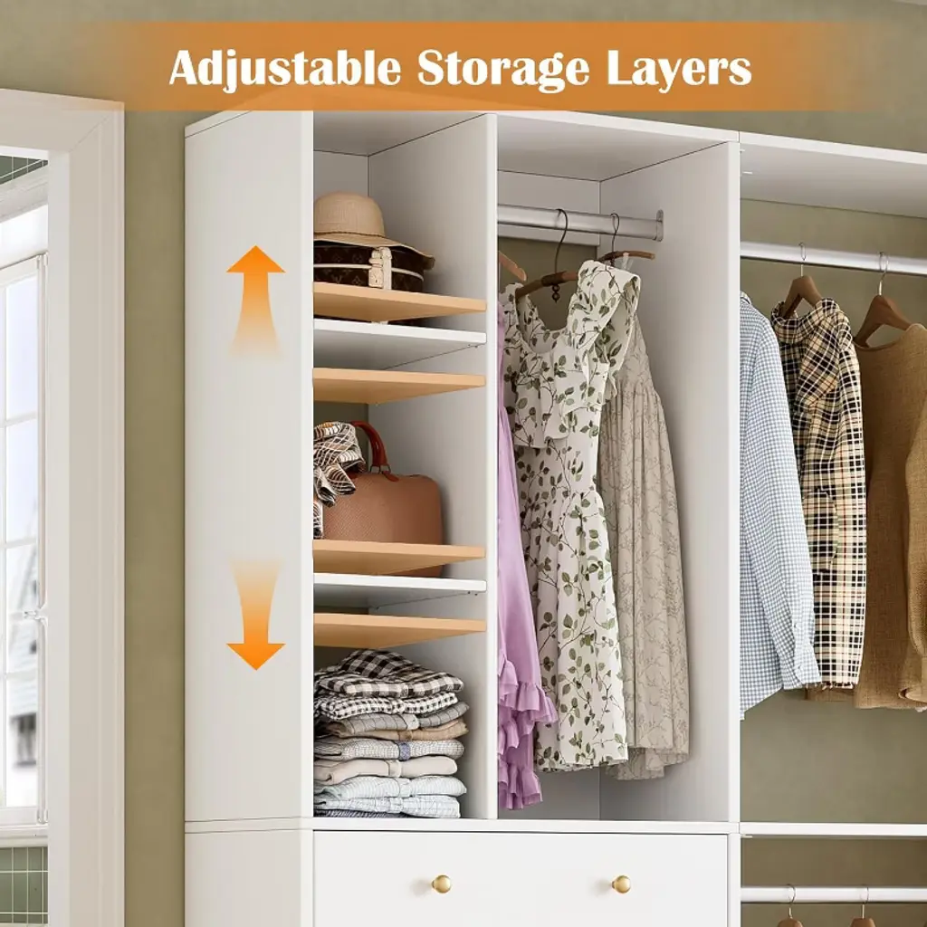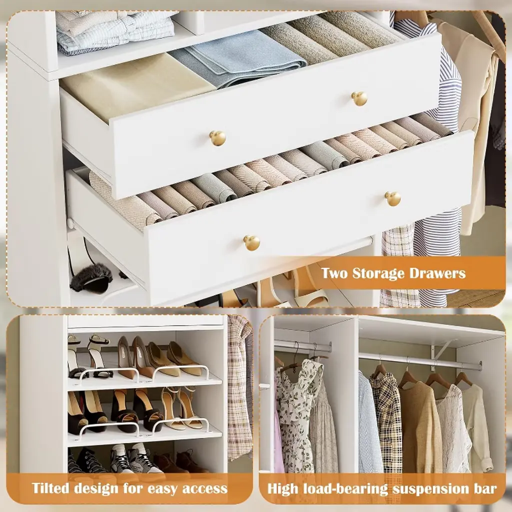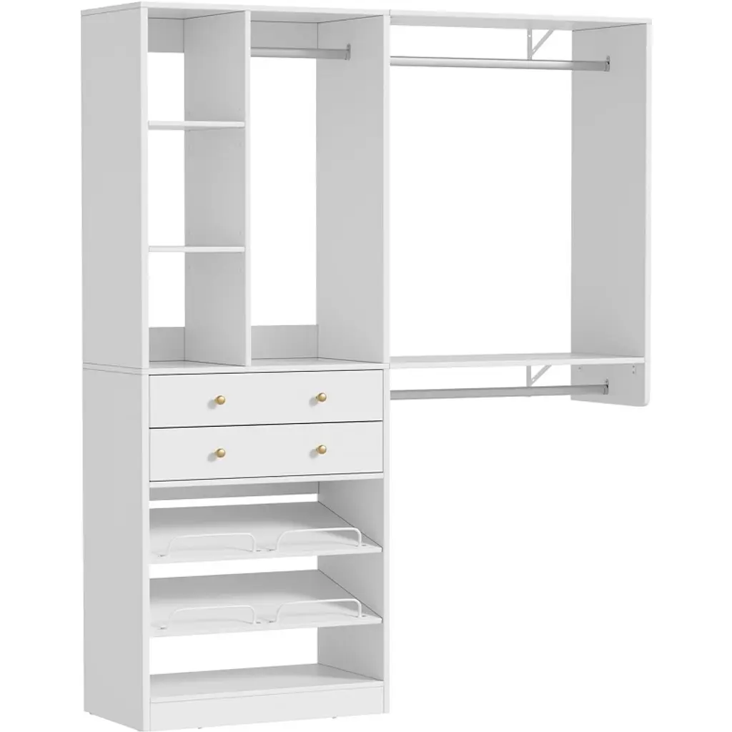 Pakasept 5Ft Closet System With 2 Wood Drawers, 59" Closet Organizer System With Shoe Rack, 3 Hanging Rods, Wardrobe Clothes Garment Rack