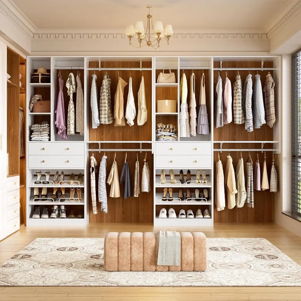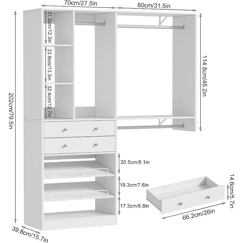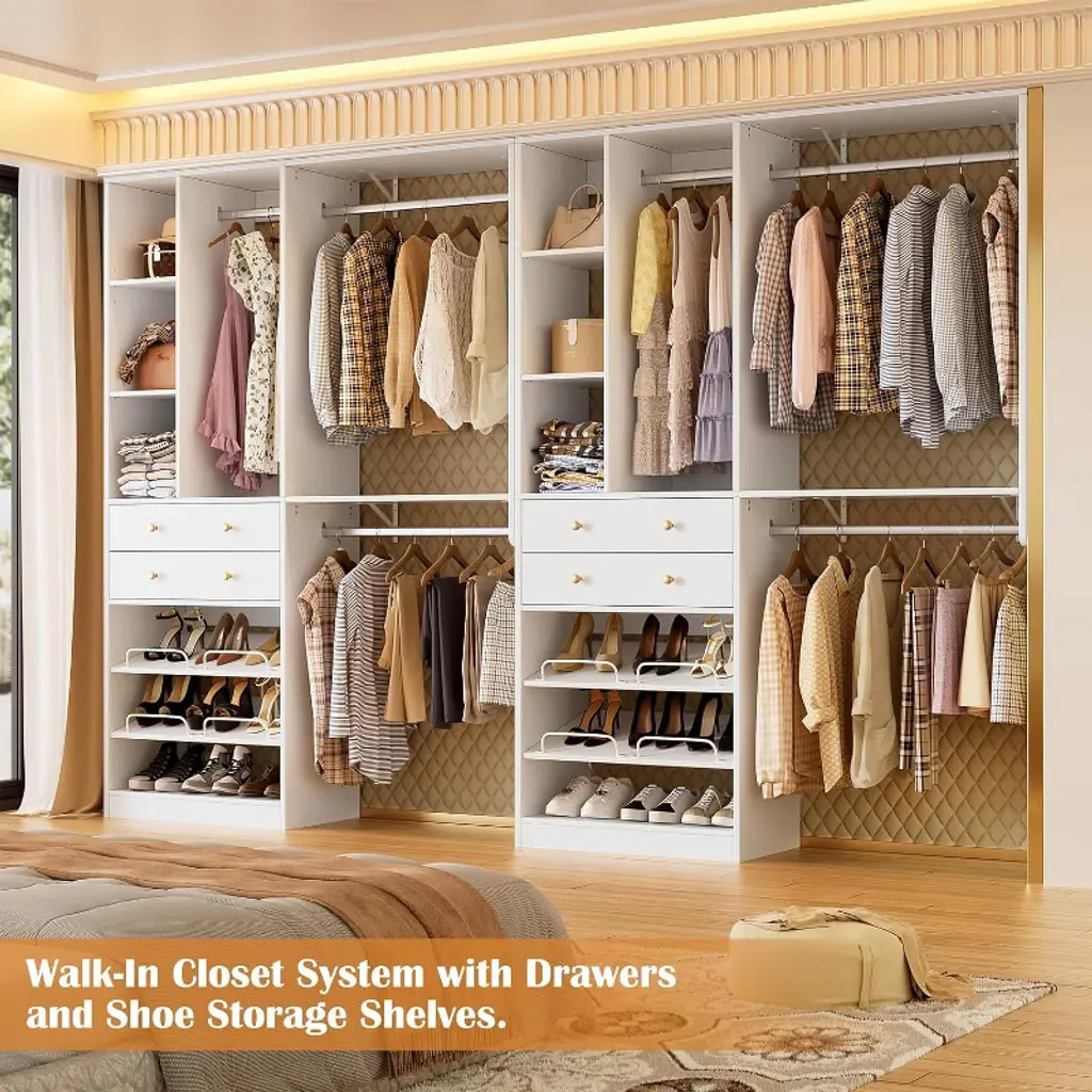 Pakasept 5Ft Closet System With 2 Wood Drawers, 59" Closet Organizer System With Shoe Rack, 3 Hanging Rods, Wardrobe Clothes Garment Rack