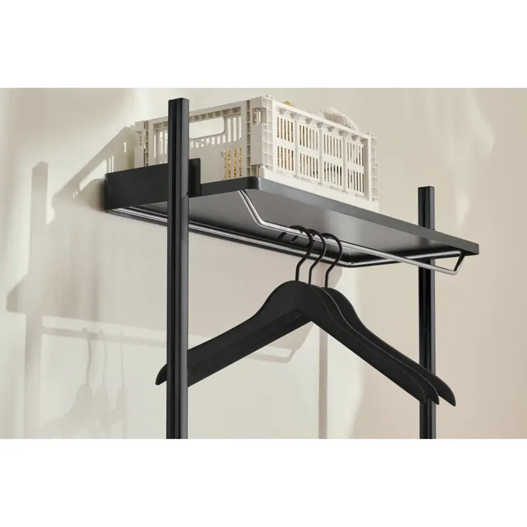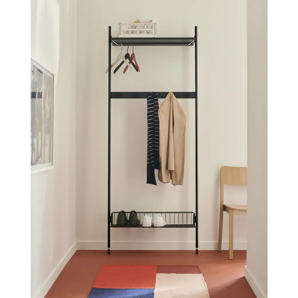 HAY's Pier System, designed by Ronan & Erwan Bouroullec, is a versatile storage solution that adapts seamlessly to the ever-changing needs of modern living. Pier System's simple structure can be easily adjusted to fit any space or requirement – whether you need to expand or downsize your storage, the modular shelf has got you covered! The Pier System 1041 wardrobe combination features a shelf with a clothing rail, a coat rack and a shoe shelf. The rail, shelf and coat rack are made of steel, while the lightweight yet durable frame is crafted from aluminum, combining elegance with functionality.