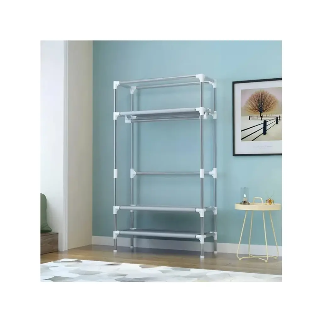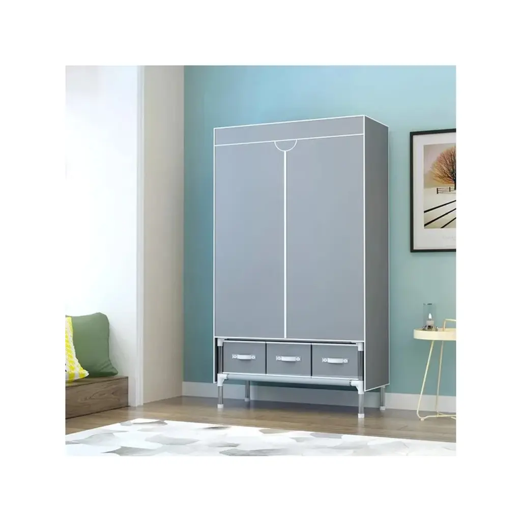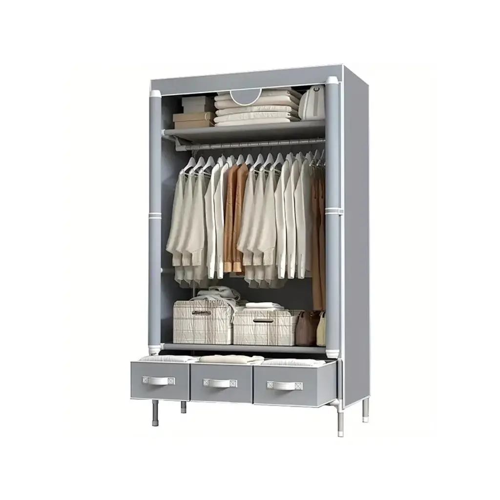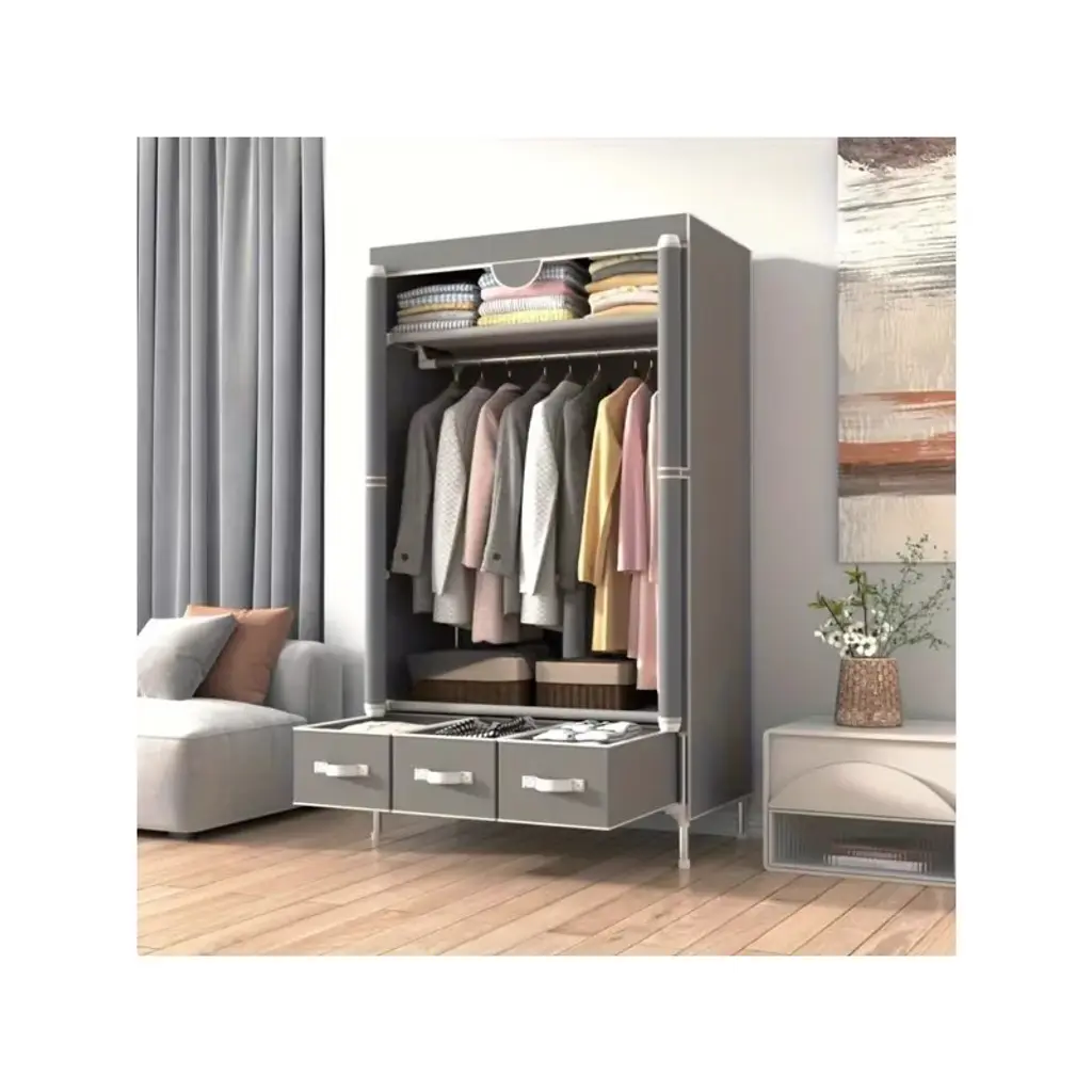 Portable and Convenient: The portable clothes closet is easy to move around, making it ideal for small spaces or for those who frequently change living arrangements.Rolling Door Design: The rolling door adds a modern touch and saves space compared to traditional swing doors. It also provides easy access to your clothes and storage.Hanging Rack and Storage: With a hanging rack, you can neatly organize your garments and keep them wrinkle-free. The three drawer boxes offer additional storage for smaller items like socks, underwear, and accessories.Non-Woven Fabric: The non-woven fabric is breathable and helps protect your clothes from dust and moisture. It is also lightweight and easy to clean.No-Tool Assembly: Assembling this wardrobe is a breeze as it requires no tools. You can quickly set it up and start organizing your clothes in no time.