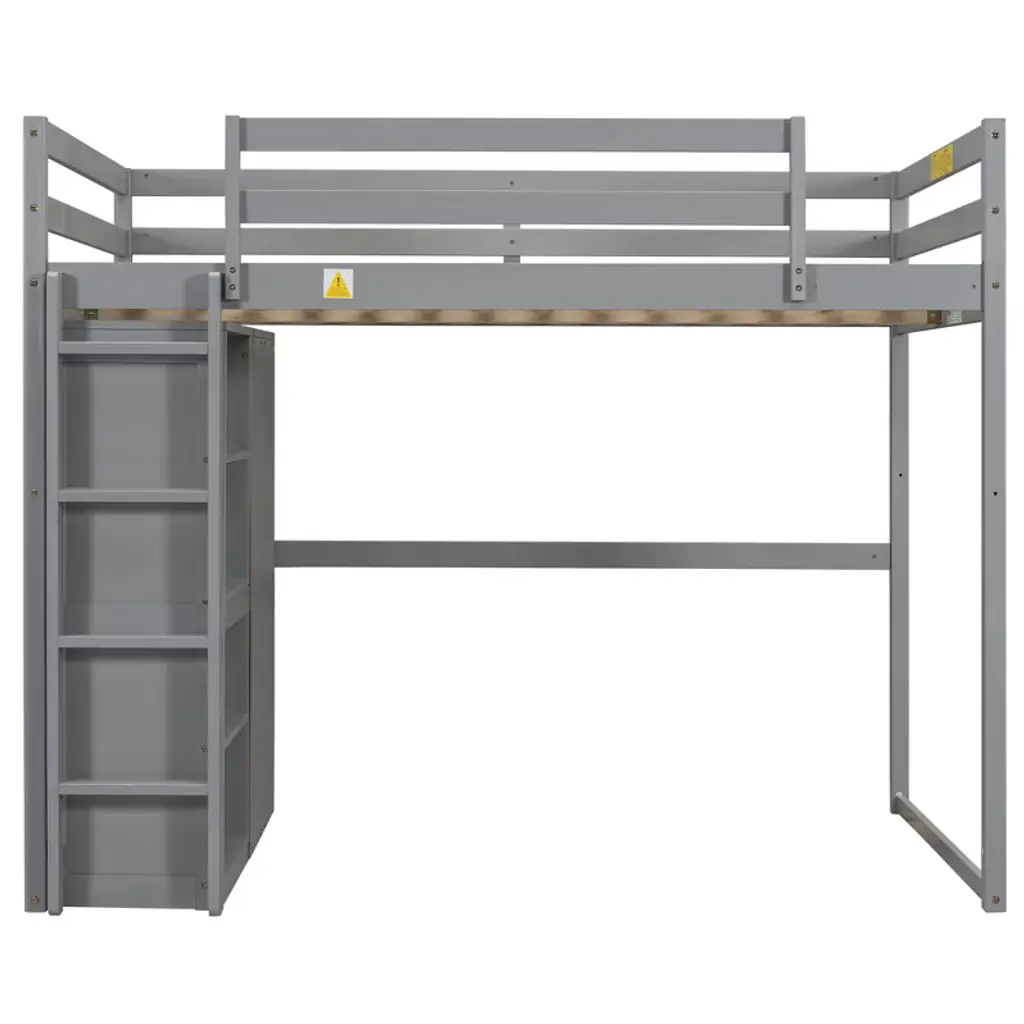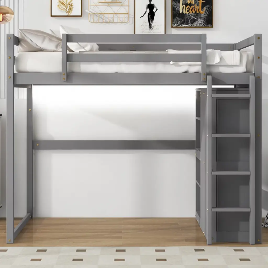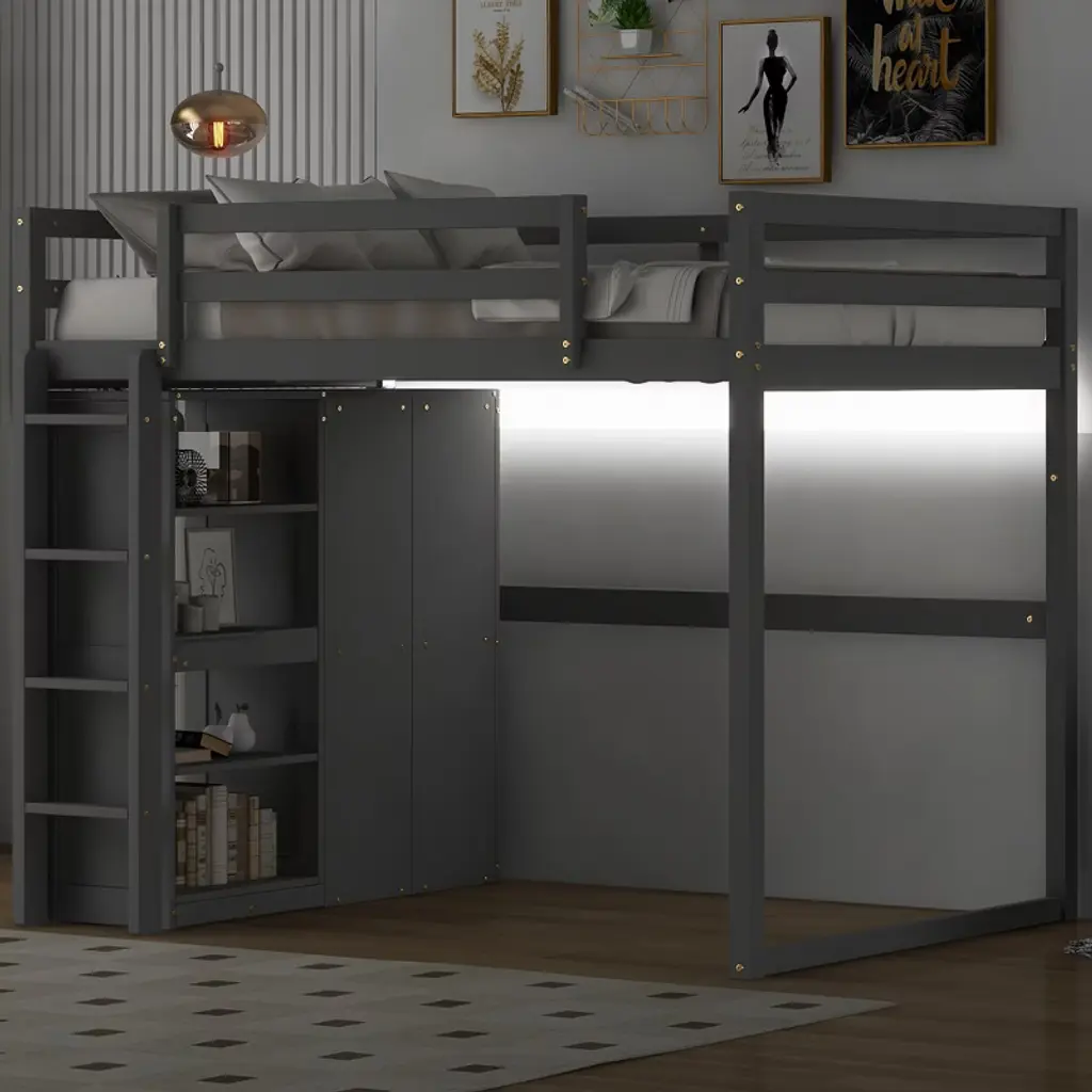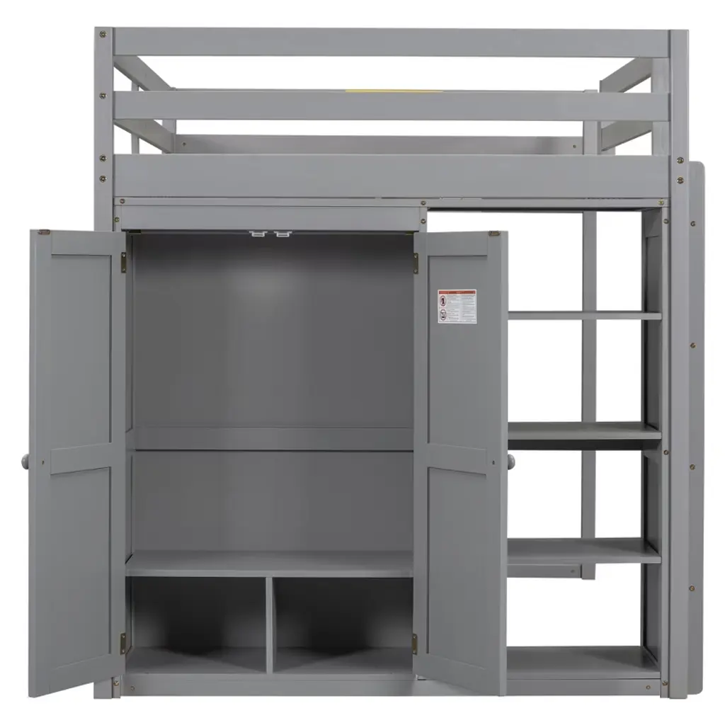 Qingmoon Full Size Loft Bed, Solid Wood Loft Bed Frame, With Wardrobe, Stairs, Storage Shelves And Safety Guard For Kids, Teens And Adults (Gray)