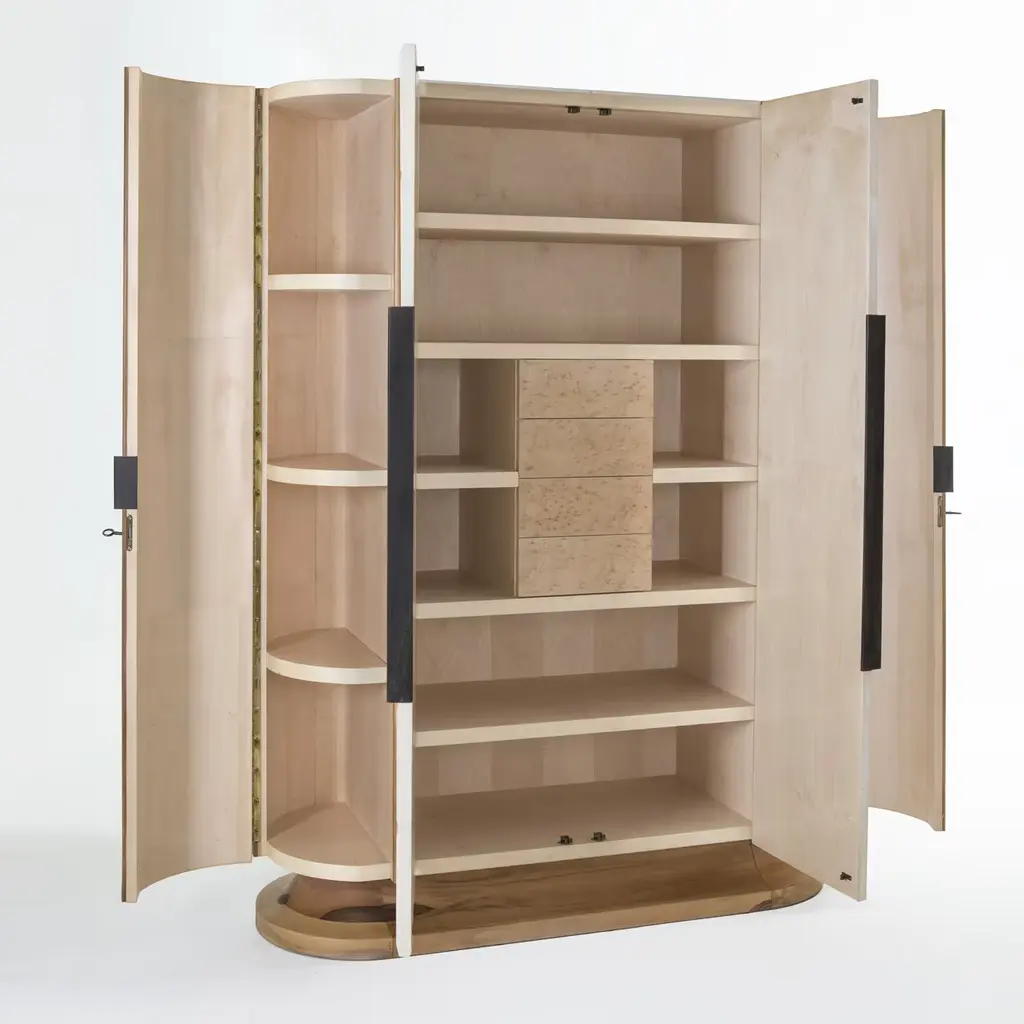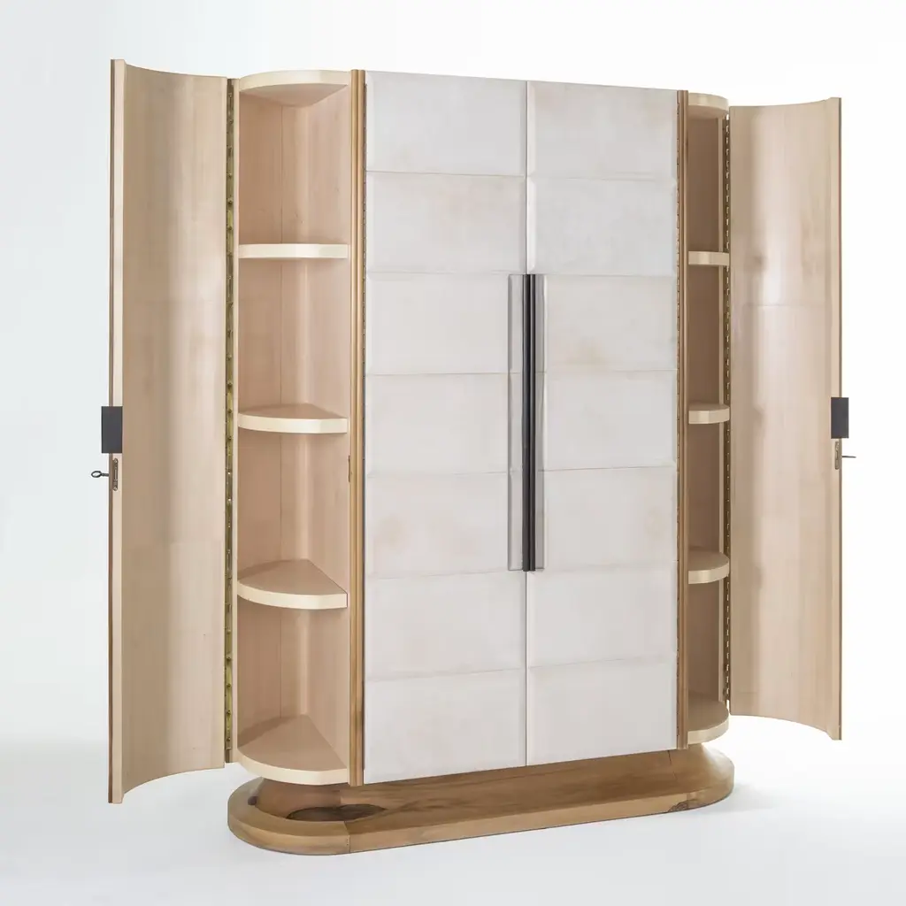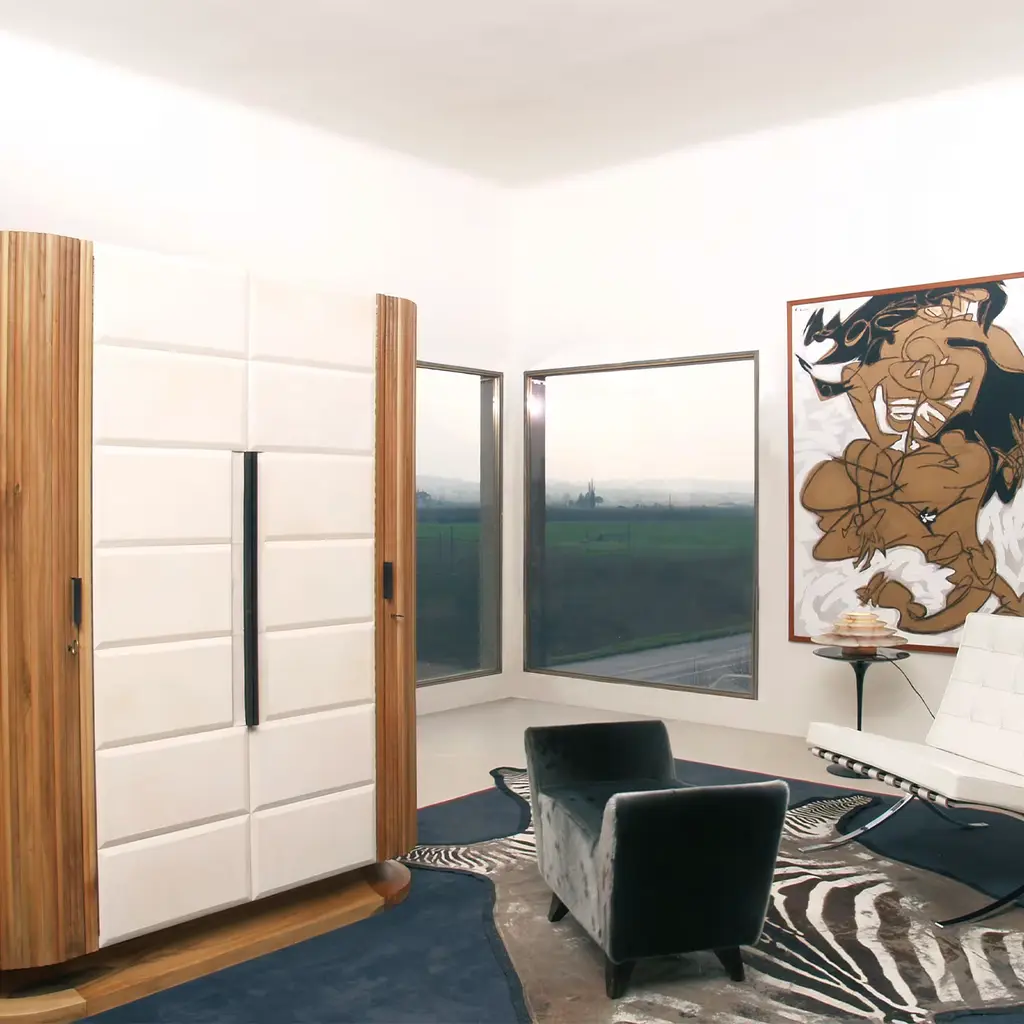 This wardrobe will provide luxurious storage for precious items. Its base is in walnut wood and its external structure is crafted in sections featuring walnut veneered sections on its two sides, and parchment covering on the frontal doors. The interior is complete with wooden shelves in maple wood with four internal drawers with maple briar-root wood fronts and solid ebony handles. The decor of any bedroom or walk-in closet will be instantly enhanced with the addition of this piece. Designed by Antonio Berdondini, year 1941.