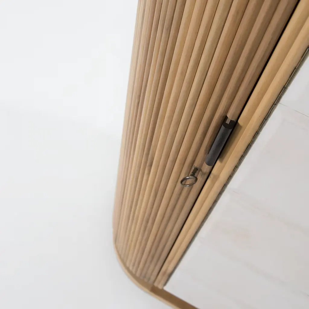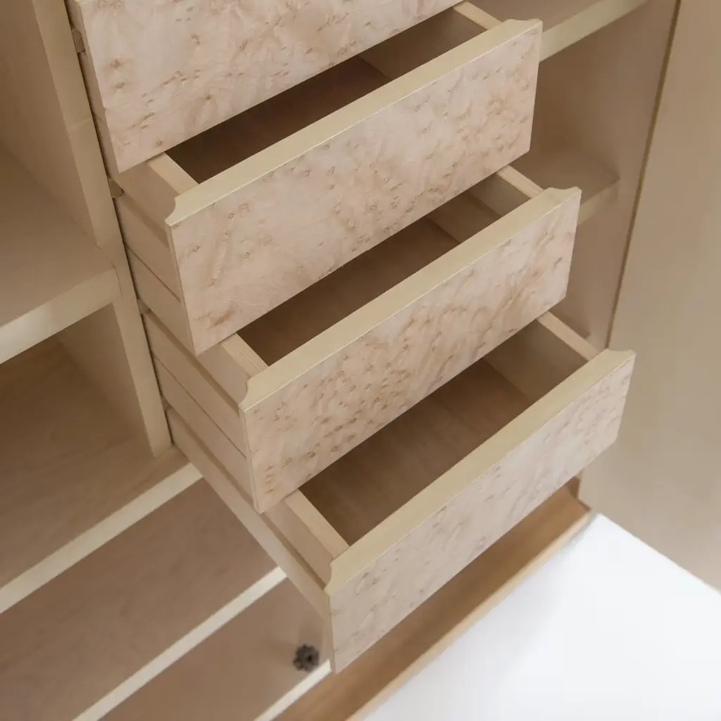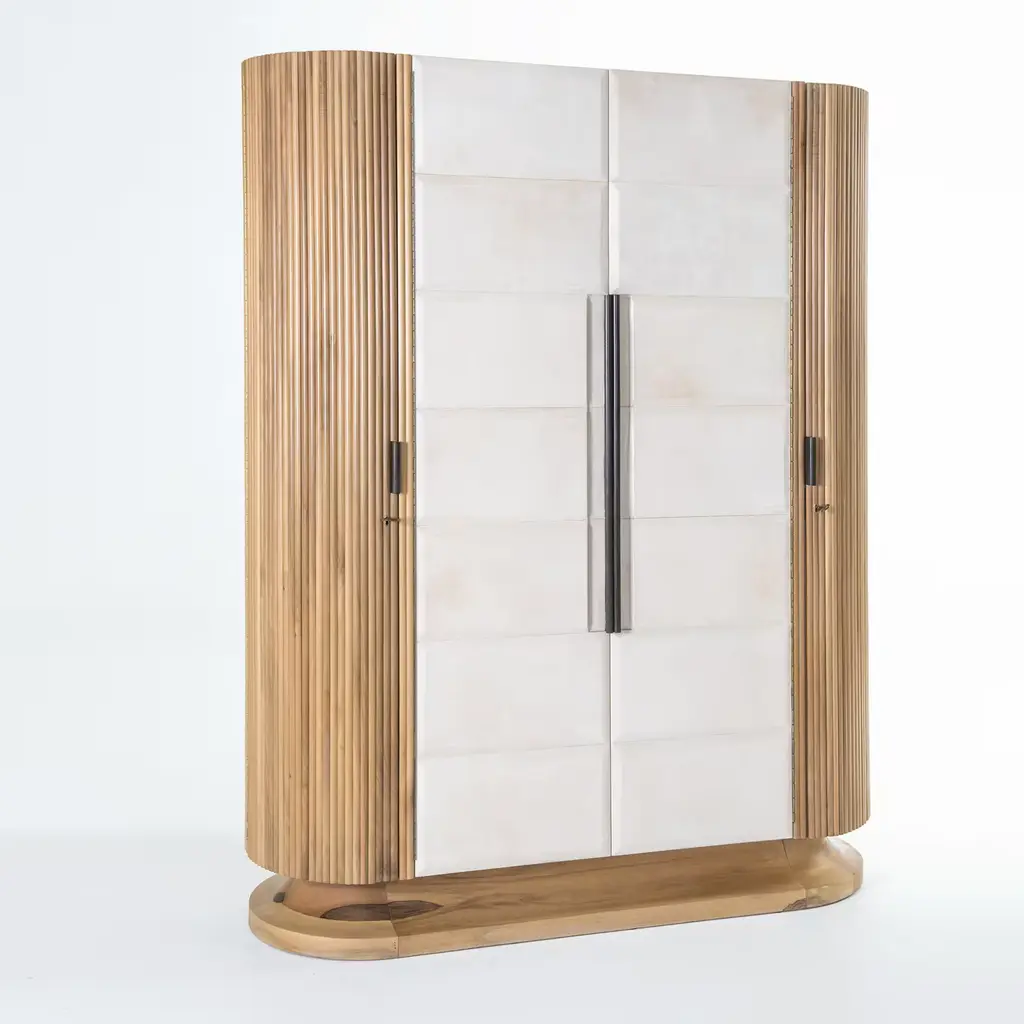 This wardrobe will provide luxurious storage for precious items. Its base is in walnut wood and its external structure is crafted in sections featuring walnut veneered sections on its two sides, and parchment covering on the frontal doors. The interior is complete with wooden shelves in maple wood with four internal drawers with maple briar-root wood fronts and solid ebony handles. The decor of any bedroom or walk-in closet will be instantly enhanced with the addition of this piece. Designed by Antonio Berdondini, year 1941.