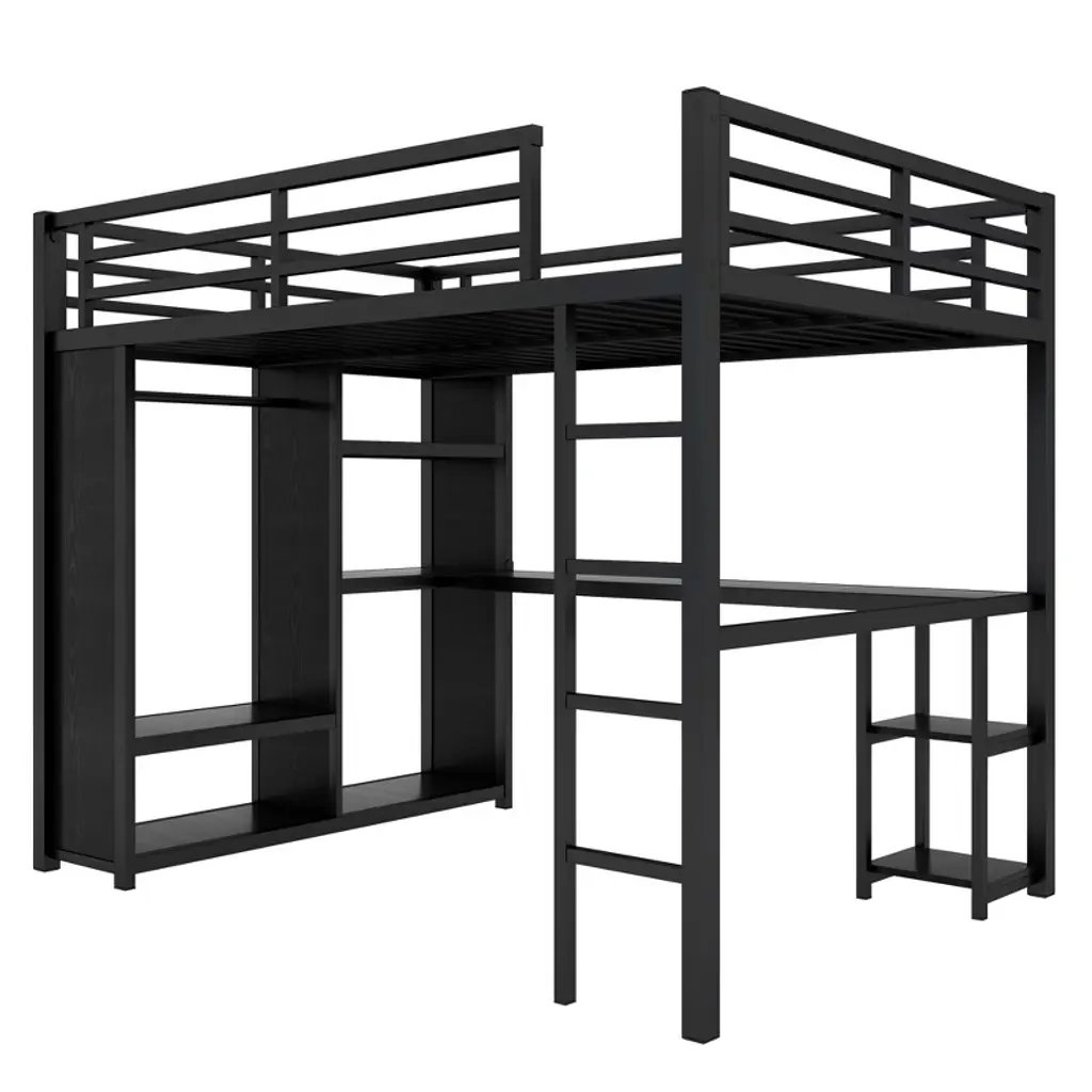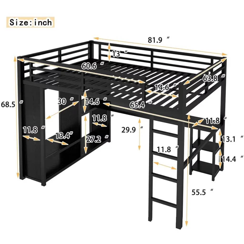 Queen Size Loft Bed Frame With Built-in Wardrobe Metal Loft Bed With Desk And Storage Shelves Black