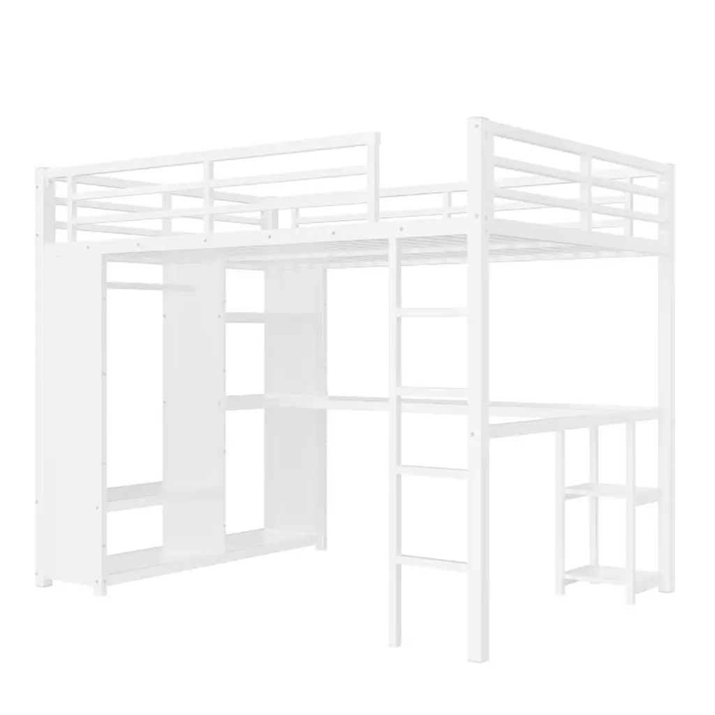 Queen Size Loft Bed Frame With Built-in Wardrobe Metal Loft Bed With Desk And Storage Shelves White