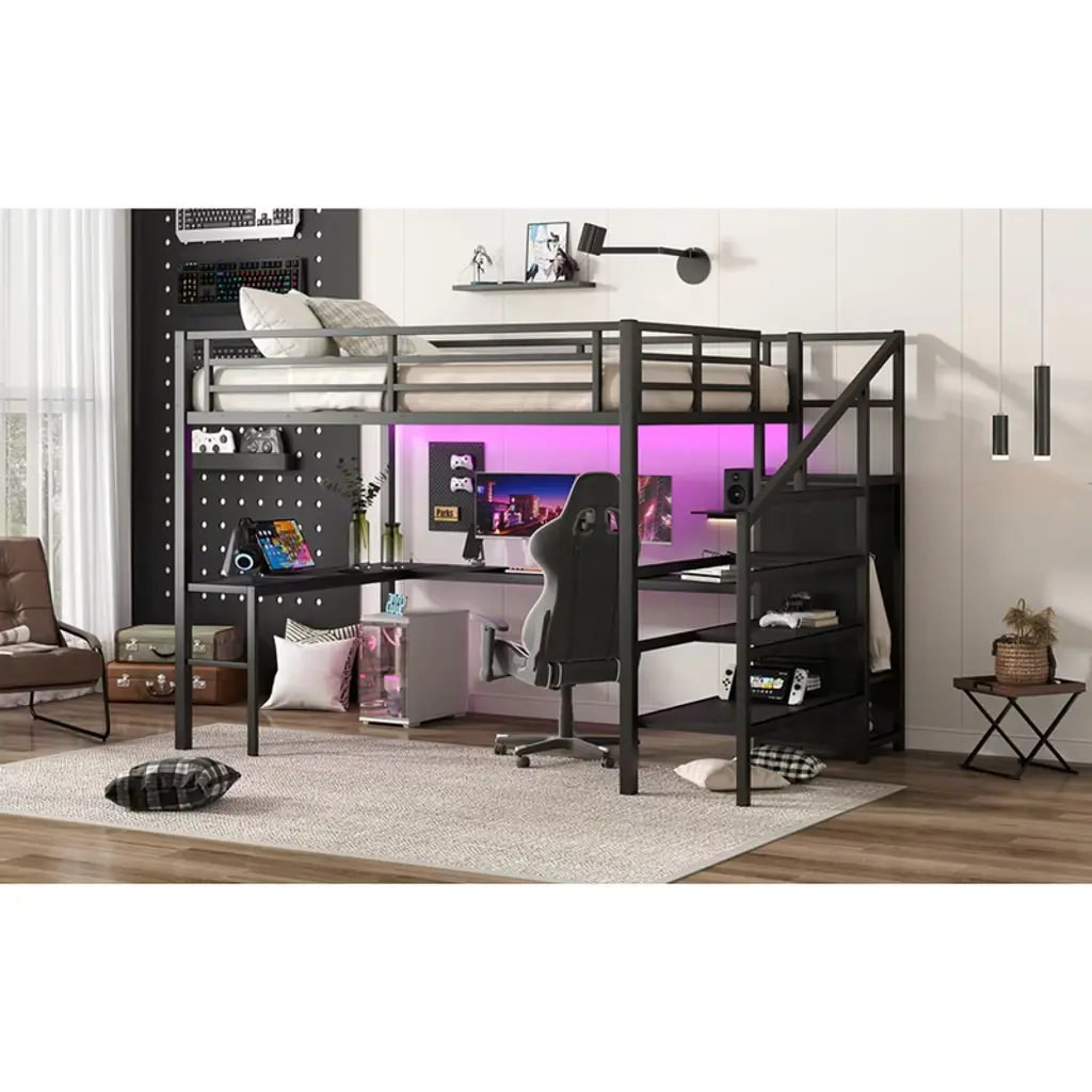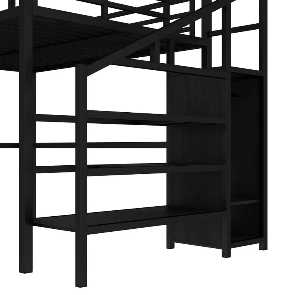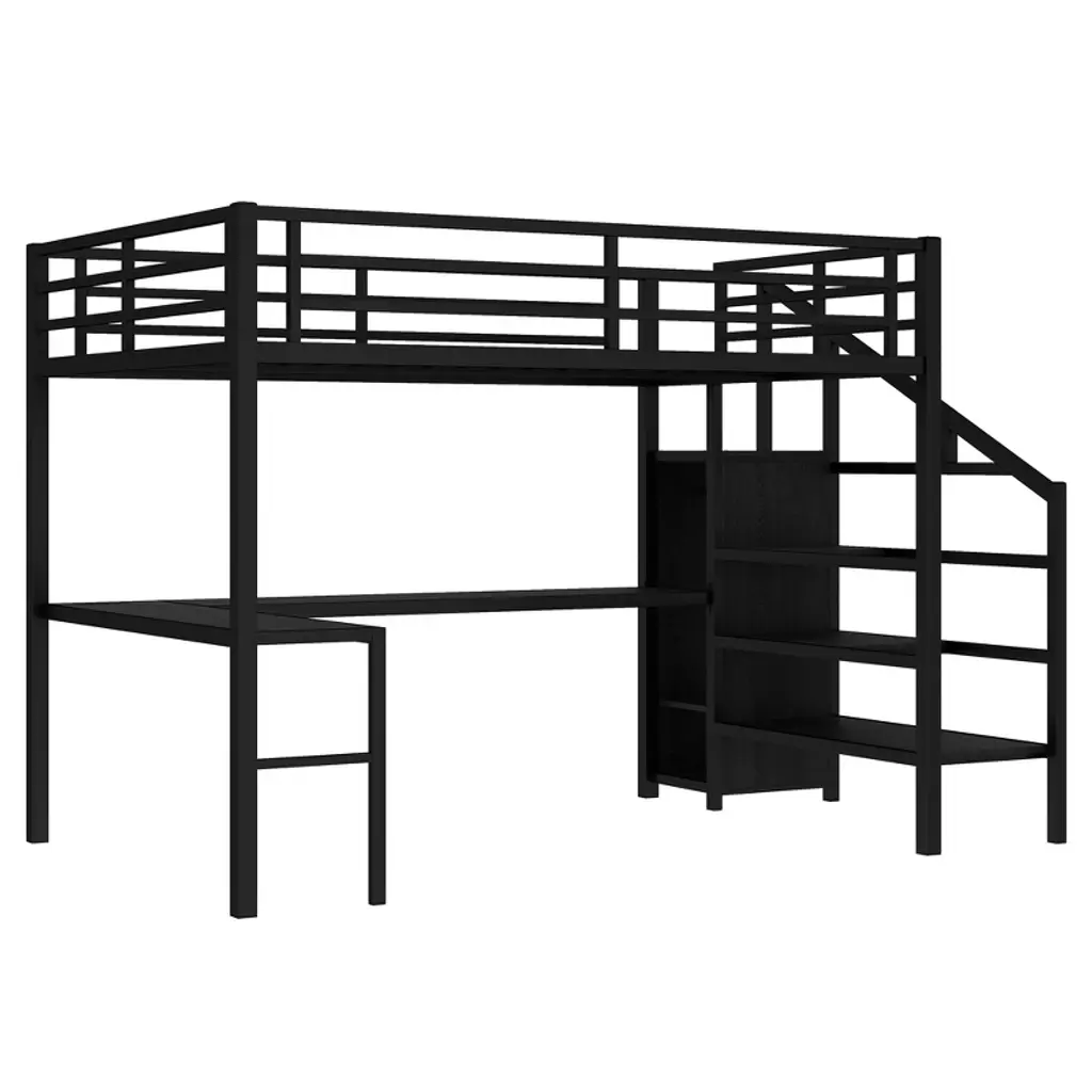 Product Features Queen Size Loft Bed with Wardrobe and Stairs - The loft bed has a wardrobe that comes with its own hanging rod and an adjustable divider at the bottom, which can be used to store quilts, storage boxes or shoes. The versatile built-in staircase can also be used as storage space and can be fitted left or right as required.Space-Saving Loft Bed & Workspace - This metal loft bed has a cozy sleeping space, and a spacious and practical L-shaped desk underneath that can be used as a workbench, reading area, etc. where you can create your own little world. The space-saving design adds a touch of elegance to any bedroom.Loft Bed with USB and LED - The queen size bed's desk comes with a USB charging station for charging electronics that is convenience to your daily life.The LED light strip adds a sense of ambiance to your room while making it easy for you to wake up at night.Solid Metal Loft Bed - The bed frame is made of metal for strength and stability, and the upper bunk can hold up to 350 pounds. Queen size loft bed frame comes with sturdy stairs so kids can safely climb to the upper bunk and full-length guardrails keep kids safe while sleeping.Easy Assembly - Some assembly will be required, each order comes with clear and detailed instructions and numbered parts with all the necessary tools so you can get your bed assembled quickly. Notes: This metal loft bed will be packaged in two boxes, excluding the mattress! Descriptions If you need a versatile bed, then our metal loft beds are the perfect choice. The queen-size upper bed provides you with plenty of sleeping space, and the desk below is the perfect area to work and study. In addition, the queen size loft bed comes with a built-in closet that can be used for storing your daily clothes and supplies, and the interchangeable left and right staircases allow for storage while keeping it sturdy. The USB and LED lights are designed to provide you with great convenience. Quality metal materials and a minimalist black design make this loft bed an eye-catcher in the bedroom. Description & Dimensions Product Type: Metal Loft BedMaterial: MetalSize: QueenNumbers of Package: 2Overall Product Dimension: 98.43''L x 62.99''W x 68.90''HOverall Product Weight: 179.46 LBSWeight Capacity: 350 LBSBox Spring Required: NoRecommend Bed Mattress Thickness: 6''Package Dimension & Weight: Please refer to the Specification