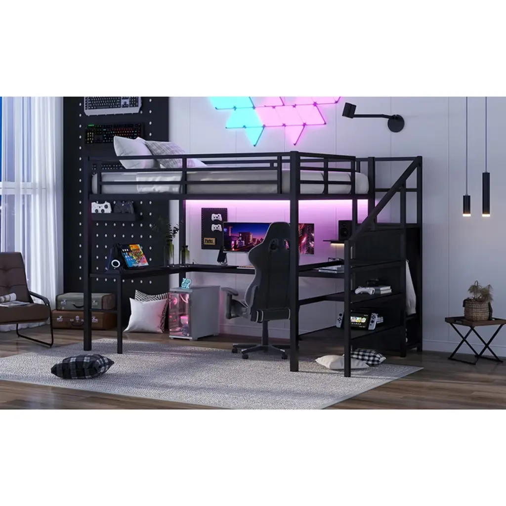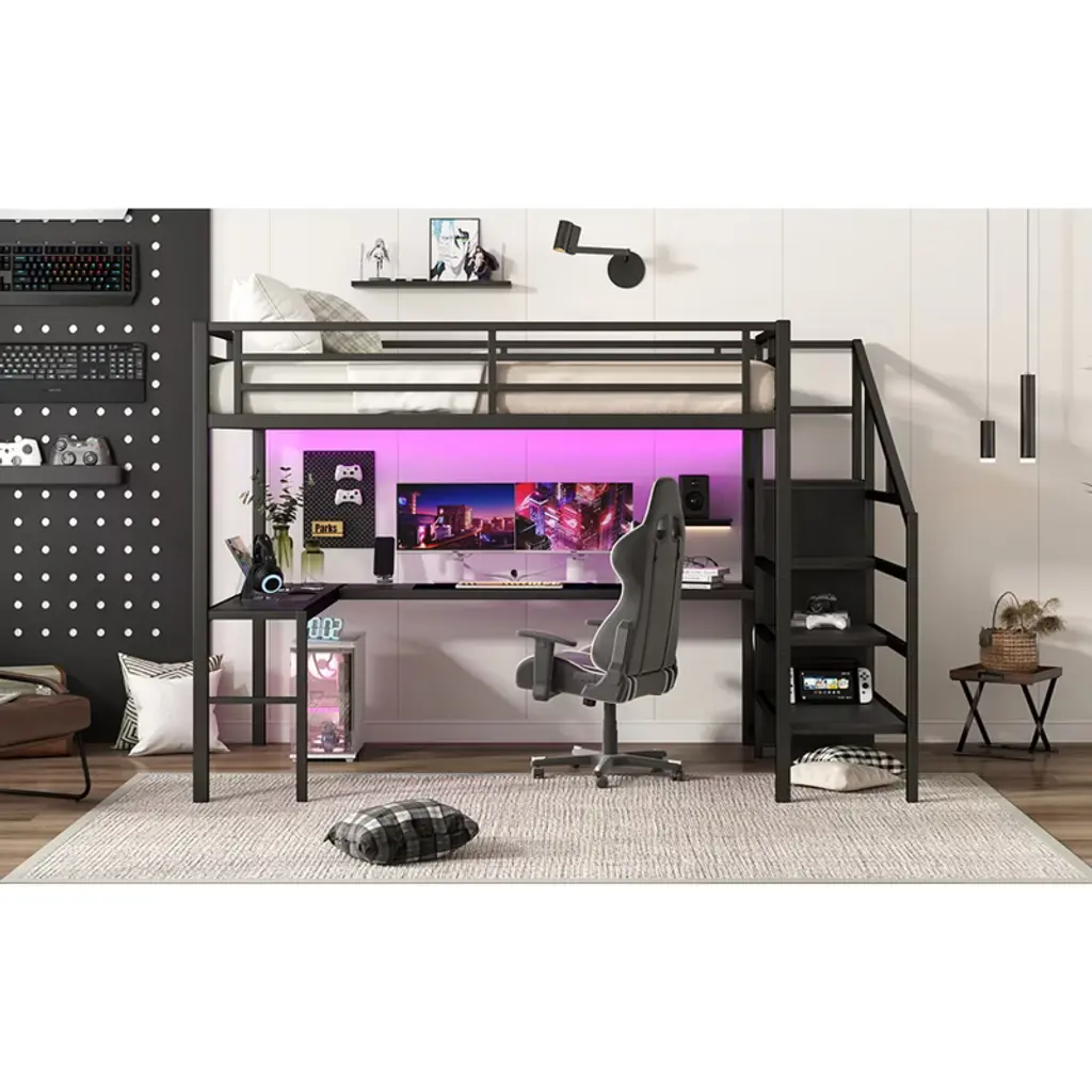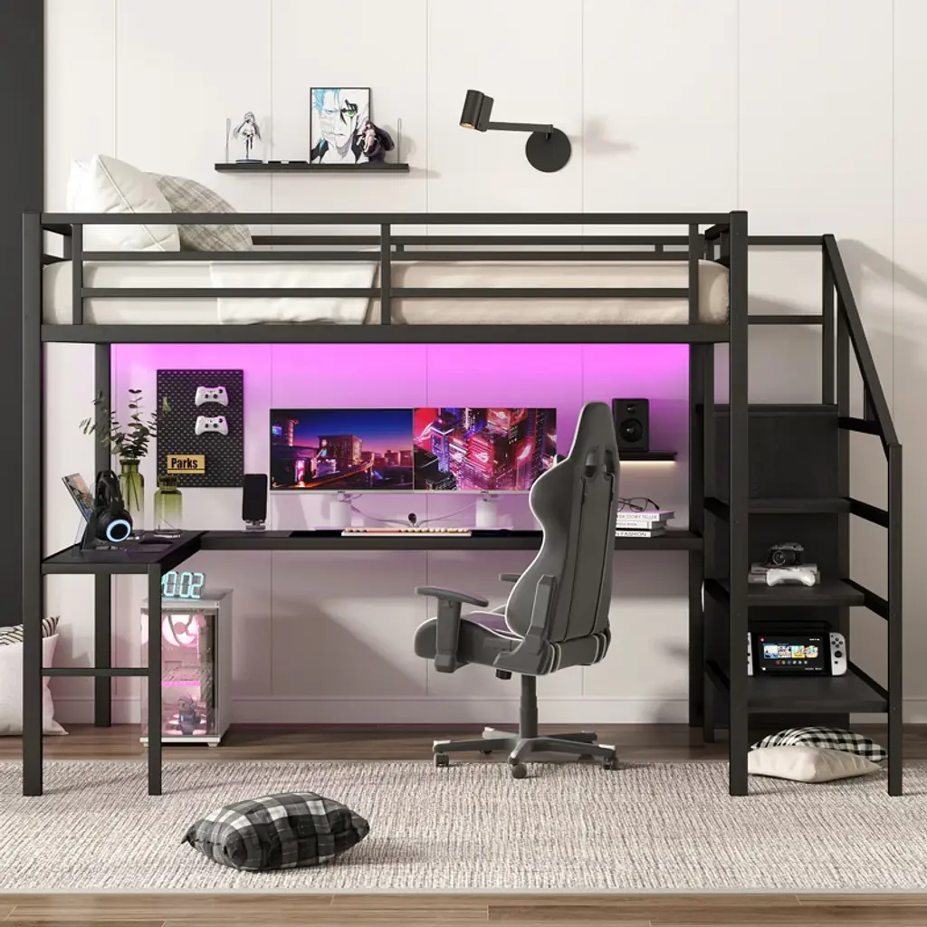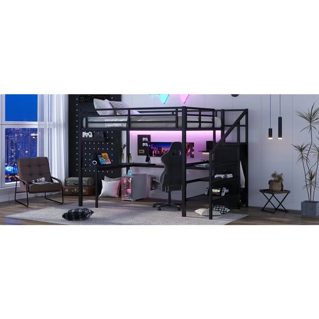 Product Features Queen Size Loft Bed with Wardrobe and Stairs - The loft bed has a wardrobe that comes with its own hanging rod and an adjustable divider at the bottom, which can be used to store quilts, storage boxes or shoes. The versatile built-in staircase can also be used as storage space and can be fitted left or right as required.Space-Saving Loft Bed & Workspace - This metal loft bed has a cozy sleeping space, and a spacious and practical L-shaped desk underneath that can be used as a workbench, reading area, etc. where you can create your own little world. The space-saving design adds a touch of elegance to any bedroom.Loft Bed with USB and LED - The queen size bed's desk comes with a USB charging station for charging electronics that is convenience to your daily life.The LED light strip adds a sense of ambiance to your room while making it easy for you to wake up at night.Solid Metal Loft Bed - The bed frame is made of metal for strength and stability, and the upper bunk can hold up to 350 pounds. Queen size loft bed frame comes with sturdy stairs so kids can safely climb to the upper bunk and full-length guardrails keep kids safe while sleeping.Easy Assembly - Some assembly will be required, each order comes with clear and detailed instructions and numbered parts with all the necessary tools so you can get your bed assembled quickly. Notes: This metal loft bed will be packaged in two boxes, excluding the mattress! Descriptions If you need a versatile bed, then our metal loft beds are the perfect choice. The queen-size upper bed provides you with plenty of sleeping space, and the desk below is the perfect area to work and study. In addition, the queen size loft bed comes with a built-in closet that can be used for storing your daily clothes and supplies, and the interchangeable left and right staircases allow for storage while keeping it sturdy. The USB and LED lights are designed to provide you with great convenience. Quality metal materials and a minimalist black design make this loft bed an eye-catcher in the bedroom. Description & Dimensions Product Type: Metal Loft BedMaterial: MetalSize: QueenNumbers of Package: 2Overall Product Dimension: 98.43''L x 62.99''W x 68.90''HOverall Product Weight: 179.46 LBSWeight Capacity: 350 LBSBox Spring Required: NoRecommend Bed Mattress Thickness: 6''Package Dimension & Weight: Please refer to the Specification
