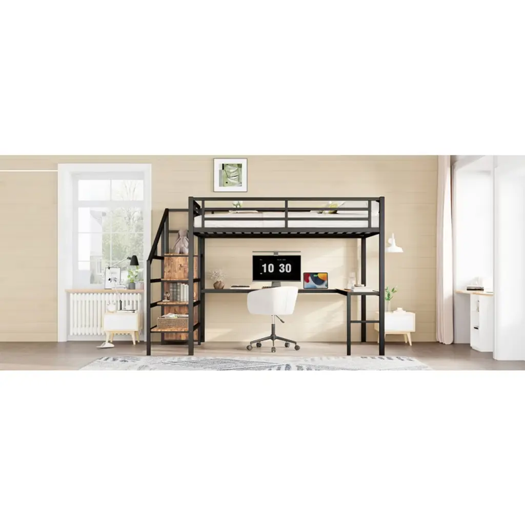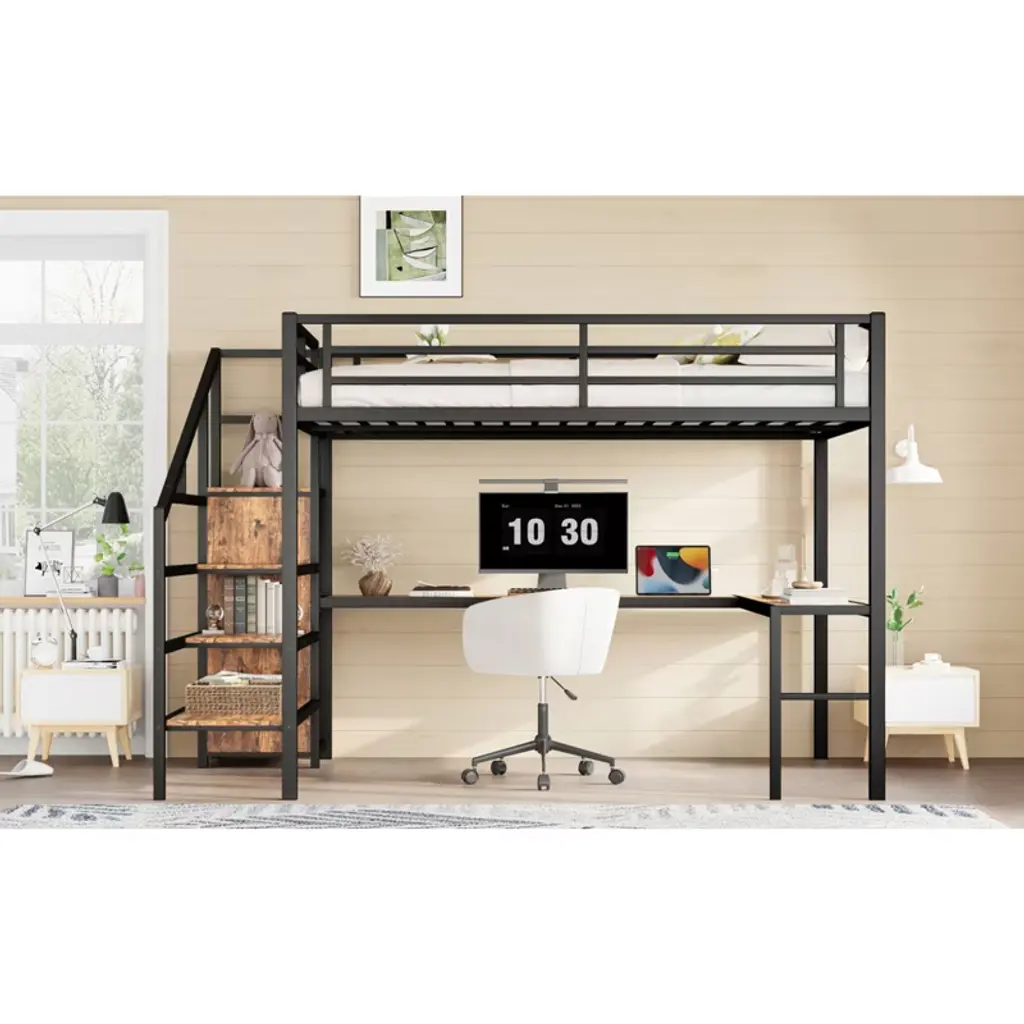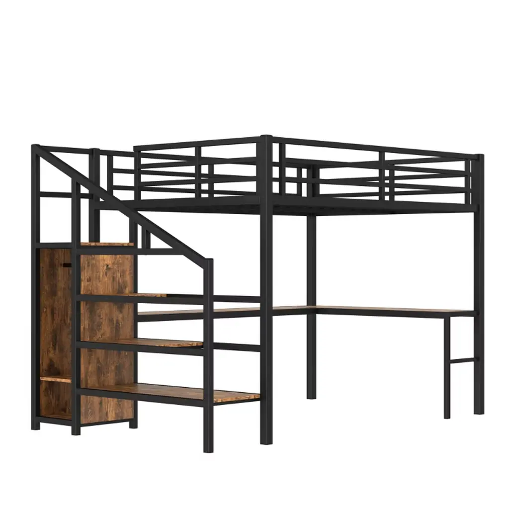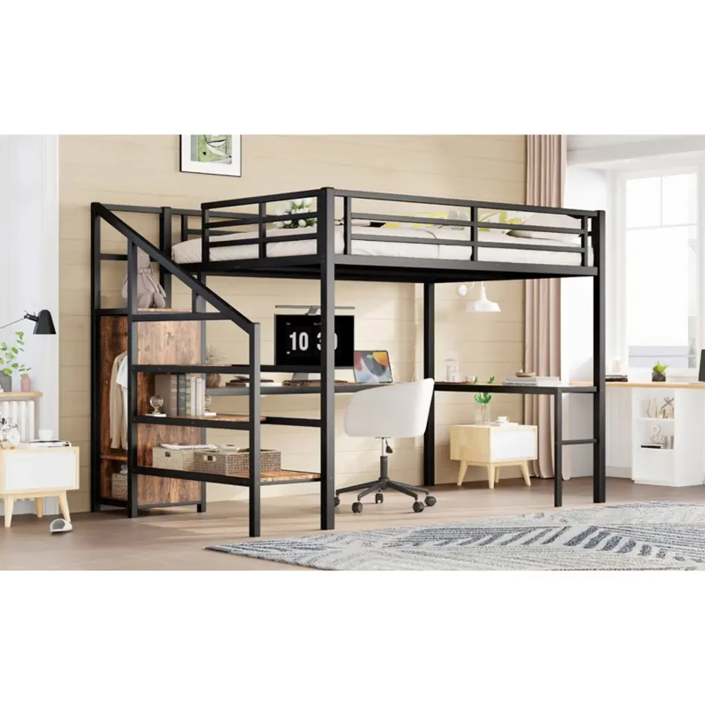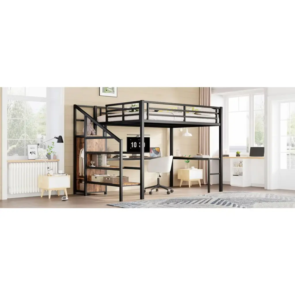 Product Features Queen Size Loft Bed with Wardrobe and Stairs - The loft bed has a wardrobe that comes with its own hanging rod and an adjustable divider at the bottom, which can be used to store quilts, storage boxes or shoes. The versatile built-in staircase can also be used as storage space and can be fitted left or right as required.Space-Saving Loft Bed & Workspace - This metal loft bed has a cozy sleeping space, and a spacious and practical L-shaped desk underneath that can be used as a workbench, reading area, etc. where you can create your own little world. The space-saving design adds a touch of elegance to any bedroom.Loft Bed with USB and LED - The queen size bed's desk comes with a USB charging station for charging electronics that is convenience to your daily life.The LED light strip adds a sense of ambiance to your room while making it easy for you to wake up at night.Solid Metal Loft Bed - The bed frame is made of metal for strength and stability, and the upper bunk can hold up to 350 pounds. Queen size loft bed frame comes with sturdy stairs so kids can safely climb to the upper bunk and full-length guardrails keep kids safe while sleeping.Easy Assembly - Some assembly will be required, each order comes with clear and detailed instructions and numbered parts with all the necessary tools so you can get your bed assembled quickly. Notes: This metal loft bed will be packaged in two boxes, excluding the mattress! Descriptions If you need a versatile bed, then our metal loft beds are the perfect choice. The queen-size upper bed provides you with plenty of sleeping space, and the desk below is the perfect area to work and study. In addition, the queen size loft bed comes with a built-in closet that can be used for storing your daily clothes and supplies, and the interchangeable left and right staircases allow for storage while keeping it sturdy. The USB and LED lights are designed to provide you with great convenience. Quality metal materials and a minimalist black design make this loft bed an eye-catcher in the bedroom. Description & Dimensions Product Type: Metal Loft BedMaterial: MetalSize: QueenNumbers of Package: 2Overall Product Dimension: 98.43''L x 62.99''W x 68.90''HOverall Product Weight: 179.46 LBSWeight Capacity: 350 LBSBox Spring Required: NoRecommend Bed Mattress Thickness: 6''Package Dimension & Weight: Please refer to the Specification