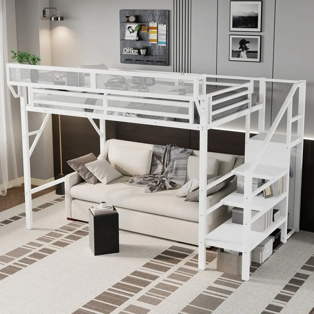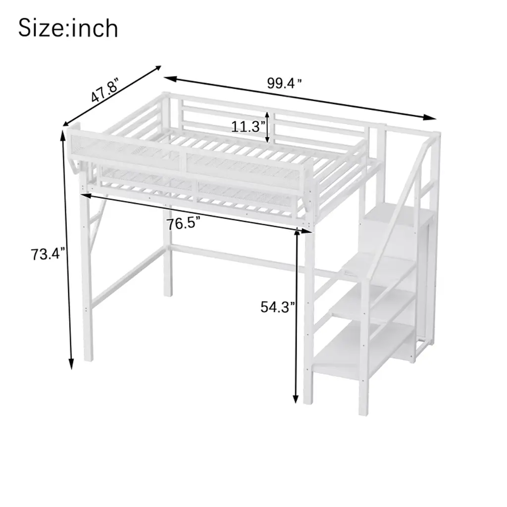 ¡¾Twin XL Loft Bed with Storage Shelves for Upper¡¿The twin metal loft bed features a storage shelf next to the upper bed, providing extra storage space. This shelf is perfect for keeping books, gadgets, or small items within easy reach. The shelf have mesh around which prevent thing falling down. It adds functionality without compromising space. ¡¾Metal Twin XL Loft Bed with Staircase¡¿The metal twin size loft bed come with staircase includes built-in storage compartments, making it easy to store items like shoes, toys, or blankets. The steps ensure safe and convenient access to the upper bed, enhancing both practicality and safety. The stairs can be installed on either right side or left side. ¡¾Under Space of Metal Loft Bed¡¿54.3 inch under the twin loft bed creates extra space for multi-functional use. You can place storage cabinets, a small sofa, or a desk underneath, maximizing the use of limited space and creating a versatile living area. ¡¾Metal Loft Bed with Wardrobe¡¿The staircase features a built-in wardrobe function, providing additional storage for clothes and accessories. This clever design adds more functionality to the metal full loft bed, making it a perfect solution for small bedrooms. ¡¾Durable and Sturdy Construction¡¿The twin XL size metal loft bed made from high-quality metal, this loft bed is durable and sturdy. The metal material ensures long-lasting use and stability, while also offering a sleek and modern look that fits well in any bedroom.Weight capacity 300LBS