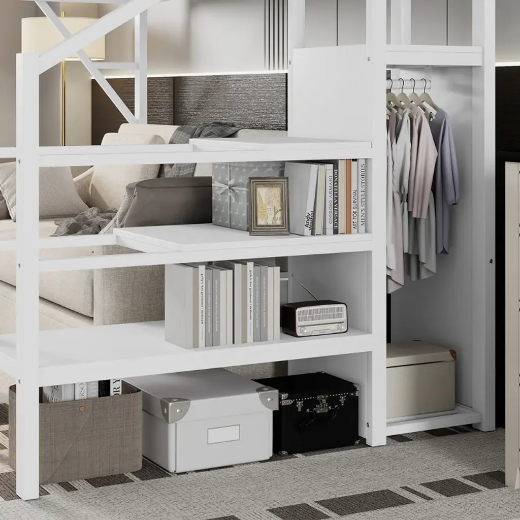 Racxily Twin Xl Size Loft Bed With Stairs, Metal Full Loft Bed With Storage Shelves, High Loft Bed With Wardrobe For Kids Teens,white