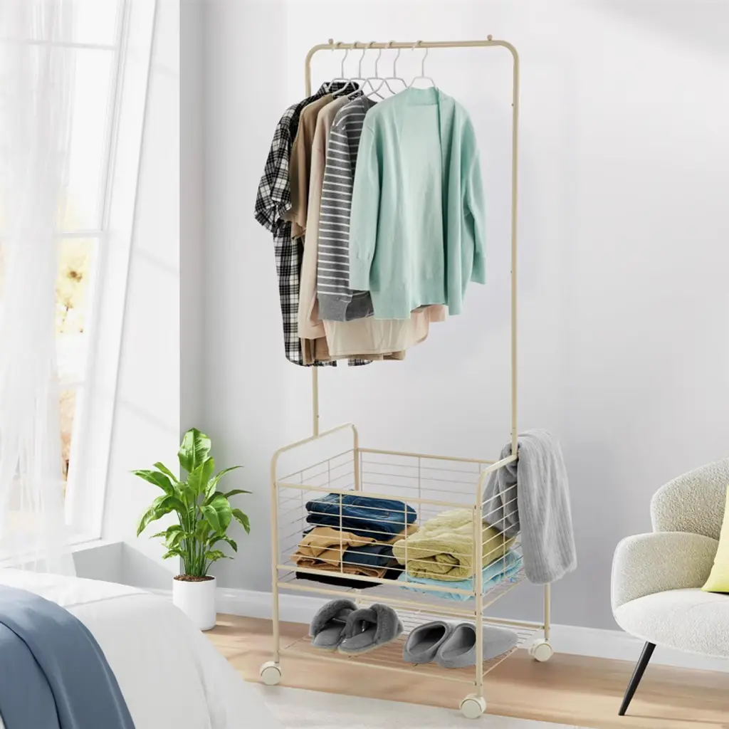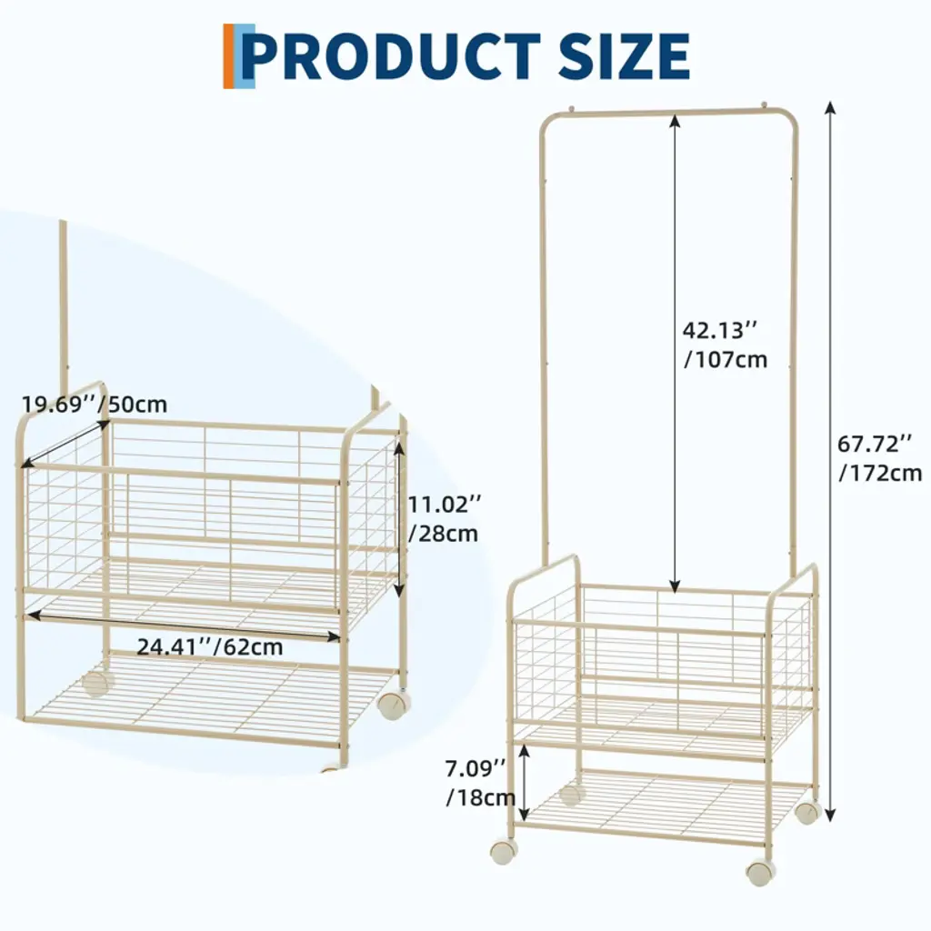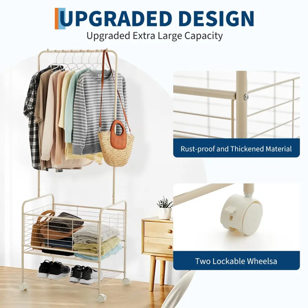 Rolling Clothes Rack With Storage Basket And Shelves, Portable Wardrobe Garment Rack For Bedroom And Laundry, Beige