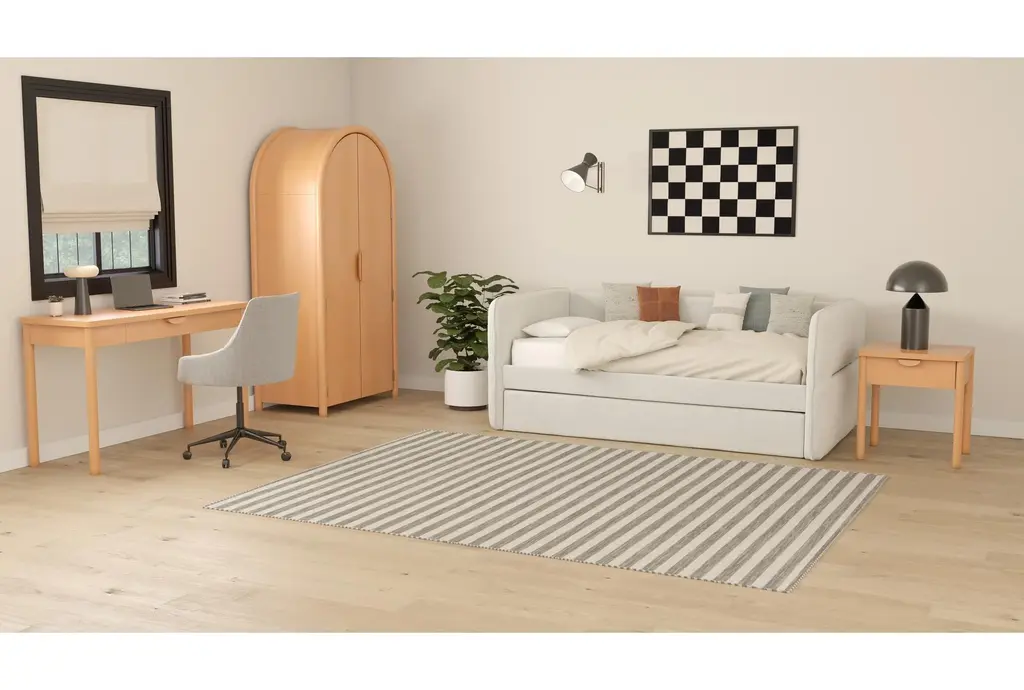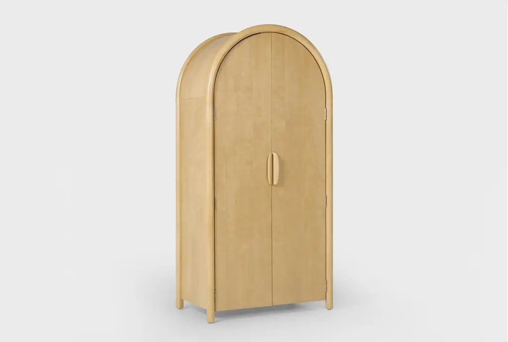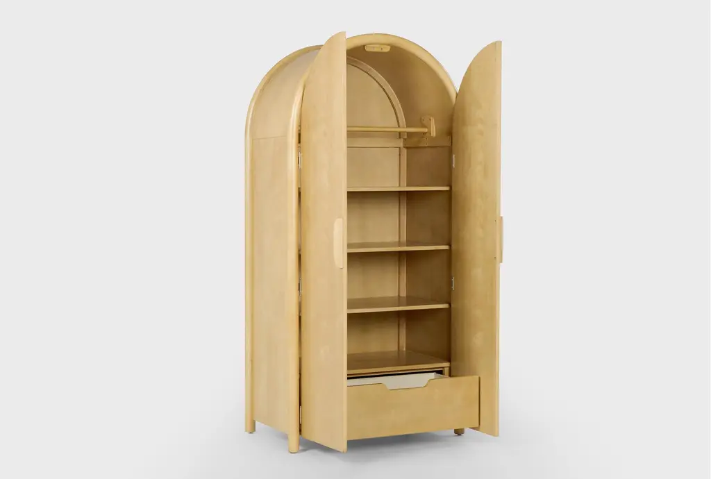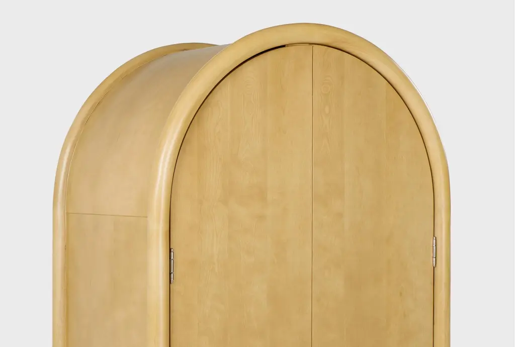 Enhance your bedroom with the Seren 1-Drawer 2-Door Arched Bedroom Armoire Closet. This Scandinavian-style piece features a natural wood finish that seamlessly blends with various interior designs. Perfect for organizing and storing your belongings, it offers both functionality and aesthetic appeal.