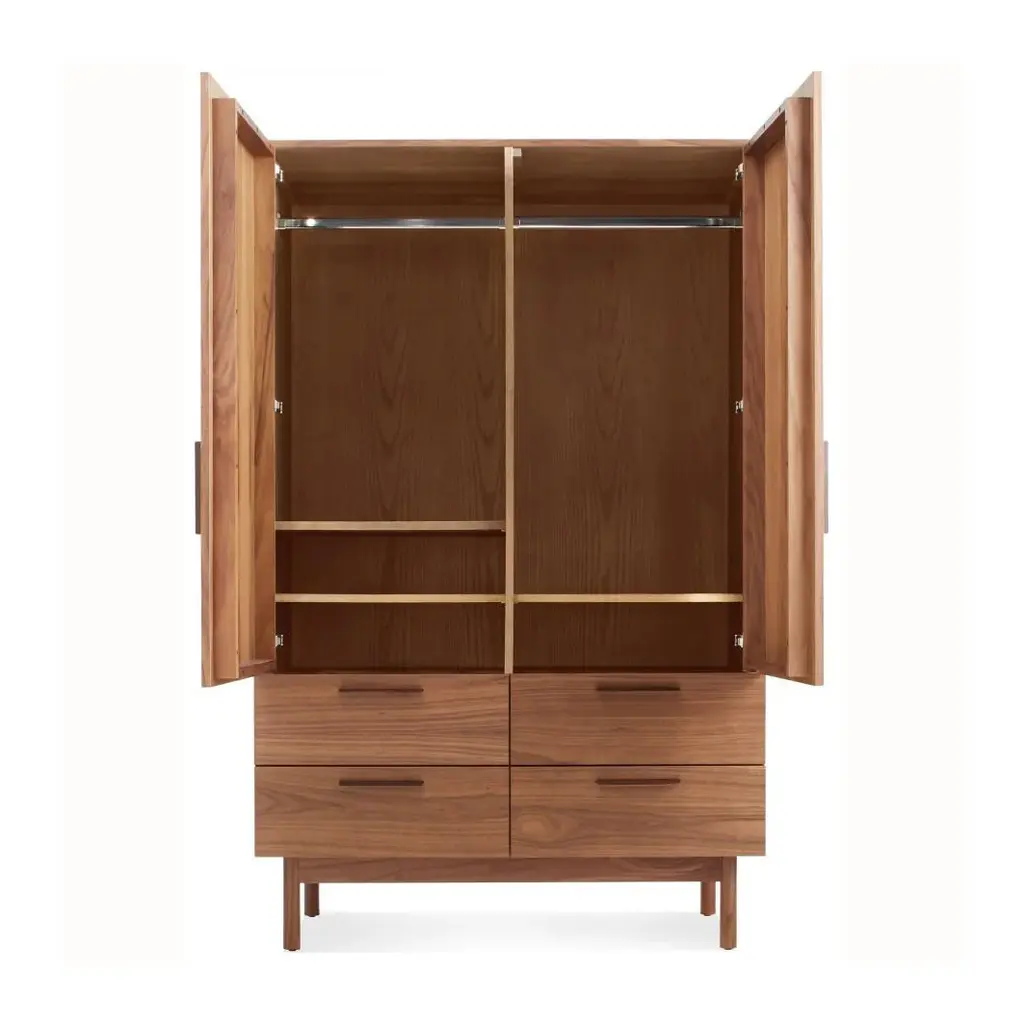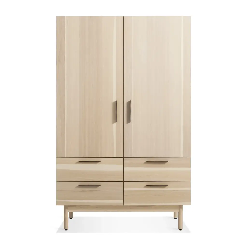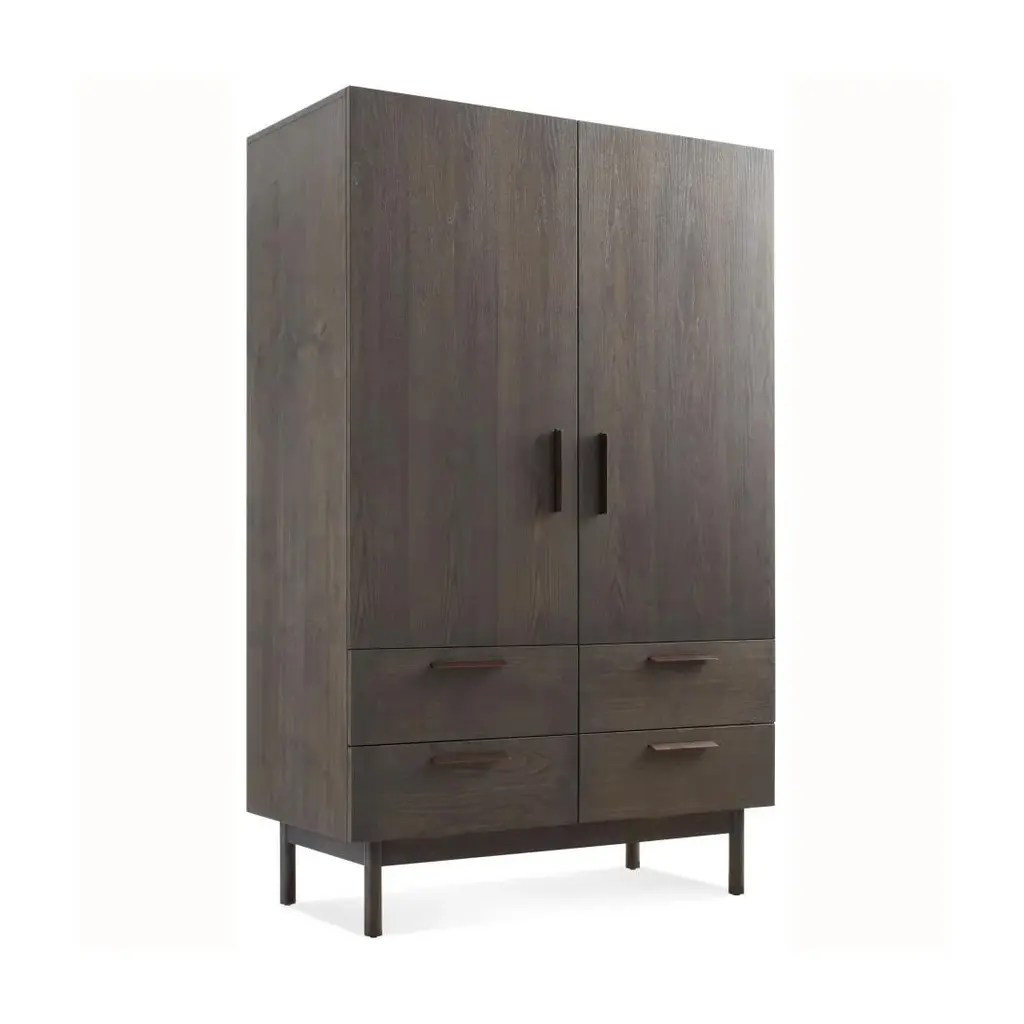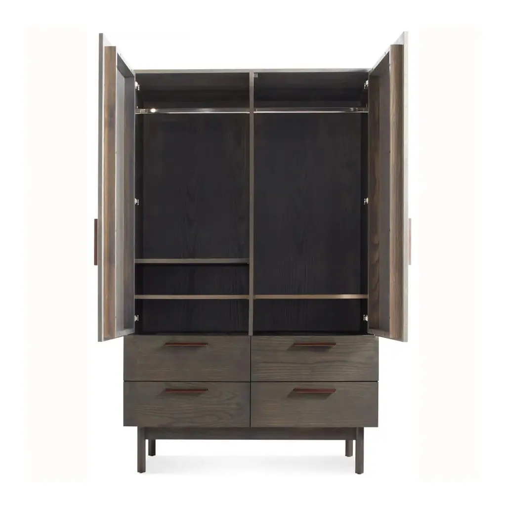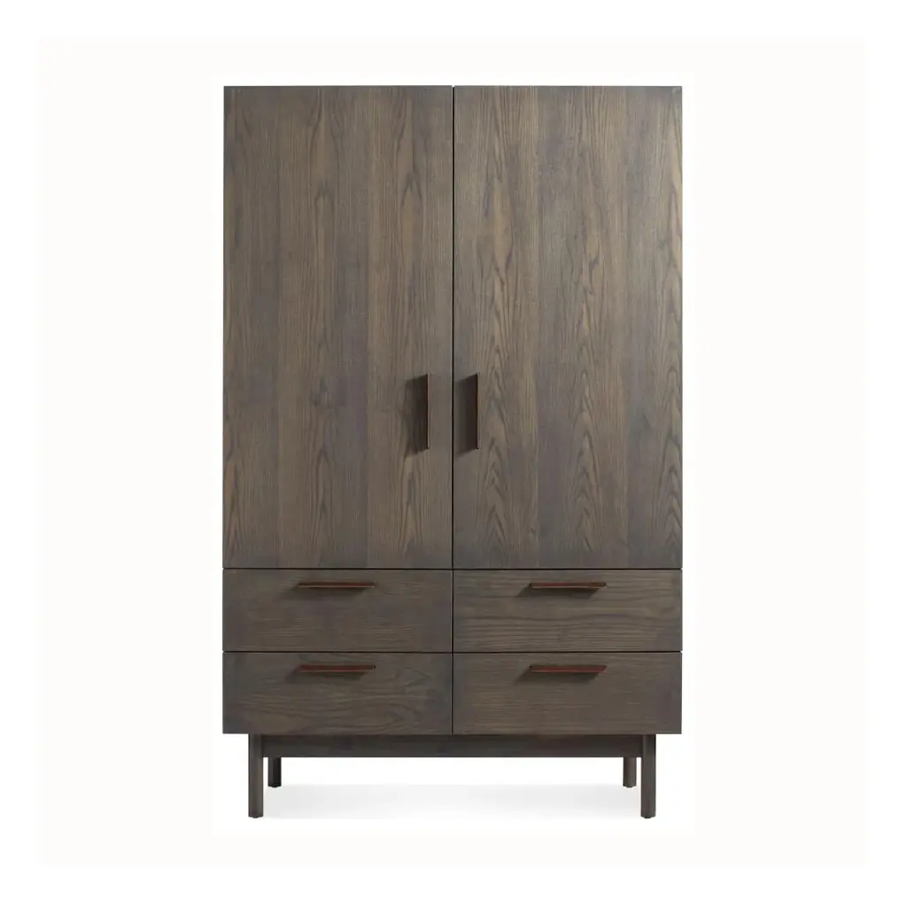 Layers of clean details. Warm wood and full grain leather pulls add storage panache and practicality to any bedroom or entryway. Cabinet interior features three adjustable shelves and a garment-hanging bar. Drawers have self-closing hardware for smooth and silent closure. Features
