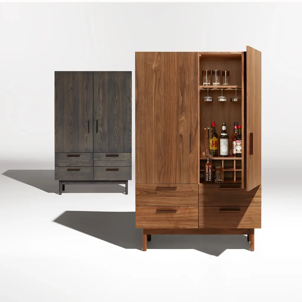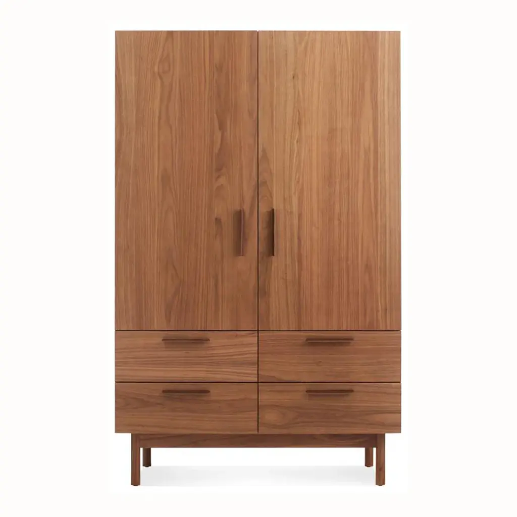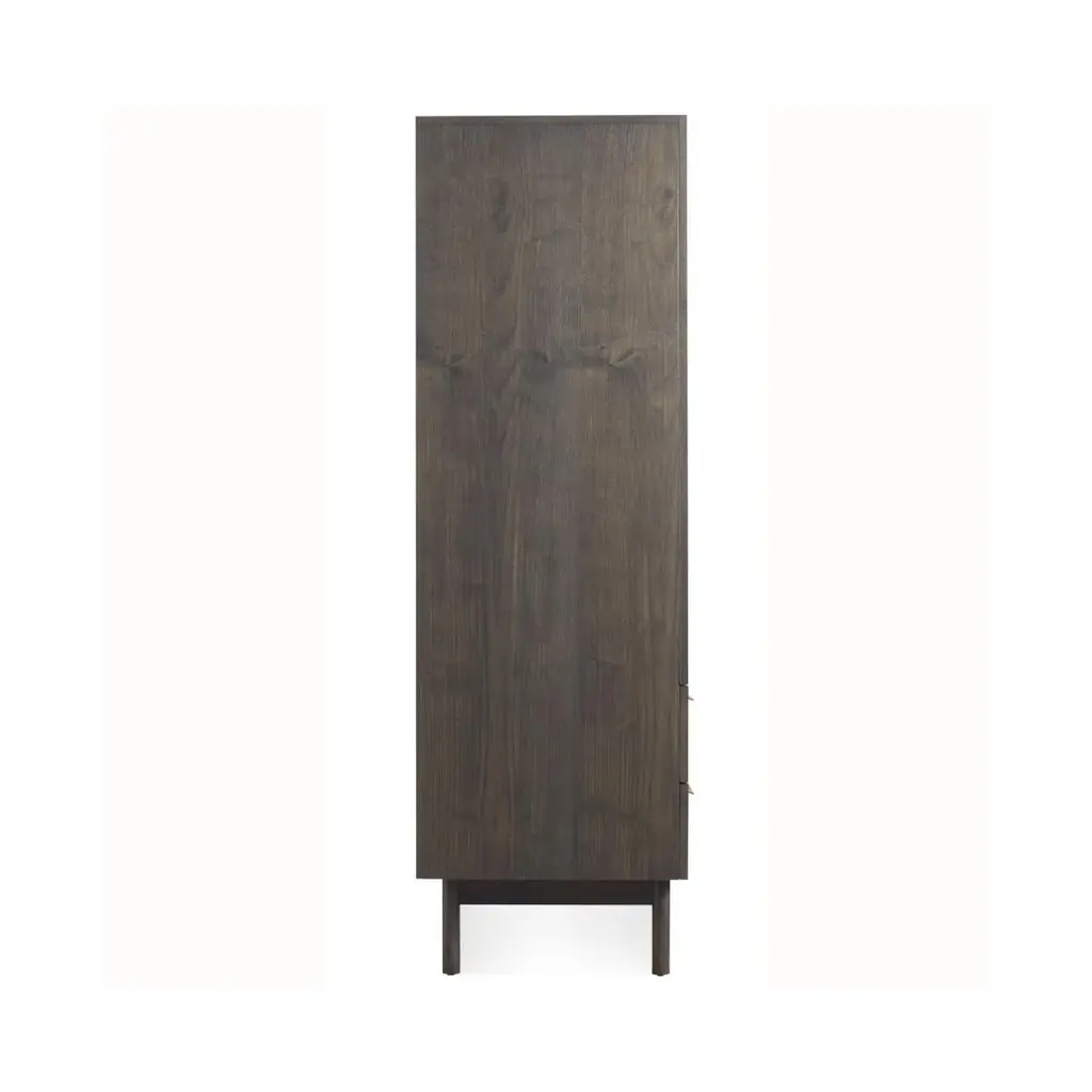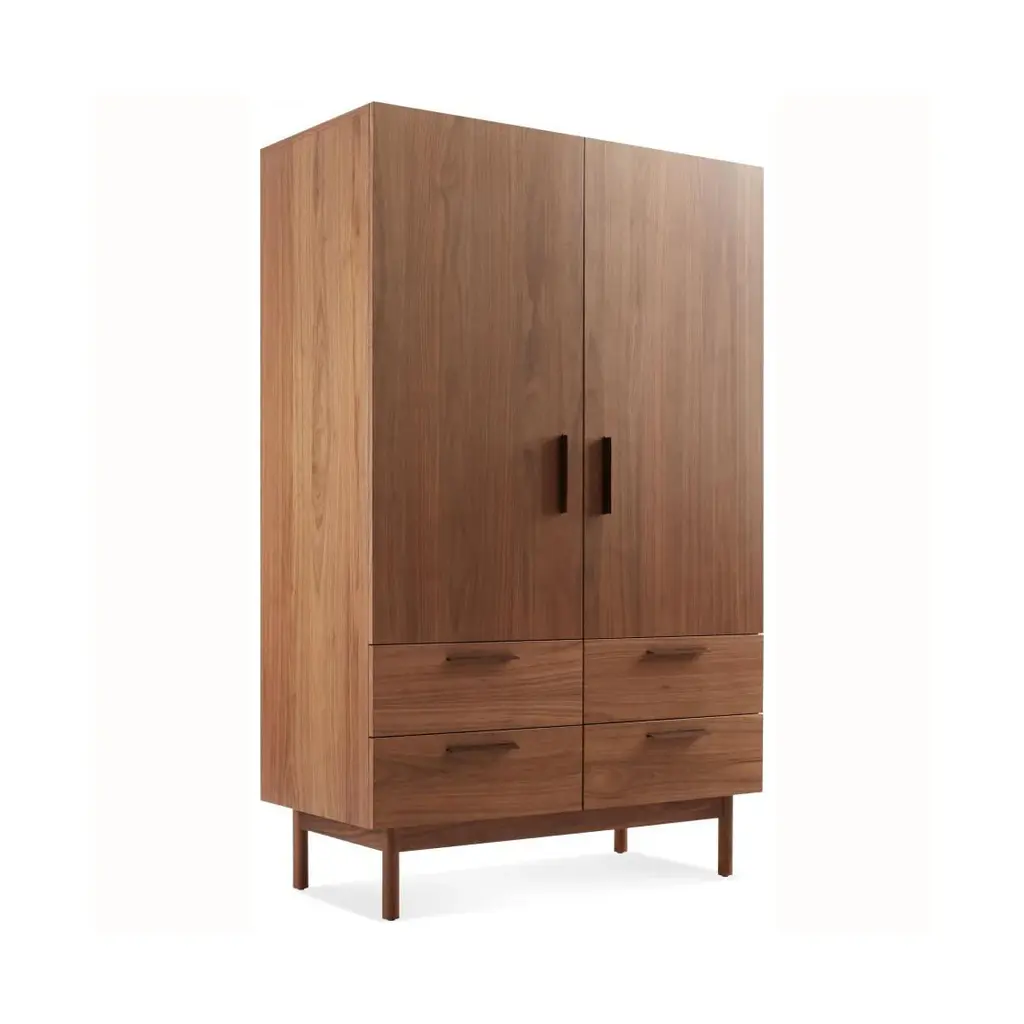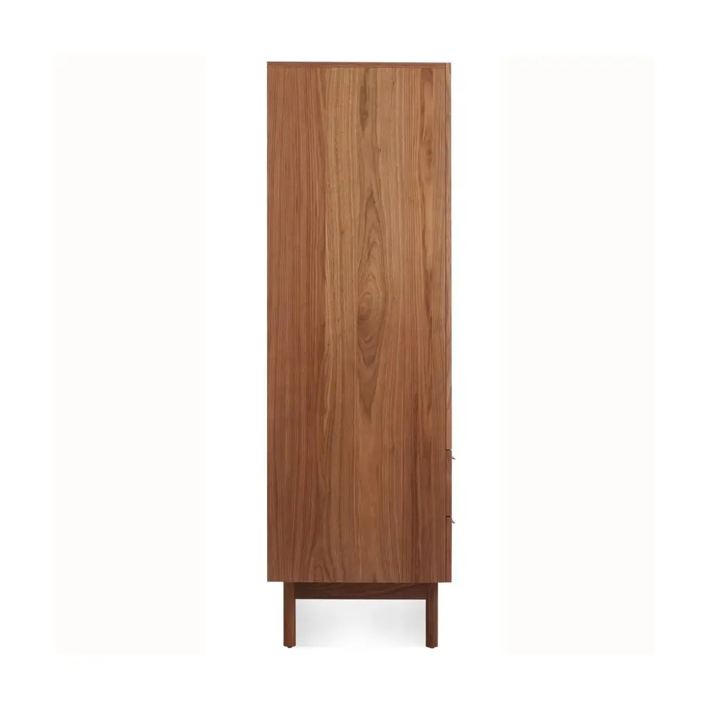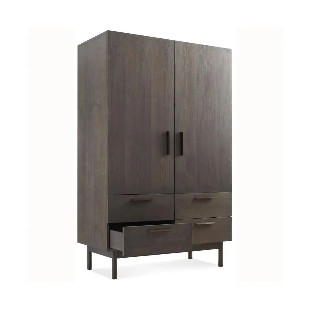 Layers of clean details. Warm wood and full grain leather pulls add storage panache and practicality to any bedroom or entryway. Cabinet interior features three adjustable shelves and a garment-hanging bar. Drawers have self-closing hardware for smooth and silent closure. Features