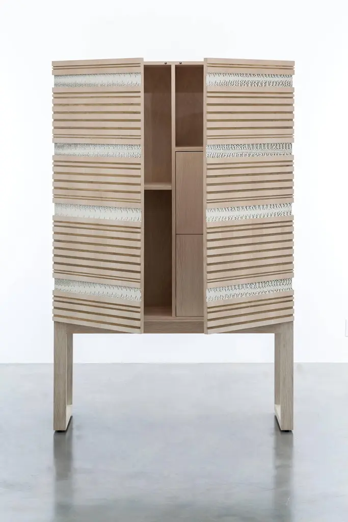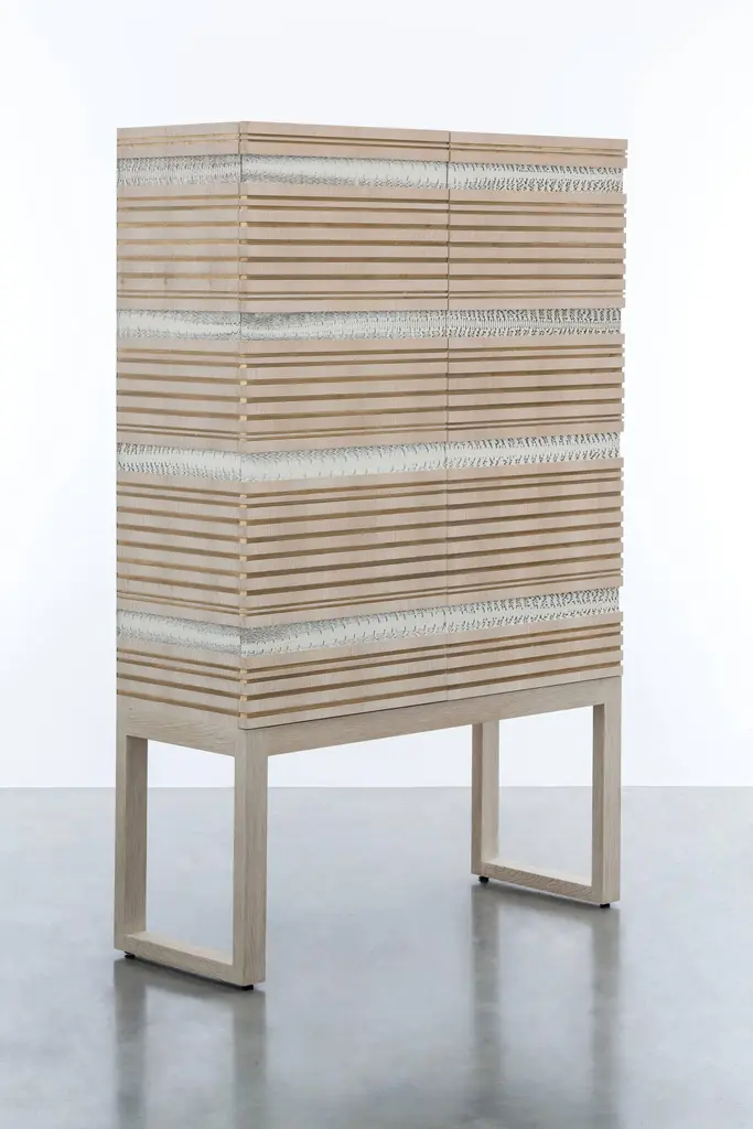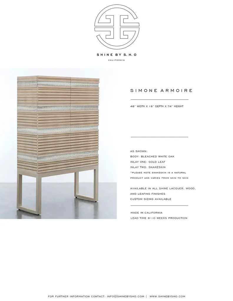 SIMONE CABINET - Modern Oak Armoire with Authentic SnakeskinThe Simone Cabinet is a modern and stylish armoire that is sure to make a statement in any room. It features a bleached white oak body with gold leaf and authentic python snakeskin inlays, adding a touch of luxury and sophistication to the design.The interior of the Simone Cabinet is fully customizable and can be tailored to meet your specific needs, whether you need a wardrobe, bar, jewelry storage, or general storage space. The standard interior comes with two drawers and adjustable shelves, providing ample space to organize your belongings.The Simone Cabinet is fully custom and made to order in California, ensuring that it's built to the highest standards of quality and craftsmanship. As shown in bleached white oak, the Simone Cabinet is priced at $25,020, making it a premium and exclusive piece of furniture. However, it starts at $20,210, allowing for greater flexibility in terms of design and budget.Overall, the Simone Cabinet is a beautiful and functional piece of furniture that combines modern design with luxurious materials. Its unique and customizable features make it a standout addition to any interior design, and its high level of craftsmanship ensures that it will last for many years to come.