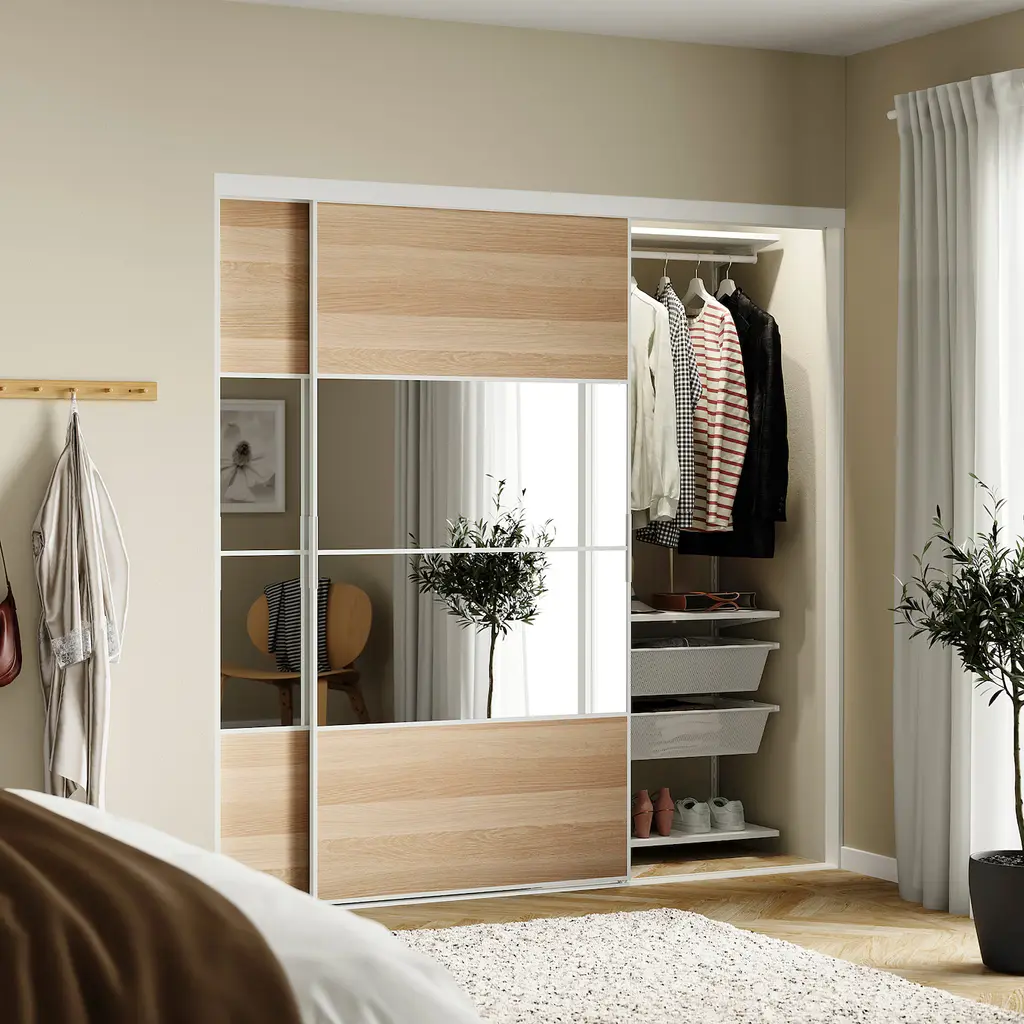 SKYTTA / BOAXEL Reach-in wardrobe with sliding door - white Mehamn/Auli/white stained oak effect mirror glass 79 1/2x25 5/8x80 1/2 ". You can always adapt or complete this open storage solution as needed. Maybe the combination we’ve suggested is perfect for you, or you can easily create your own.