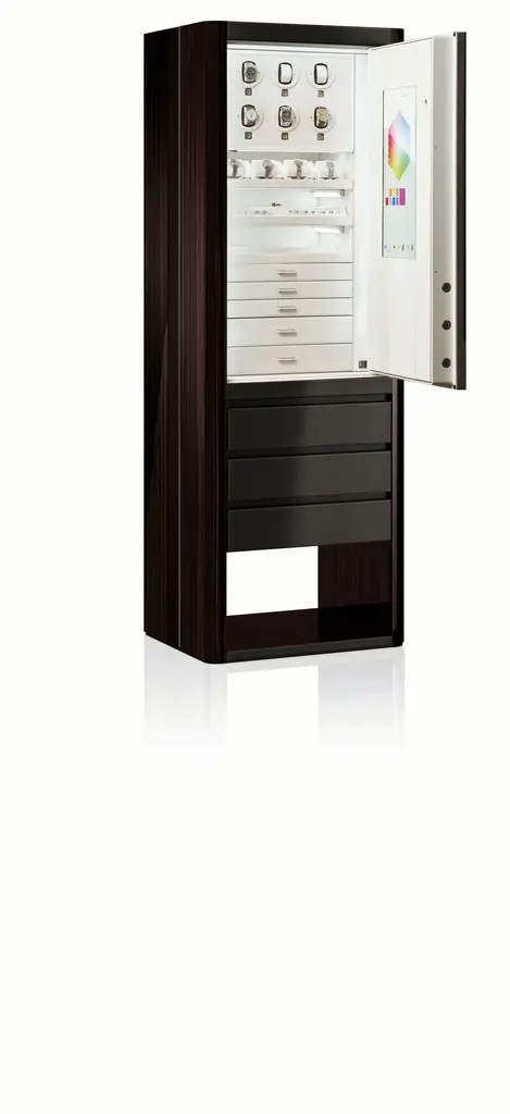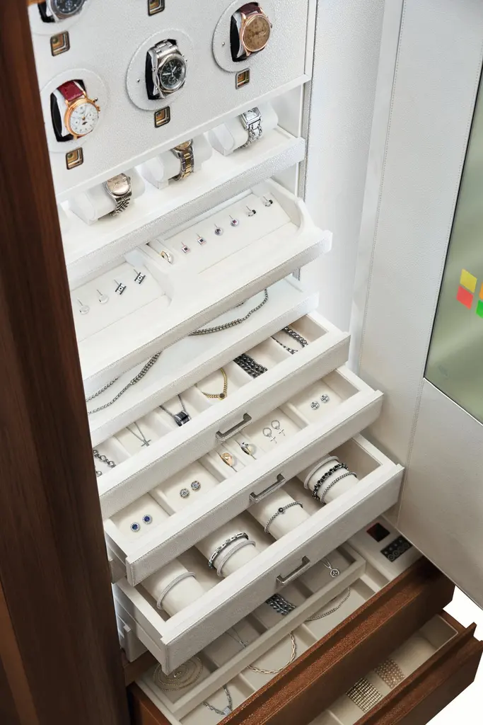 Interactive armored armoire in matte finish Canaletto walnut or polished Ebony, with emergency key. White leather interior with 6 Swiss made watch winders and secret compartment. Ruthenium accessories. - Opening with biometric device and face recognition. - Access history, different users verification. - Inside Led lights adjustable in colors. - Recorded images sent to dedicated server. - Coercion code that activates alarm messages. - Ups unit, remote control assistance.