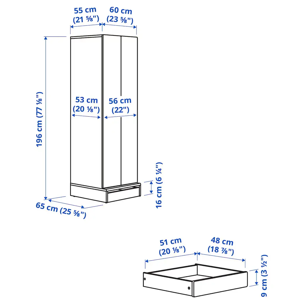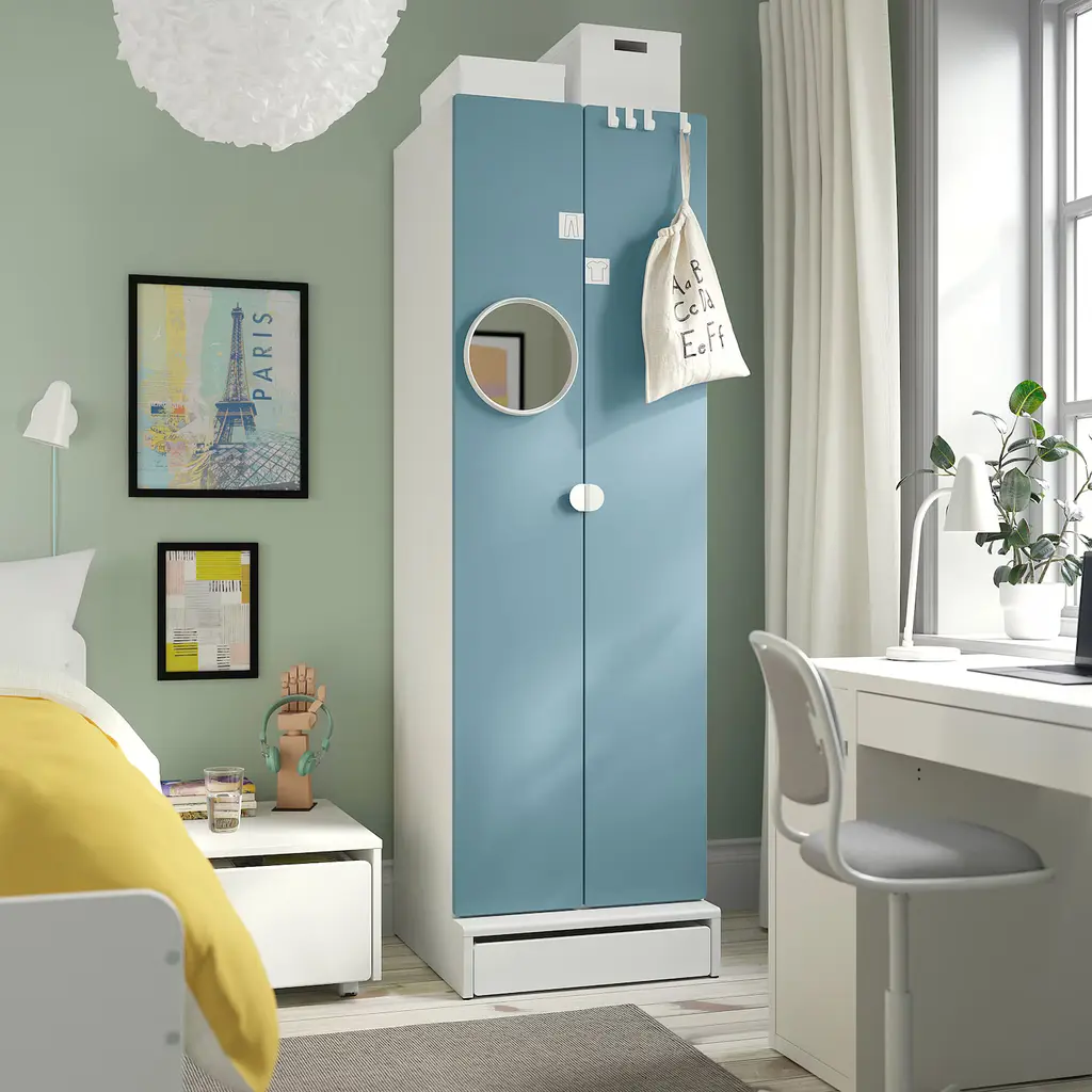 SMÅSTAD / UPPFÖRA Wardrobe - white/blue 23 5/8x25 5/8x77 1/8 ". Your child can use this wardrobe for many years since it is deep enough to hold adult-sized hangers and has an interior which you can move as your child grows. The doors have soft-closing hinges which make them close softly and quietly.