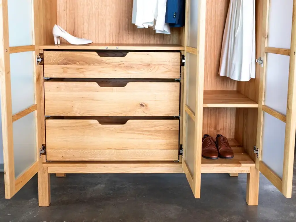Solid Wardrobe is a spacious and elegant three-door wardrobe.Despite its dimensions, it gives an airy impression and does not dominate either the bedroom or the living room. The wardrobe is entirely made of solid wood. The frame doors with satin glass filling allow the clothes to be seen, as do the three elegant, spacious pull-out solid wood drawers with brakes. The hanging section is also equipped with a solid wood bar, allowing you to comfortably hang not only shirts and blouses but also long and wide dresses. The useful height of the hanging sections is 135 and 145 cm.Available in two sizes and in the following wood types: Beech, core beech, ash, wild oak, oak, cherry, black walnut.